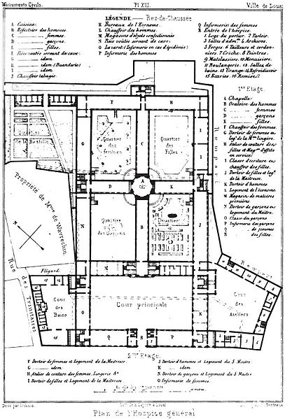 L'hôpital général de Douai a été fondé par lettres patentes en juin 1752, les biens de vingt-trois anciens établissements charitables ayant été réunis à la nouvelle institution après un arrêt du Parlement de Flandre du 16 mai 1753 autorisant la vente de leurs biens pour financer le chantier. Les plans furent dressés par l'architecte Michel-François Playez et les travaux adjugés à Georges-Joseph Durand ; la première pierre fut posée le 22 juillet 1756 par Charles-Joseph de Pollinchove. Le gros œuvre était achevé en 1761, à l'exception du corps de bâtiment destiné à fermer la cour d'honneur sur la rue. Le sculpteur Philippe Bra réalisa les armes du roi et de la ville qui ornaient alors le fronton de la façade et se trouvent aujourd'hui au fond de la cour d'honneur. En avril 1786 l'administration hospitalière obtint une ordonnance pour reprendre la campagne de travaux et fit dresser de nouveaux plans par l'architecte Voisin. Par lettres patentes de mai 1787 elle put acquérir des maisons donnant sur la rue de Canteleu pour y édifier les infirmeries ; ces maisons furent abattues en janvier 1788 et la première pierre de l'édifice des infirmeries fut posée le 6 mars 1788. Les travaux furent bientôt suspendus en raison des événements révolutionnaires et les armoiries du fronton furent brûlées en 1792 ; les travaux reprirent en 1804 et les infirmeries furent achevées en 1806. Le sculpteur Théophile Bra exécuta en haut relief l'allégorie de la Charité qui couronne l'avant-corps donnant sur la rue de Canteleu, œuvre achevée en 1835. Entre 1830 et 1839 l'architecte Mallet ajouta diverses dépendances, notamment des ateliers au sud et des bains au nord. Certaines parties de l'édifice furent fortement endommagées lors des bombardements du 11 août 1944 ; le corps de logis principal fut ensuite restitué à l'identique, tandis que les dépendances furent détruites. L'édifice, construit sur l'emplacement de la ferme des Chartriers entre les rues du Canteleu, Charles-Merlin, du Président-Wagon et l'avenue du Maréchal-Leclerc, présente un plan en croix à quatre branches — hommes, femmes, filles et garçons — avec, au centre, la cuisine nommée « salle de la tour à pains » qui reliait les quatre réfectoires et abritait deux grandes bassines à soupe sous des cheminées ; la chapelle en rotonde se trouve à l'étage au-dessus. Sous l'Ancien Régime, l'hôpital général n'eut jamais de fonction médicale mais servit de lieu de renfermement des pauvres ; conçu par des laïcs dévots, il visait à lutter contre la mendicité et les « cours des miracles », et fut rapidement perçu comme maison de correction et prison. Le 27 avril 1656 est également mentionnée la création par le pouvoir royal d'un hôpital général destiné à mettre les mendiants au travail et à « sauver leurs âmes ». Classé au titre des monuments historiques depuis le 1er avril 1946, le bâtiment a intégré le réseau de santé et a accueilli des personnes âgées dépendantes à partir des années 1980, devenant dans les années 2000 une maison de retraite médicalisée d'environ 160 places ; il a cessé d'accueillir des patients le 1er décembre 2011 et les derniers résidents ont été transférés vers une nouvelle résidence à Dechy. En janvier 2012 la communauté d'agglomération du Douaisis a acquis l'établissement pour 3,8 millions d'euros en vue d'en faire un centre d'affaires, projet qui a échoué ; l'ensemble a été revendu en 2014 à la financière Vauban pour 2,5 millions d'euros. D'importants travaux ont été lancés à partir de 2017 pour transformer le site en complexe hôtelier de luxe et en logements — 62 chambres et suites pour l'hôtel et 118 logements de petite surface —, mais ces travaux ont pris beaucoup de retard et la rue d'entrée du bâtiment reste en fort état de délabrement.