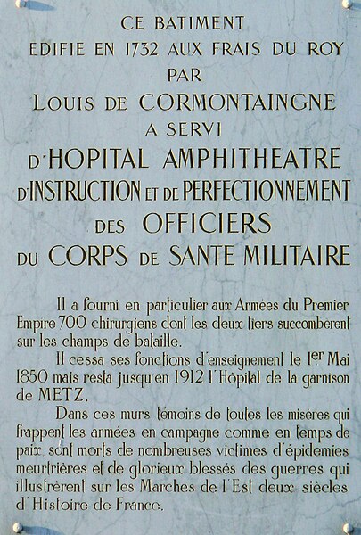 L’hôpital militaire du Fort Moselle, situé à Metz, est un établissement du XVIIIe siècle destiné à l’instruction des chirurgiens militaires, aux côtés des hôpitaux de Lille, Strasbourg et Toulon. Dans le contexte du renforcement des défenses de Metz, Vauban visita la place en 1675 et ses plans furent partiellement suivis en 1676, puis repris au début du XVIIIe siècle par son élève Louis de Cormontaigne. À cette époque, des portes et remparts médiévaux furent démolis pour laisser place à de nouveaux ouvrages, et une double couronne de fortifications fut confiée à Cormontaigne, directeur des places fortes des évêchés de 1728 à 1749 ; le fort Moselle protégeait le front de la Moselle au nord-ouest. Construit en 1732-1733 aux frais du Roi par Louis de Cormontaigne, l’hôpital était prévu pour 912 lits mais pouvait recevoir jusqu’à 2 000 malades ou blessés ; ses bâtiments formaient un quadrilatère autour d’une cour plantée d’arbres et comprenaient 11 vastes salles, évaluées pour 1 500 à 1 800 lits. L’édifice, éclairé par 194 fenêtres pour une aération optimale, servait d’hôpital amphithéâtre d’instruction et de perfectionnement des officiers du corps de santé militaire. La nuit du 4 février 1774, un incendie détruisit presque entièrement l’édifice, qui fut reconstruit d’après les anciens plans. Entre 1792 et 1815, l’hôpital fournit 700 chirurgiens aux armées de l’Empereur, dont deux tiers périrent sur les champs de bataille ; en 1813, après les campagnes de Russie et de Leipzig, le reflux de 31 000 blessés ou malades transforma l’établissement en mouroir. Entre 1814 et 1815, 7 752 militaires et 1 294 civils décédèrent, notamment du typhus. L’institution cessa ses fonctions d’enseignement le 1er mai 1850 mais resta hôpital de garnison jusqu’en 1912, date à laquelle elle fut remplacée par l’hôpital militaire Legouest. En 1946, le conseil municipal approuva la cession à la ville de plusieurs bâtiments de l’armée, dont l’hôpital du fort Moselle ; ces bâtiments furent ensuite désaffectés et sont aujourd’hui occupés par des services publics. Les portes et façades sont inscrites au titre des monuments historiques par arrêté du 17 septembre 1937, et l’édifice porte des plaques commémoratives rappelant notamment sa construction en 1732 et un poste aérien en 1870.