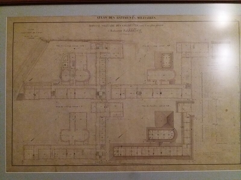 L'enceinte de l'ancien hôpital forme un îlot en terrasse délimité à l'ouest par la montée Saint-Sébastien, au sud par la rue des Fantasques, à l'est par la rue Adamoli et au nord par la rue Magneval. Le site comprend un corps de logis principal, perpendiculaire à la montée Saint-Sébastien et orienté sud-ouest/nord-est, une aile en retour parallèle à la rue Adamoli et une aile supplémentaire occupant l'angle nord entre la rue Magneval et la rue Adamoli. Une chapelle est accolée au bâtiment principal, à laquelle était autrefois adossé un bâtiment aujourd'hui disparu. Un bâtiment moderne, édifié dans les années 1980-1990, s'aligne sur l'aile donnant sur la rue Magneval. Dans la cour nord, deux bâtiments annexes surplombent les escaliers de la rue Adamoli. Sur la terrasse formant jardin, deux constructions longeaient la rue Saint-Sébastien : l'une a été démolie pour ouvrir le jardin sur la rue, l'autre, située à l'angle des rues Saint-Sébastien et des Fantasques, est l'ancienne villa du médecin-chef et abrite aujourd'hui un restaurant.
