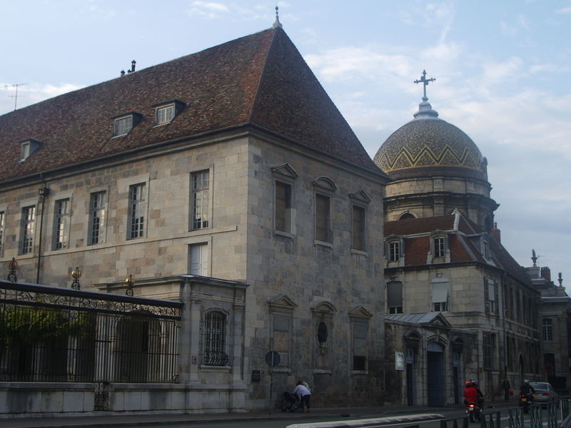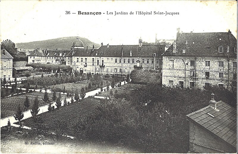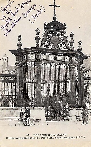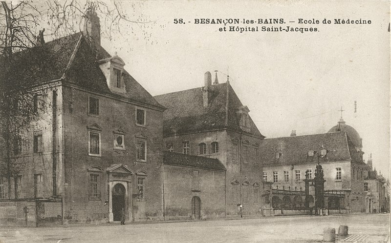 L’hôpital Saint-Jacques de Besançon est un établissement de style classique du XVIIe siècle, issu d’une fondation médiévale. En 1182, les chanoines de la collégiale Sainte-Madeleine créèrent l’hôpital Saint-Jacques-des-Arènes, d’abord doté de quatorze lits et établi sur les ruines des arènes, avec l’accord du pape Lucius III pour accueillir les pèlerins se rendant à Rome, Saint-Jacques-de-Compostelle et Jérusalem. En 1436, l’hôpital fut rattaché à l’Ordre des hospitaliers du Saint-Esprit pour le secours des pauvres, des malades et des enfants abandonnés ; au XVe siècle il était annexé à l’hôpital du Saint-Esprit de Besançon et ne comptait alors que six lits. En 1667 arrivèrent deux religieuses de l’Ordre hospitalier de Sainte-Marthe de Beaune, qui quittèrent la ville après la première conquête de la Franche-Comté ; en 1687 la communauté de Dôle envoya de nouvelles sœurs, auxquelles l’archevêque Antoine-Pierre de Grammont donna des constitutions conformes à la règle de saint Augustin, provoquant une scission et la prise du nom de Filles de Notre-Dame des Sept-Douleurs par la communauté bisontine, qui fusionna en 2024 avec les Sœurs de la charité de sainte Jeanne-Antide Thouret. En 1686, sur la demande d’Antoine-Pierre de Grammont, on entreprit la construction d’un nouvel hôpital près de l’actuelle promenade Chamars ; les travaux, conduits de 1686 à 1703, suivirent un plan en « U » et l’établissement devint hôpital général par lettre patente de Louis XIV, faisant à l’achèvement partie des plus remarquables hôpitaux du royaume. La « chapelle du couvent du Refuge », élevée au XVIIIe siècle par l’architecte Nicolas Nicole à la manière de la chapelle du Collège des Quatre-Nations, accueillait initialement de jeunes femmes en difficulté. L’hôpital possède une apothicairerie parmi les plus remarquables, enrichie d’une collection de faïences des XVIIe et XVIIIe siècles constituée vers 1680 par l’apothicaire Gabriel Gascon. La grille en fer forgé réalisée par le serrurier Nicolas Chappuis en 1703 a été remplacée par une copie, l’original étant conservé à la Citadelle ; au-dessus de la porte figure une inscription latine tirée du psaume X,14. Une niche entre la grille et la porte abrite le buste en bronze d’Anne Biget (sœur Marthe), décorée par plusieurs souverains pour son dévouement envers les malades et les prisonniers, et la cour d’honneur est ornée d’une grande statue en pierre de saint Jacques datant du XVIIIe siècle. À la fin du XIXe siècle, les jardins de l’hôpital étaient principalement destinés à la culture potagère. Dans la première moitié du XXe siècle, l’ingénieur André Walter élabora de nouvelles techniques d’éclairage et d’antisepsie qui furent mises en œuvre en 1959 dans un bloc opératoire aménagé sur deux niveaux dans l’ancienne salle commune ; ce dispositif comprenait une demi-coupole elliptique réfléchissante, éclairée par un projecteur orientable, et percée de hublots permettant d’installer des observateurs à l’extérieur de la salle ; aujourd’hui désaffecté, ce bloc abrite le Muséum d’Anesthésie et des Techniques médico-chirurgicales. L’ensemble du site bénéficie de protections au titre des monuments historiques : l’hôpital, à l’exception des parties classées, est inscrit depuis le 27 décembre 1938 ; les façades et toitures donnant sur la cour d’honneur, la chapelle ainsi que les façades curvilignes et toitures des deux bâtiments adjacents sont classées depuis le 16 juin 1970 ; le bloc opératoire Saint-Joseph a été inscrit par arrêté le 23 avril 2012. Hôpital public faisant partie du Centre hospitalier régional universitaire (CHRU) de Besançon, Saint-Jacques regroupait des services et structures autour de la place Saint-Jacques ; une vaste opération de transfert vers le site de Châteaufarine, en extension de l’hôpital Jean-Minjoz, a eu lieu fin 2012. Propriétaire de l’ensemble immobilier, le CHU a cédé les bâtiments du centre-ville en 2024, tandis que certains services restent pour l’instant en centre-ville — hospitalisations de psychiatrie, médecine légale, explorations du sommeil, Centre d’Investigation Clinique et accueil adolescent — avec la vocation qu’ils rejoignent à terme le site principal Jean-Minjoz.