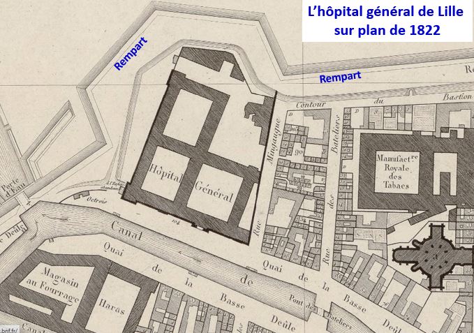 Situé à l'extrémité nord‑ouest de l'agrandissement de Lille de 1670, sa façade principale bordait le quai de la Basse-Deûle, près de la porte d'eau où la voie d'eau franchissait le rempart ; la Basse-Deûle fut jusqu'au XIXe siècle un port fluvial. L'hospice était longé à l'arrière par une rigole intérieure au rempart et sa façade a été étendue vers le sud en absorbant la rue Mingauge, alors insalubre. La portion de canal devant l'hospice, comblée en 1953, a laissé place à l'avenue du Peuple-Belge bordée d'arbres qui masque la façade, à l'exception du portail d'entrée resté dégagé.
