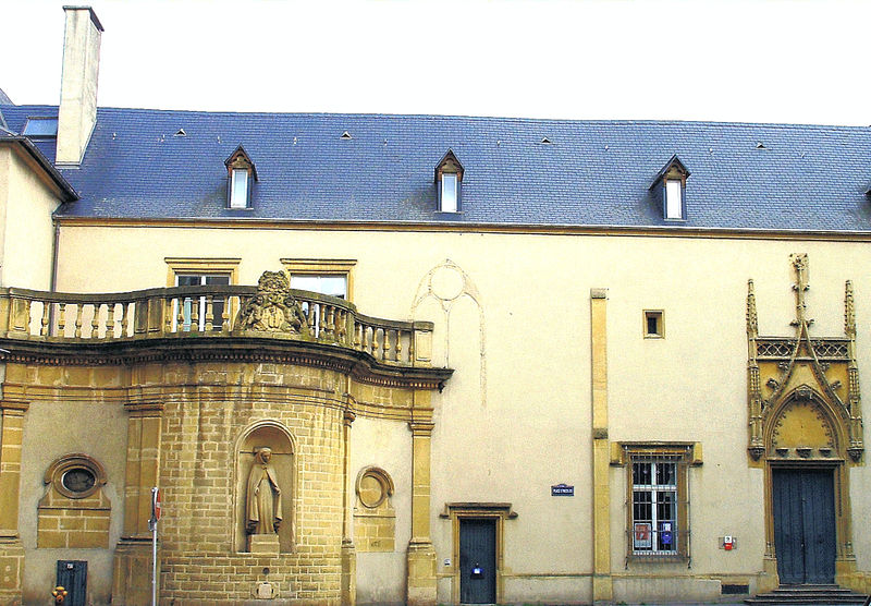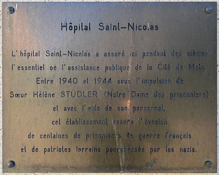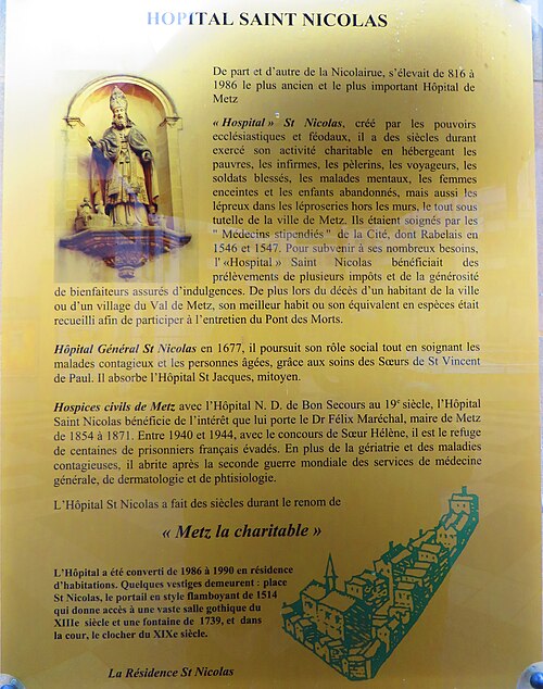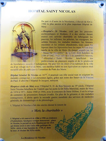 L'ancien hospice Saint-Nicolas est le plus ancien hôpital de Metz, attesté dès le XIe siècle ; les bâtiments actuels datent du XIIIe au XIXe siècle. Il a fermé en 1986 ; au début du XXe siècle une partie servait de centre d'examen d'apprentissage et une autre abrita une agence de Pôle emploi (ANPE) jusqu'en 2009. La fontaine monumentale de 1739 est inscrite au titre des monuments historiques depuis le 3 novembre 1929. Le portail de 1514, la façade sud sur cour de l'aile en retour d'angle (XVIe siècle), l'escalier d'angle et le sol de la cour sont inscrits depuis le 5 avril 1993.