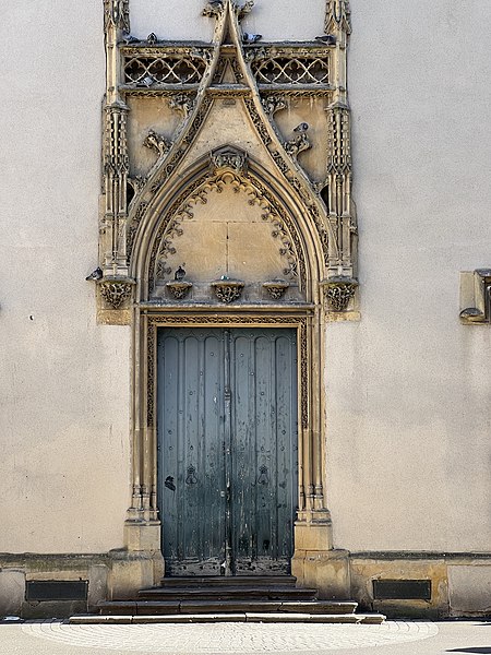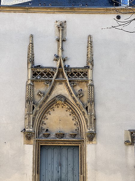 Sur le plan architectural, le portail gothique flamboyant est l'élément le plus remarquable : son tympan a été exécuté en 1514 par l'architecte messin Clausse de Ranconval et restauré au XIXe siècle, ce qui explique son bon état de conservation. Une niche du portail accueille une statue de saint Nicolas sculptée par Charles Pètre, actuellement en cours de restauration. Le tympan constitue l'un des rares témoignages tardifs de l'usage du gothique flamboyant à Metz, comparable au couronnement de la tour de la Mutte de la cathédrale. La fontaine du XVIIIe siècle et le portail demeurent les témoins les plus visibles de l'histoire de l'hospice.