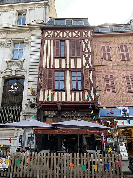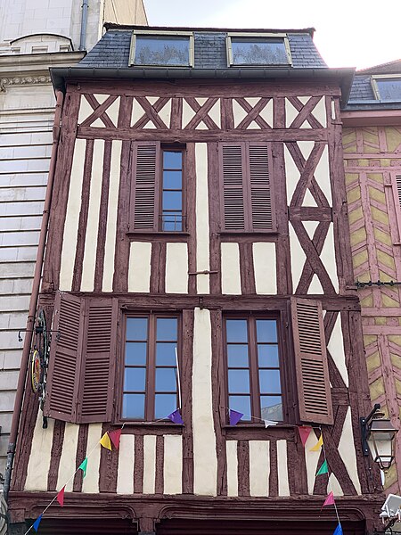 La façade sur cour en pan de bois portant trois fenêtres en bois sculpté (une au rez-de-chaussée, une au premier étage, la troisième en lucarne au deuxième étage) et un poteau également en bois sculpté : classement par décret du 12 février 1924