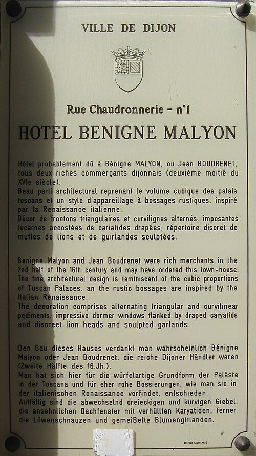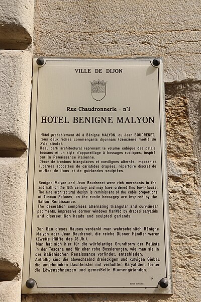 L'hôtel Bénigne Malyon est un hôtel particulier situé dans le secteur sauvegardé de Dijon (Côte-d'Or). Ses façades sur rue et sa toiture sont classées au titre des monuments historiques depuis 1943. Une plaque d'information trilingue (français, anglais, allemand) y a été apposée. Des ressources et références, notamment la base Mérimée et des documents sur Wikimedia Commons, permettent d'approfondir sa connaissance.