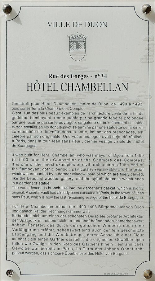 L'hôtel Chambellan, également dénommé hôtel des ambassadeurs d'Angleterre, est un hôtel particulier gothique flamboyant situé aux 34-36 rue des Forges, dans le secteur sauvegardé de Dijon (Côte-d'Or). L'édifice bénéficie d'un double classement au titre des monuments historiques : l'hôtel depuis 1913 et sa chapelle depuis 1917. Henri Chambellan, riche drapier devenu vicomte-majeur de Dijon puis conseiller à la chambre des comptes, transforma l'ancienne demeure en une résidence luxueuse. L'accès se fait par une porte à droite du bâtiment du 34-36 rue des Forges, dont la façade a été remaniée au XIXe siècle ; cette porte ouvre sur un long couloir qui débouche dans la cour intérieure. À droite, une aile en pierre de taille, percée de fenêtres à meneaux de style gothique flamboyant, est surmontée d'une haute lucarne en pierre qui forme deux niveaux en interrompant la gouttière du toit. À l'extrémité de ce corps de bâtiment se dresse une tour abritant un escalier à vis ajouré, aboutissant à une terrasse entourée d'un garde-corps. À l'intérieur, l'escalier de pierre est couvert, au sommet, par des voûtes d'ogives dont liernes et tiercerons semblent jaillir de la hotte portée par un personnage sculpté surnommé à Dijon « le jardinier ». À gauche de la tour s'étend une galerie en bois à deux niveaux, elle aussi de style gothique flamboyant. Propriété de la ville de Dijon de 1913 à 2008, l'hôtel fut vendu cette année-là à un propriétaire privé, Philippe Bernard, acquéreur par ailleurs d'autres immeubles historiques dijonnais comme la Maison des Cariatides et la Maison Millière. Resté fermé au public, sauf lors des Journées du patrimoine, il a fait l'objet en 2018 d'une réfection accompagnée de l'installation d'un commerce. Une galerie photographique illustre la tourelle d'escalier et la lucarne, un chapiteau en haut de l'escalier extérieur ainsi qu'une plaque d'information trilingue (français, anglais, allemand).