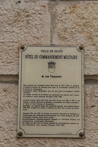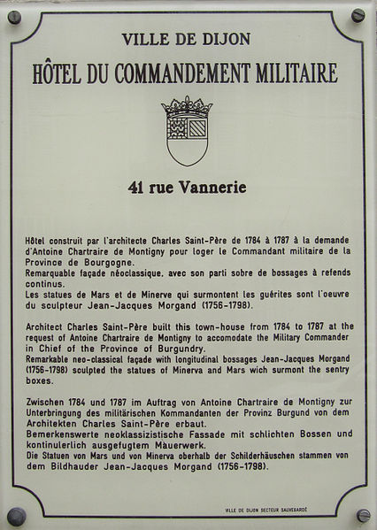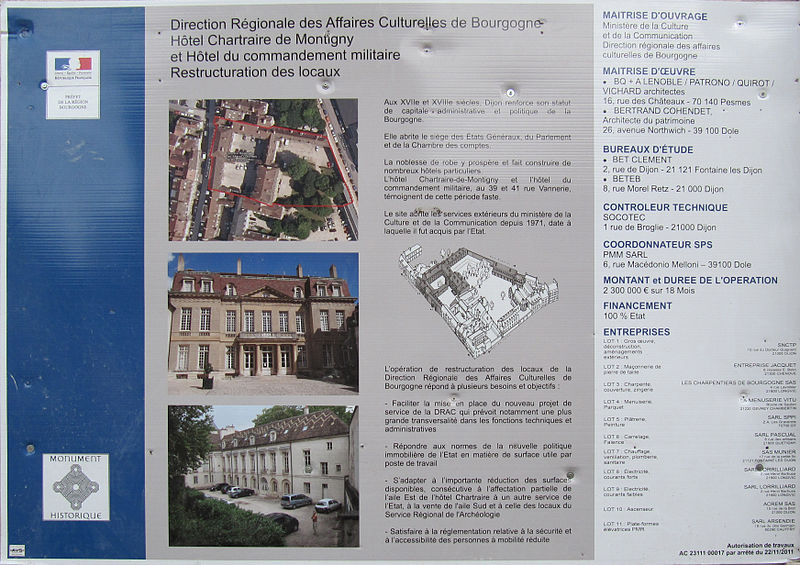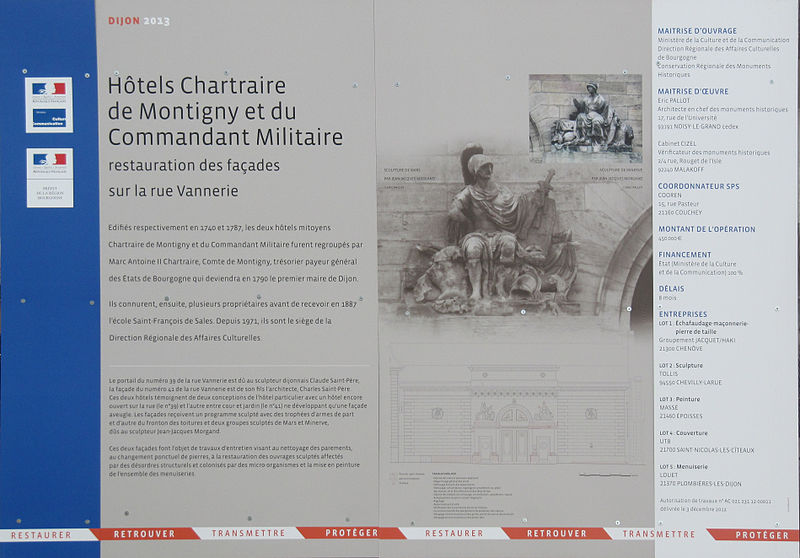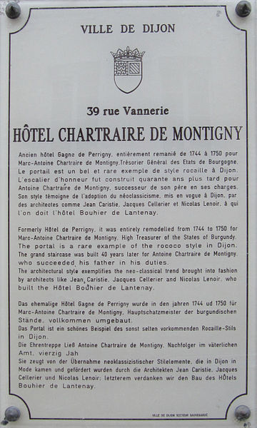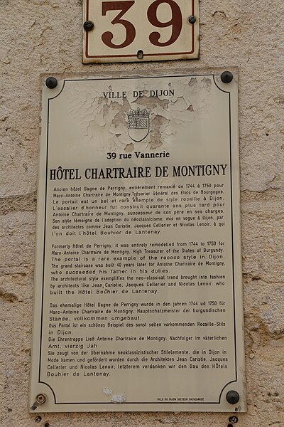 L'hôtel Chartraire de Montigny est un hôtel particulier situé au 39, rue Vannerie à Dijon (Côte-d'Or) et accueille la Direction régionale des affaires culturelles de Bourgogne. Le bâtiment primitif fut édifié vers 1670 par Gagne de Perrigny. En 1740, Marc-Antoine Chartraire de Montigny l'acheta et le fit entièrement remanier entre 1744 et 1750 ; les sculptures du portail, marquées par le style rocaille (coquille en imposte entourée de palmes, d'épis et de sarments), sont l'œuvre de Claude Saint-Père. Quarante ans plus tard, son fils Antoine fit construire l'escalier d'honneur, monument néoclassique plafonné en trompe-l'œil, avec des boiseries probablement attribuables à Jérôme Marlet ; son architecture reflète l'influence des architectes Jean-Antoine Caristie, Jacques Cellerier et Nicolas Lenoir. En 1783, Antoine acquit l'hôtel voisin, alors loué au commandant militaire, et le fit rebâtir ; la façade sur rue date de 1787 et est due à Charles Saint-Père. La Révolution interrompit les transformations : en 1792 les deux hôtels furent à nouveau séparés et vendus, et Antoine Chartraire connut des poursuites, des détentions et des libérations avant de mourir le 10 messidor (29 juin 1795). Après la vente de 1792, l'hôtel passa entre diverses mains ; le général Bonaparte y fit une halte le 7 mai 1800. La famille de Nansouty acquit l'hôtel en 1803, puis il fut vendu à la fin du Second Empire et transformé en pensionnat. En 1882, l'abbé Christian de Bretenières, dont la famille possédait l'hôtel du Commandant militaire depuis 1792, acheta l'ensemble et y installa des classes de l'école privée Saint-Ignace, devenue par la suite école Saint-François-de-Sales, puis une école secondaire en 1887 ; il réunira encore des bâtiments en 1888. Pour adapter les lieux à la vie scolaire, on démolit des dépendances, aménagea des cours de récréation, construisit en 1890 un préau à colonnettes de fonte et, entre 1890 et 1894, l'architecte diocésain Charles Suisse fit édifier un bâtiment destiné à des salles de fêtes, des cours et des dortoirs après le percement de la rue du Lycée. En 1971, les hôtels furent acquis par l'État pour les services extérieurs du Ministère des Affaires culturelles, qui devinrent en 1977 la DRAC ; dès 1972 des travaux supprimèrent les équipements scolaires pour aménager des bureaux et, à partir de 1979, le grand escalier fit l'objet de restaurations permettant l'installation des services culturels. Les deux hôtels, réunis et transformés à diverses étapes de leur histoire, font l'objet d'un classement au titre des monuments historiques depuis novembre 1995. Une galerie photographique présente la façade, le portail, le heurtoir, divers détails et la plaque d'information trilingue. Les principales sources sont le panneau d'information devant l'hôtel et les études publiées dans l'inventaire général.