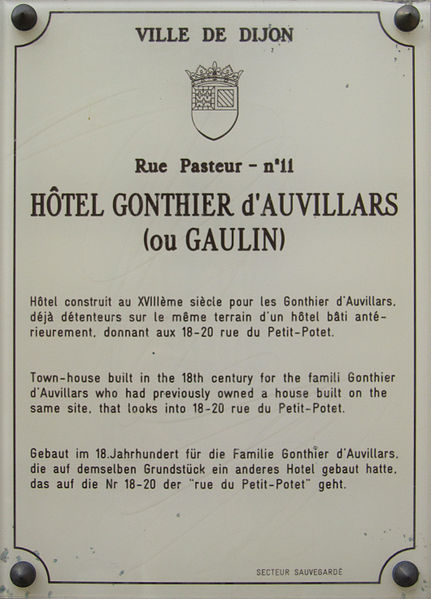 L'Hôtel Gonthier d'Auvillars, aussi appelé hôtel Gaulin, est un hôtel particulier situé au 11 rue Pasteur à Dijon, dans le secteur sauvegardé de la ville. Il a été construit au XVIIIe siècle pour la famille Gonthier d'Auvillars. Cette famille possédait par ailleurs, sur le même terrain, un autre hôtel particulier donnant sur les 18-20 rue du Petit Potet. La porte monumentale et ses vantaux sont inscrits au titre des monuments historiques par arrêté du 24 avril 1929. Une plaque d'information trilingue (français, anglais, allemand) est apposée sur le site. Des ressources en ligne, notamment la base Mérimée et plusieurs portails consacrés à l'architecture, à Dijon et aux monuments historiques, offrent des informations complémentaires.