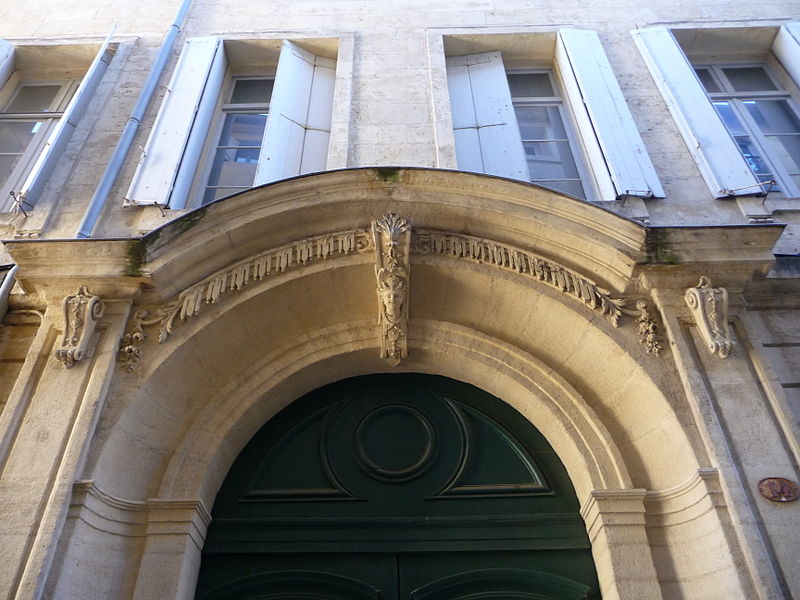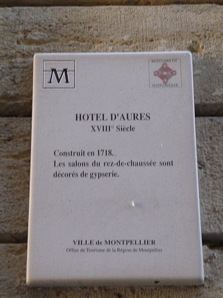 L'hôtel d'Aurès est un hôtel particulier du XVIIIe siècle situé au 14 rue Eugène-Lisbonne à Montpellier, dans l'Hérault. La démolition et la reconstruction de l'immeuble ont été autorisées en 1718 par les Grands-Voyers; le décor intérieur date de la période 1763-1780. La parcelle forme un quadrilatère et s'ouvre, en fond de terrain, sur une cour précédée d'un vestibule couvert d'un plafond en coupole ovale largement percé de grands arcs en anse de panier. La façade sur rue s'ouvre par un portail en plein cintre, dont l'entrée est ébrasée en niche entre deux pilastres ornés de tableaux et surmontée d'un entablement à fronton circulaire; la clé de l'arc est sculptée d'une tête et d'une coquille. L'archivolte porte un motif se terminant latéralement par une chute florale; de part et d'autre du portail, les murs présentent des refends et des fenêtres cintrées dont les clefs sculptées en consoles droites reprennent la tête et la coquille. Les façades sur cour sont rythmiques de pilastres; la porte centrale de la façade sud ouvre sur un escalier en vis et s'orne de pilastres nus portant de petites consoles décorées de perles et de chutes de feuilles. La clef de l'arc de cette porte représente une tête de femme qui supporte un grand vase godronné débordant d'un bouquet, encadré de guirlandes accrochées à des volutes; l'imposte en fer forgé présente un décor symétrique de volutes en C entrecroisées. À l'intérieur, deux pièces du rez-de-chaussée ont conservé leur décor de 1763 : un petit salon entièrement lambrissé et un ancien boudoir remarquable pour ses plafonds cintrés ornés de gypseries.