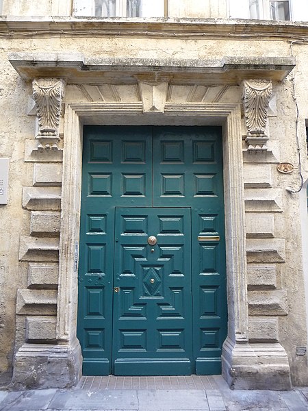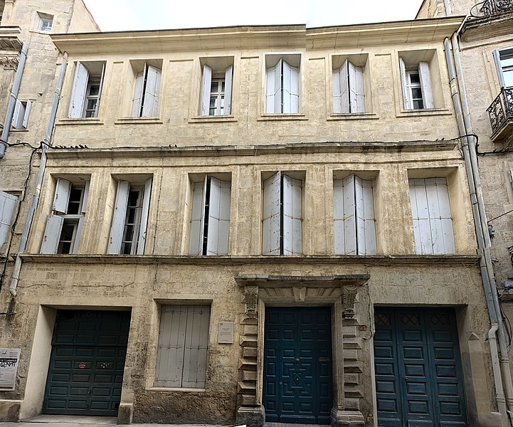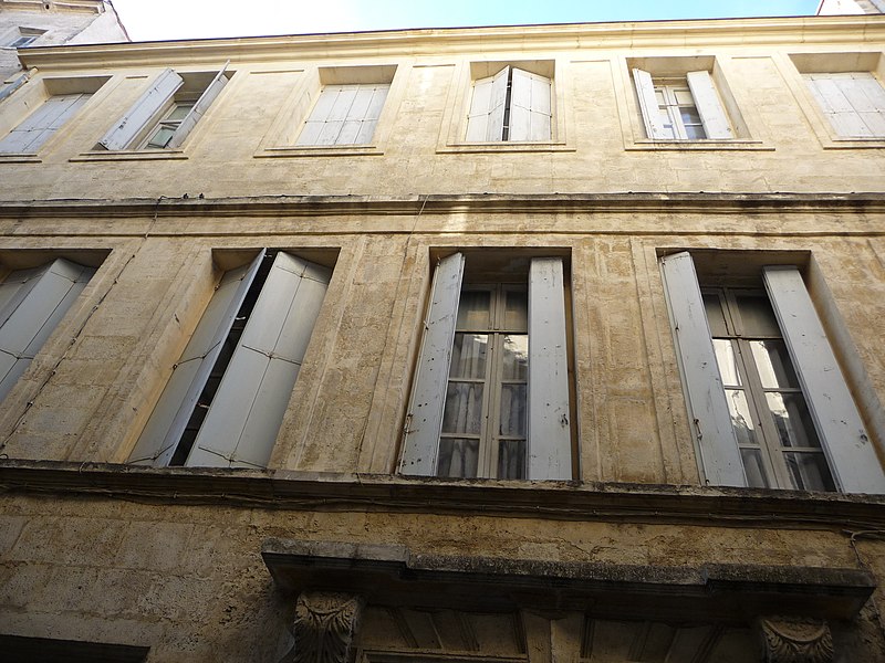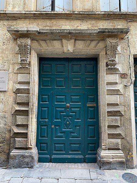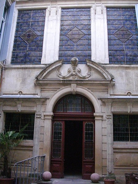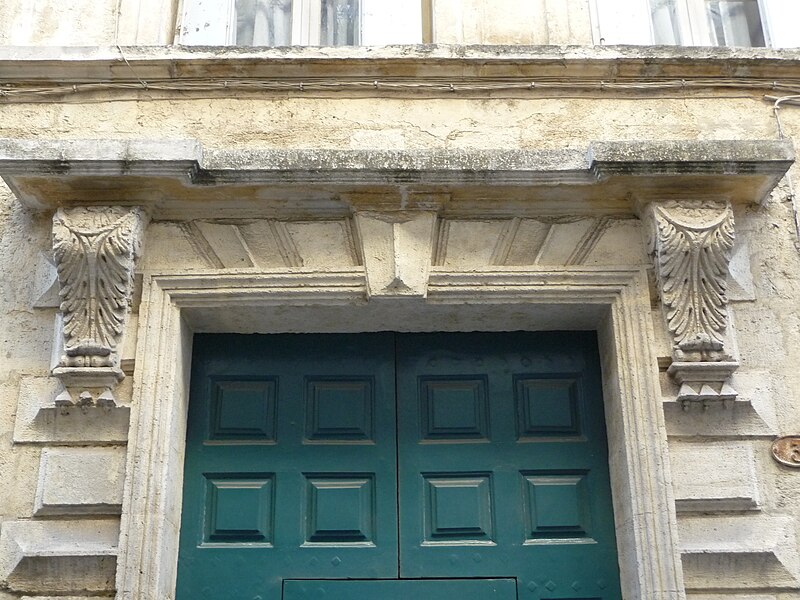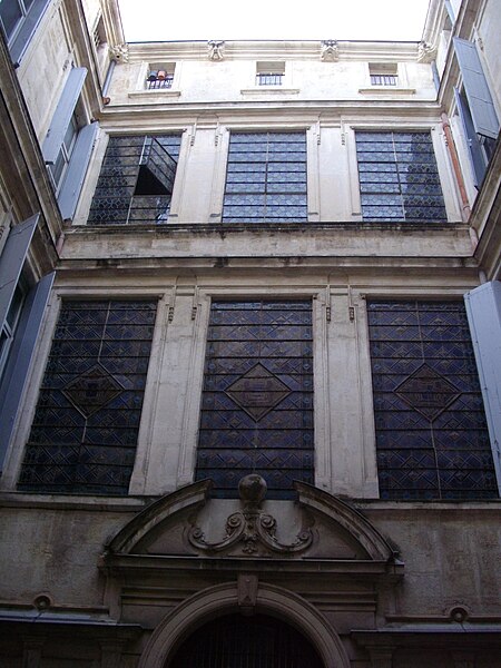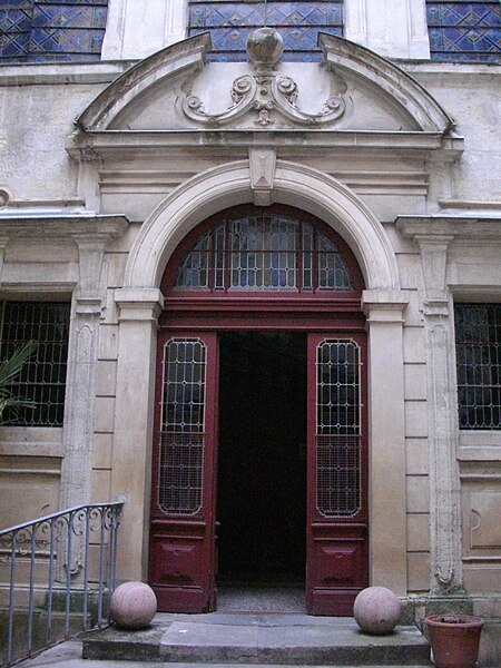 L'accès se fait par un grand porche qui met en relation la rue, la cour intérieure et la cage d'escalier. Le porche s'ouvre par un portique composé de deux groupes de colonnes doriques géminées ; aux extrémités, des colonnes engagées, partiellement tronquées, reposent sur des coquilles. Dans la cour, un péristyle de colonnes ioniques supporte un entablement surmonté, au niveau du premier étage, d'une fausse balustrade en pierre à balustres carrés engagés.