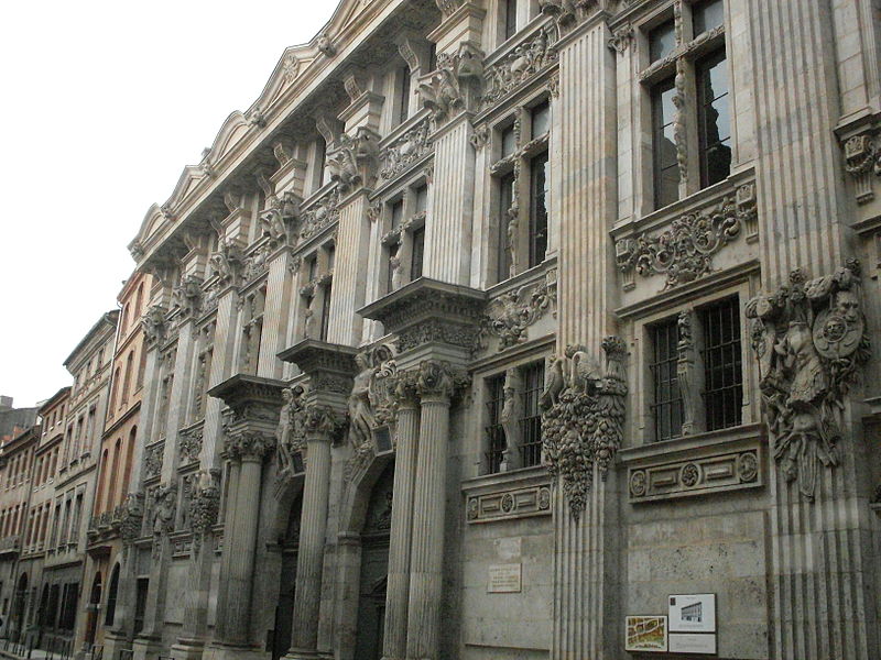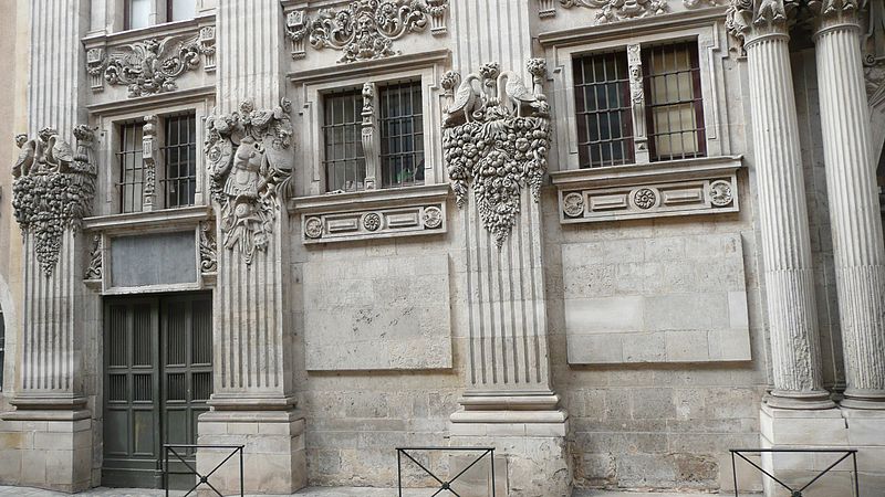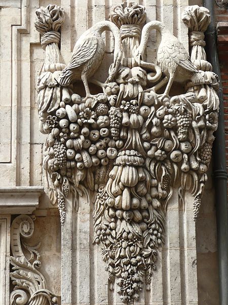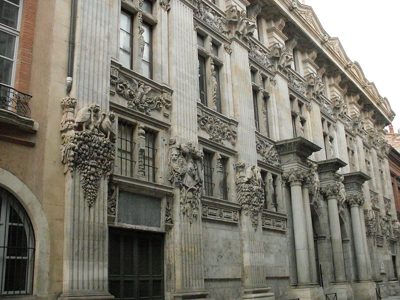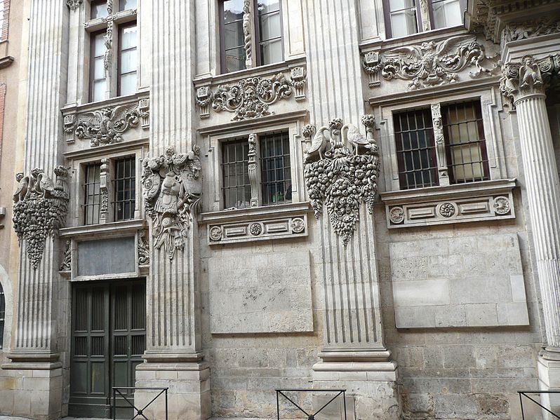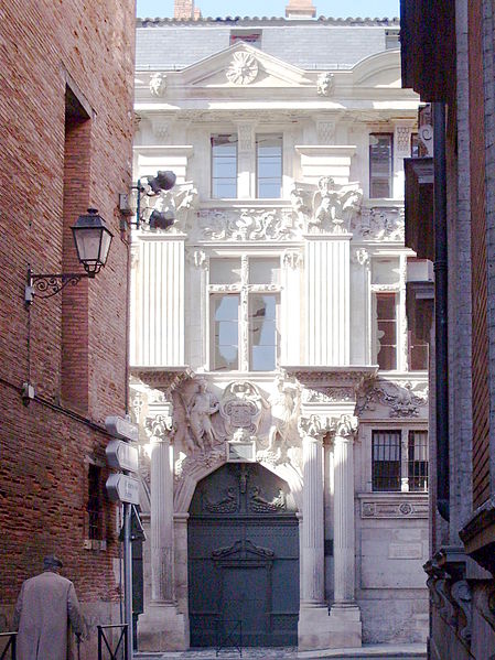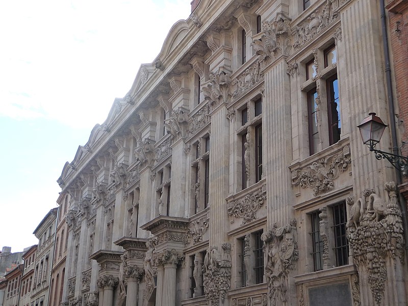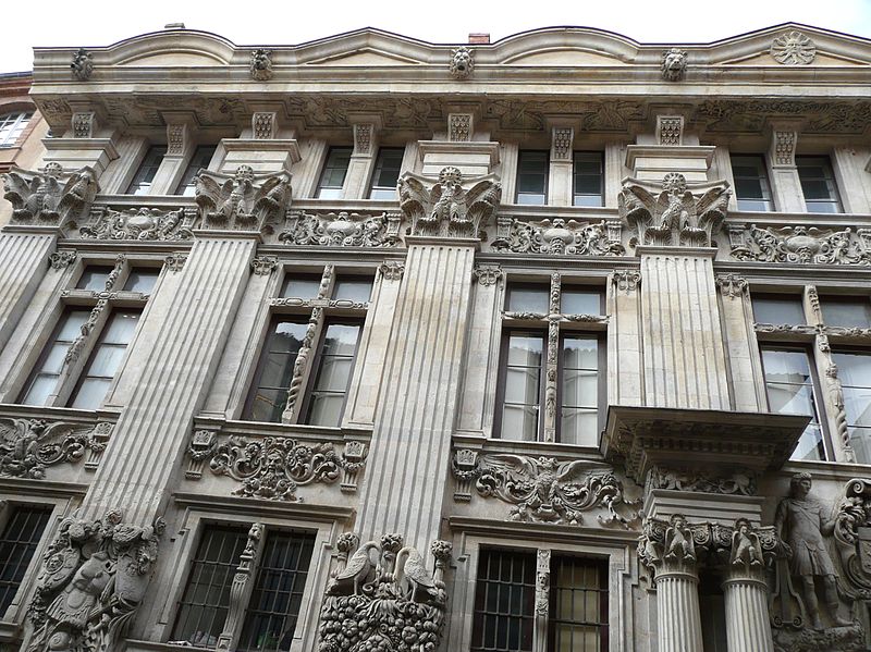 Dans la cour, Nicolas Bachelier met en œuvre une originalité dans le traitement des baies en les concevant comme de petits temples antiques : les fenêtres présentent une représentation progressive de l'ordre dorique sur les niveaux, avec triglyphes et corniches qui renforcent la monumentalité des ouvertures. La porte dite « aux Atlantes », attribuée à la campagne de Bachelier mais dont la datation fait encore l'objet de débats, s'ouvre sur une cage d'escalier à rampe droite ; cet escalier droit figure parmi les premiers exemples de ce type à Toulouse, marquant la diffusion de l'ordre dorique dans l'architecture locale. L'intérieur conserve des plafonds peints, une grande cheminée monumentale dont la partie inférieure remonte à la campagne de 1538 attribuée à Nicolas Bachelier et Antoine Lescalle, et la partie supérieure, réalisée au début du XVIIe siècle, est dominée par la figure de Pomone entourée de putti et de deux vieillards identifiés comme Vertumne. Un décor de sculptures en terre cuite provenant de la manufacture de Gaston Virebent orne également certaines pièces. Cet hôtel demeure un exemple majeur de l'adoption des formes de la Renaissance à Toulouse et de l'évolution des techniques et du décor architectural au tournant des XVIe et XVIIe siècles.