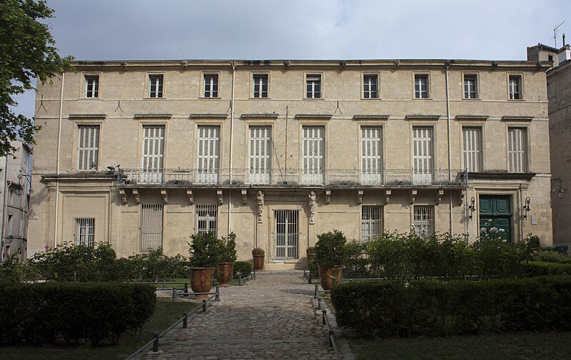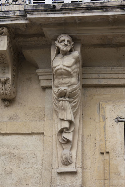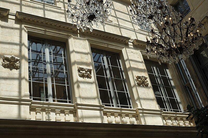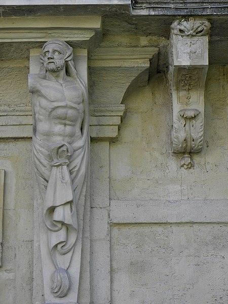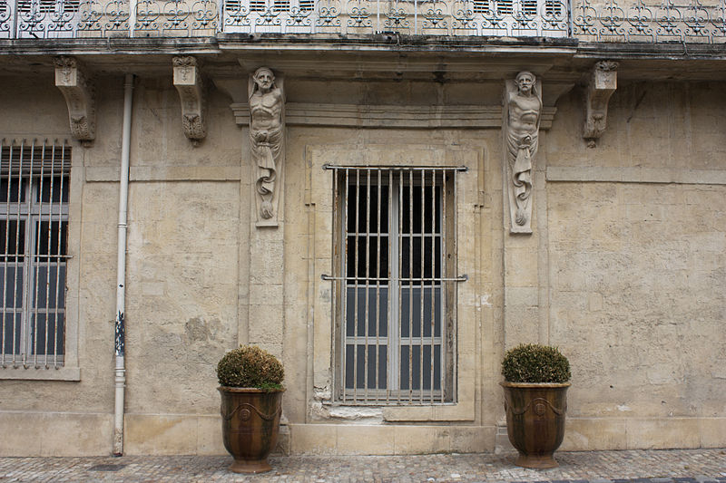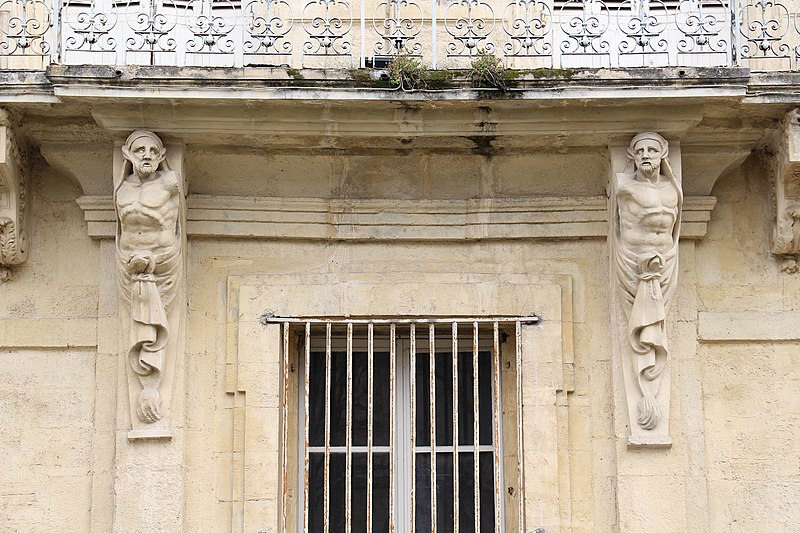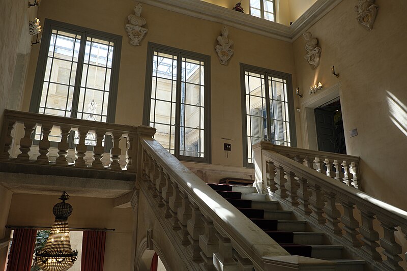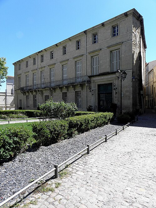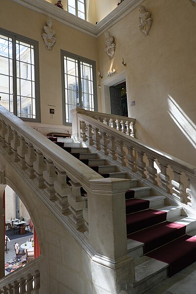 La façade principale s'ouvre sur la place par un portail flanqué de pilastres nus et coiffé d'une frise et d'un entablement ; l'imposte, séparée par un pilastre cannelé, est ornée de deux tableaux octogonaux et repose sur un boudin sculpté. Au premier étage, sept fenêtres sont traitées en portes-fenêtres et reliées par un grand balcon soutenu par des consoles sculptées d'acanthes ; au centre, ce balcon présente un encorbellement soutenu par deux termes vêtus de linges. Toutes les baies du premier étage sont abritées sous un entablement droit à modillons et la corniche supérieure est décorée de masques et de têtes de lions.