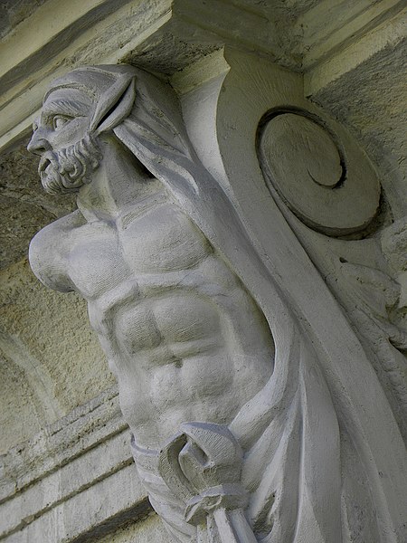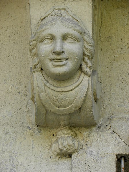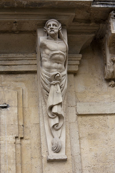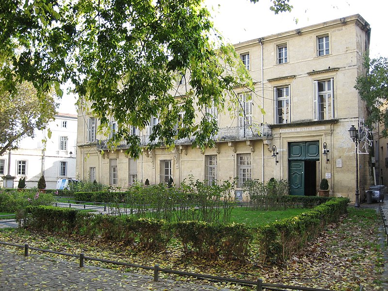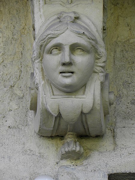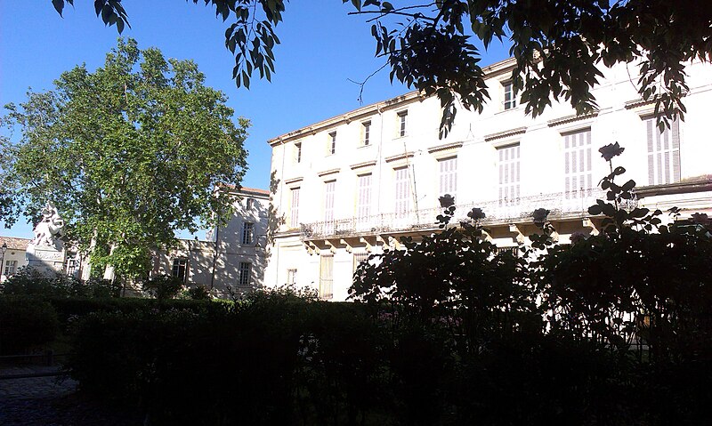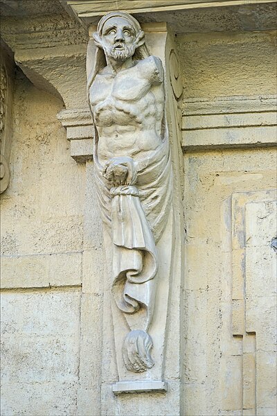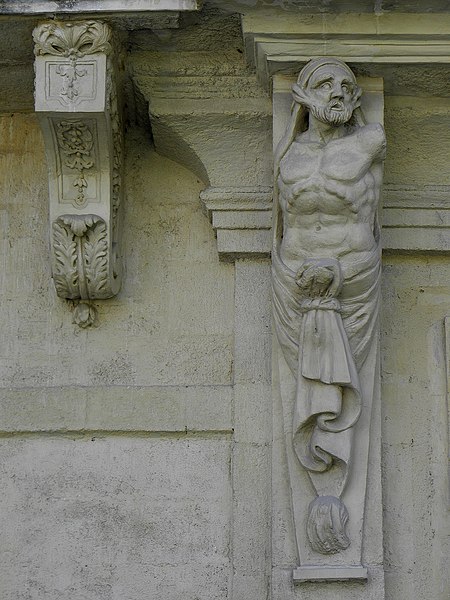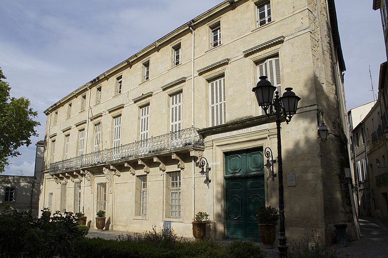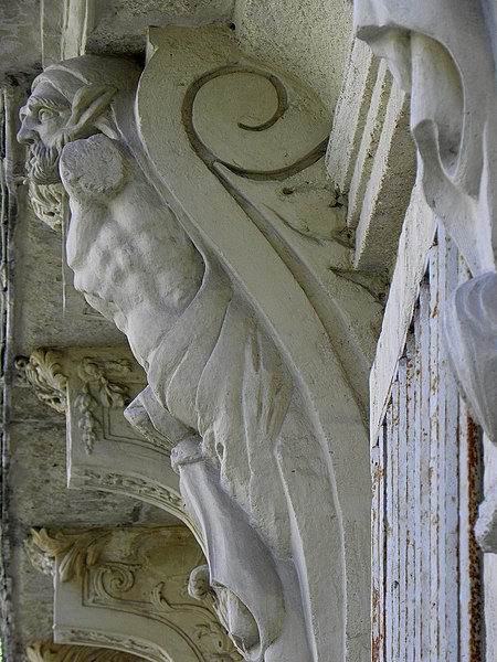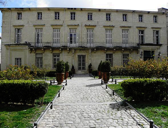 La façade principale s'ouvre sur la place par un portail flanqué de pilastres nus et coiffé d'une frise et d'un entablement ; l'imposte, séparée par un pilastre cannelé, est ornée de deux tableaux octogonaux et repose sur un boudin sculpté. Au premier étage, sept fenêtres sont traitées en portes-fenêtres et reliées par un grand balcon soutenu par des consoles sculptées d'acanthes ; au centre, ce balcon présente un encorbellement soutenu par deux termes vêtus de linges. Toutes les baies du premier étage sont abritées sous un entablement droit à modillons et la corniche supérieure est décorée de masques et de têtes de lions.
