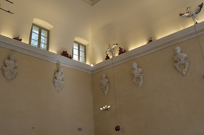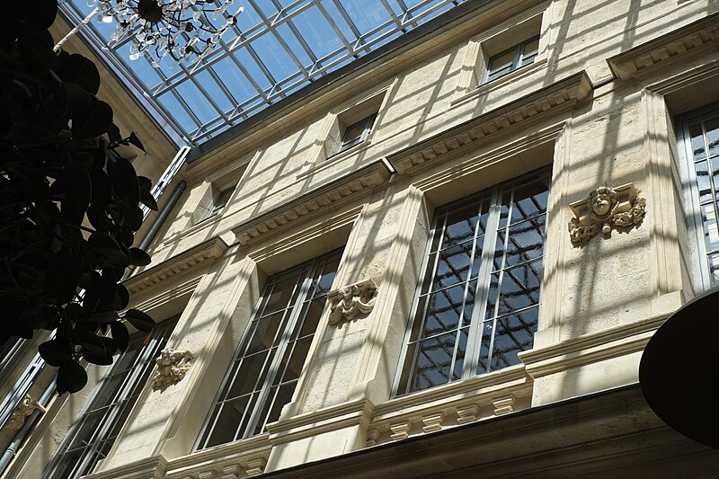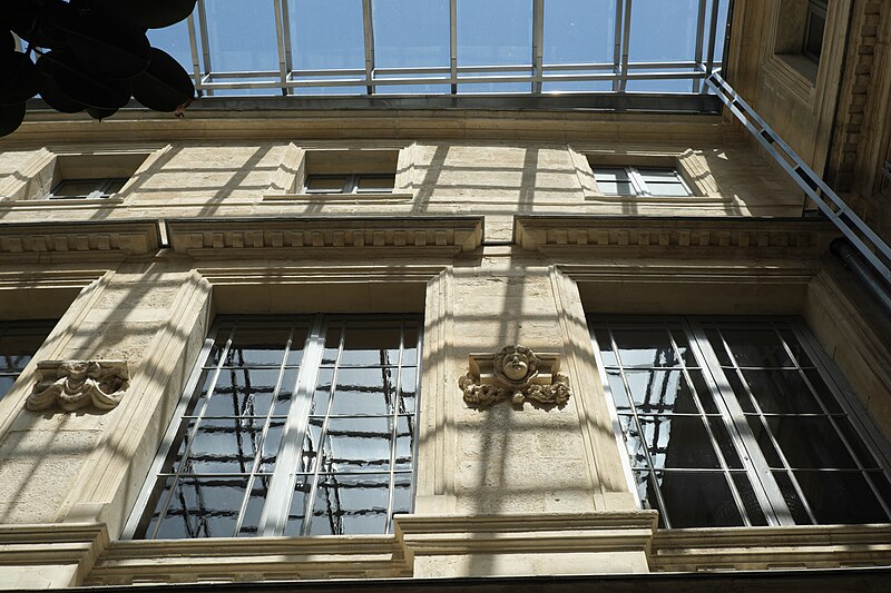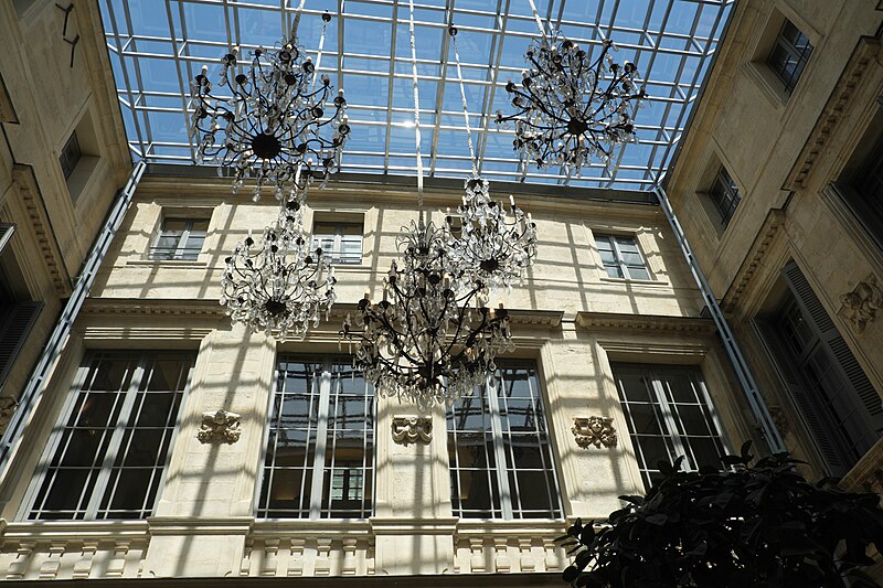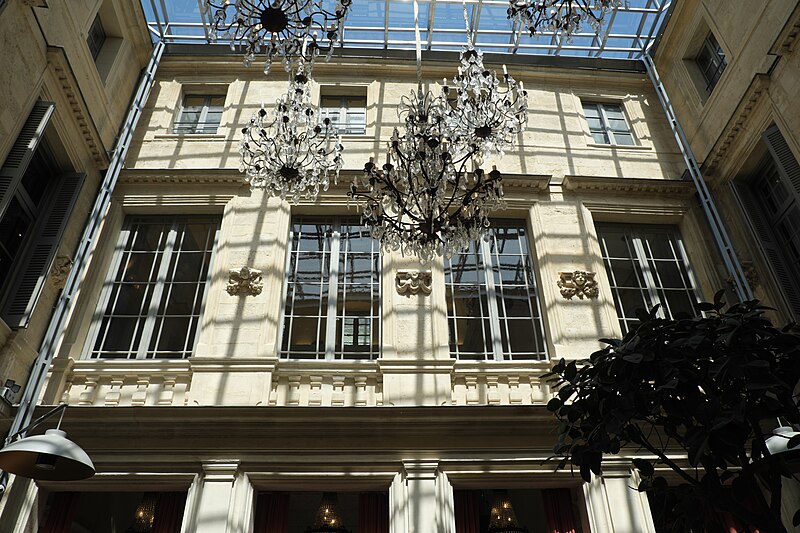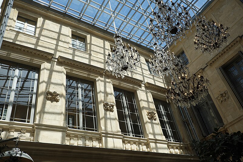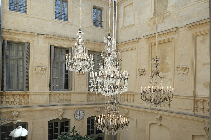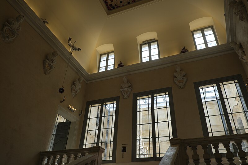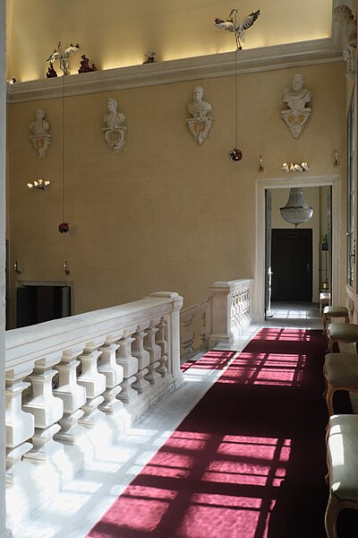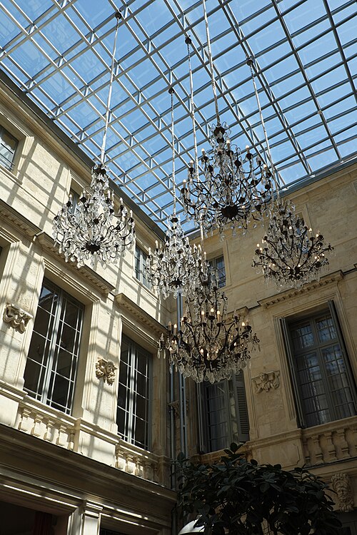 L'intérieur conserve des décors remarquables : une salle voûtée en berceau porte au sommet un grand tableau encadré de motifs en stuc et entouré de guirlandes tenues par des anges, tandis que les naissances de la voûte conservent des peintures à fresque et que des sujets en bas-relief occupent les angles. L'ancienne salle des mariages du premier étage présente des parois couvertes de gypseries et des portes à vantaux de style Louis XV. Divers décors sculptés et peints, attribués à des artistes comme Jean de Troy et plusieurs sculpteurs, témoignent d'interventions d'époques différentes.