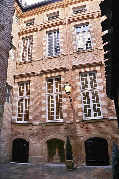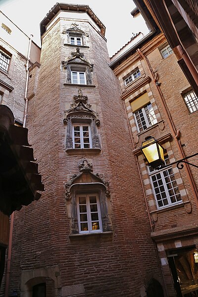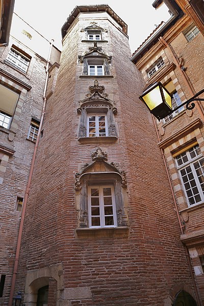 L'hôtel de Bonnefoy, situé 19 rue Croix‑Baragnon à Toulouse, a été construit par Bérenguier Bonnafède (ou Bonnefoy), capitoul en 1513, sur la base d'un édifice plus ancien. La cour conserve une tour polygonale en briques abritant un escalier à vis et ornée d'un décor qui marque la transition entre le gothique et la Renaissance ; ce décor est daté autour de 1513‑1514. Des traces de baies géminées outrepassées, mises au jour lors d'une restauration au début du XXe siècle, témoignent d'éléments antérieurs remontant au XIVe siècle. La façade sur rue rassemble des apports de plusieurs périodes : des vestiges médiévaux, des remaniements probables du début du XVIe siècle et des reprises aux XVIIe et XVIIIe siècles. Deux inscriptions latines sur des clés d'arc confirment des campagnes de travaux au XVIIIe siècle : FIXA POLO REQUIES 1729 sur la clef de l'arcade donnant sur la rue et UNI SUSPIRO 1730 sur la clé de la porte ouvrant sur la cour. Dans la tour, les fenêtres à encadrement de pierre mouluré sont surmontées d'arcs en accolade et de tympans sculptés portants des emblèmes religieux — hostie, monogramme IHS, figures divines et un mouton qui renvoie au nom de Bonnefoy. Le quatrième tympan présente un buste d'homme, peut‑être le Père éternel, le troisième porte le monogramme IHS et la salutation Ave Maria, et le deuxième montre un lion soutenant un blason pouvant évoquer le mouton des armes de Bonnefoy. Le tympan de la première fenêtre a été martelé, sans doute à la Révolution, et certains modillons reproduisent des bustes féminins dans le goût de la première Renaissance. Le rez‑de‑chaussée est voûté d'ogives ; une salle conserve deux croisées d'ogives séparées par un arc doubleau, dont les culots sculptés de monstres et de visages grotesques sont peut‑être liés au décor de l'escalier du XVIe siècle. L'élévation sur rue, divisée en travées irrégulières et couronnée d'une corniche moulurée, présente au premier et au deuxième étage des fenêtres segmentaires résultant de campagnes de reprises. Au Moyen Âge, le site dépendait d'une maison à façade sur la rue Tolosane qui, en 1477, appartenait au changeur Bertrand de La Jugie ; par dot, l'immeuble entra ensuite dans le patrimoine de la famille Bonnefoy. Bérenguier Bonnefoy fit édifier son hôtel et sa tour en 1513 ; la propriété passa par héritages et ventes aux familles Bonnefoy, Labat et Lacaze, avec des séparations de corps de bâtiments aux XVIIe et XVIIIe siècles. Jean‑Jacques Lacaze de Rochebrun, capitoul en 1729‑1730, fit apposer son blason sur un tympan de la tour et grava sa devise « Uni suspiro » sur la porte du corridor. La tour capitulaire a été inscrite aux monuments historiques en 1950. En 1957, l'hôtel fut acquis par Roger Amalric, qui entreprit une restauration récompensée en 1975 par une médaille des Toulousains ; l'édifice est resté dans cette famille.