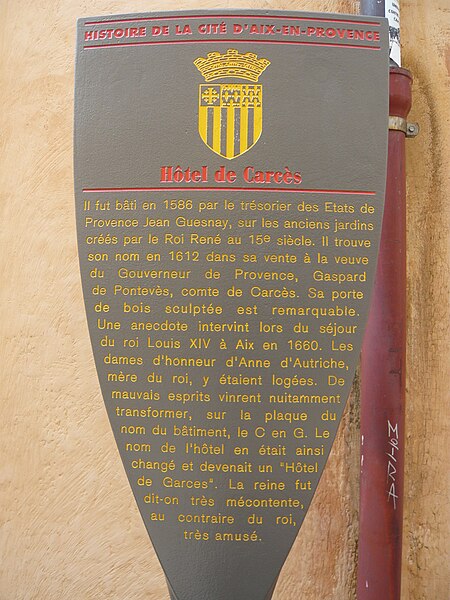 L'hôtel de Carcès est un hôtel particulier situé au 12 rue Émeric-David à Aix-en-Provence (Bouches-du-Rhône). Il fut construit à la fin du XVIe siècle pour Jean Guesnay, trésorier général de France. En 1612, la demeure passa à la famille de Carcès. En 1660, alors qu'elle appartenait à François de Simiane, comte de Carcès et lieutenant général du Roi, l'hôtel reçut les nièces du cardinal Mazarin lors de la visite de Louis XIV à Aix; une plaisanterie locale rapporte qu'un habitant changea la lettre "C" de l'enseigne en "G", formant "Garces" au‑dessus de la porte principale. L'édifice fut vendu en 1662 à Pierre de Coriolis, dont la famille le conserva jusqu'à la fin du XVIIIe siècle. Sous le règne de Louis‑Philippe, il appartint à Ambroise Mottet, premier maire d'Aix après la révolution de 1830 et conseiller d'État, puis aux familles de ses descendants (Féraud‑Giraud, Beau) jusqu'au milieu du XXe siècle. L'hôtel a été inscrit au titre des monuments historiques le 13 septembre 1988. Les boiseries de la porte d'entrée datent du XVIIe siècle. Le bâtiment comporte des écuries aux larges ouvertures, accessibles par un vestibule puis une cour fermée. Une pièce de l'entresol a conservé un plafond à la française sur fond d'or. L'hôtel est une résidence privée et n'est pas ouvert à la visite; la visite de la cour intérieure est toutefois tolérée pendant les heures d'ouverture et des visites publiques sont parfois organisées, notamment lors des Journées du patrimoine. La rue Émeric‑David abrite plusieurs autres hôtels particuliers et maisons historiques, parmi lesquels l'hôtel de Panisse‑Passis, l'hôtel de Barlet, l'hôtel de Maliverny, l'hôtel de Monval, l'hôtel de Comte Siméon, le domicile des Cézanne (de 1878 à 1881) et le domicile du peintre aixois Achille Emperaire. Sur la façade se remarque la porte du XVIIe siècle surmontée d'un buste de faune, et une note historique de la municipalité est apposée à l'extérieur. Bibliographie : André Bouyala d'Arnaud, Évocation du vieil Aix‑en‑Provence, Paris, Les éditions de minuit, 1964, p. 168‑170.