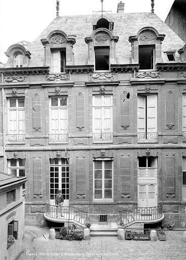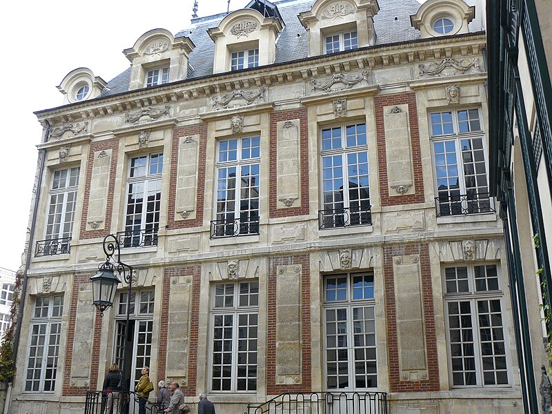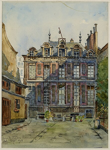 Le terrain, autrefois appartenant à Antoine Le Fèvre de la Borderie puis à son gendre Robert Arnauld d’Andilly, accueillait un jeu de paume et une petite maison avant la construction de l’hôtel pour Guillaume Perrochel, maître d’hôtel du roi ; l’architecte demeure inconnu. Bâti sur une parcelle étroite, l’ensemble en brique rose, pierre blanche et toit d’ardoise, de style Louis XIII, se compose de deux corps accolés, profonds d’une pièce, répartis sur deux étages et combles, chacun couvert par une toiture à deux pans. Loué un temps à une famille Chalon, négociants rouennais, il fut acquis en 1658 par Marie Amelot de Béon‑Luxembourg, qui fit ajouter deux refends latéraux côté jardin et fit édifier le portail somptueux sur la rue ainsi que les bâtiments des communs formant une cour ; un petit jardin est aménagé de l’autre côté.