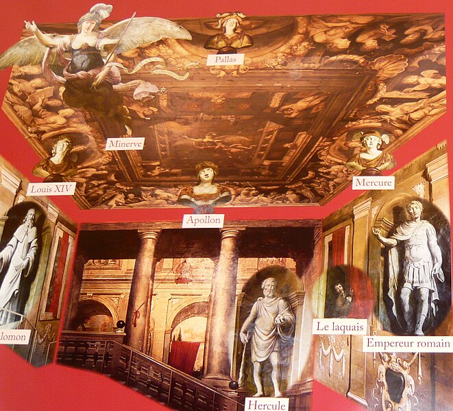 Le trompe‑l'œil de Jean Daret représente Pallas Athéna, déesse de la sagesse et protectrice des sciences et des arts, survolant les allégories des arts libéraux : autour de Pallas figurent la grammaire et la rhétorique, autour de Louis XIV l'arithmétique et la géométrie, autour de Mercure la logique, la peinture et la sculpture, et autour d'Apollon la musique et l'astronomie. Sur le phylactère de Minerve est inscrit le texte « Virtus immortalis », soit « Vertu immortelle ».