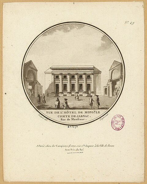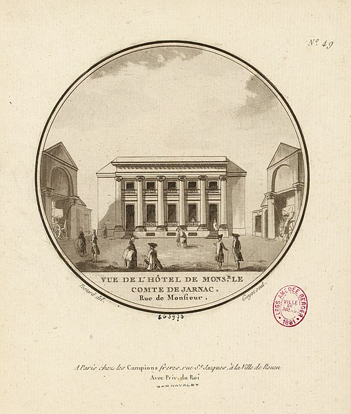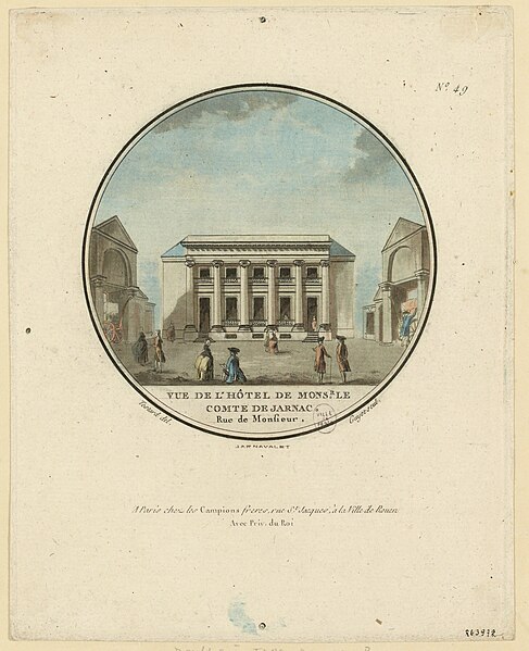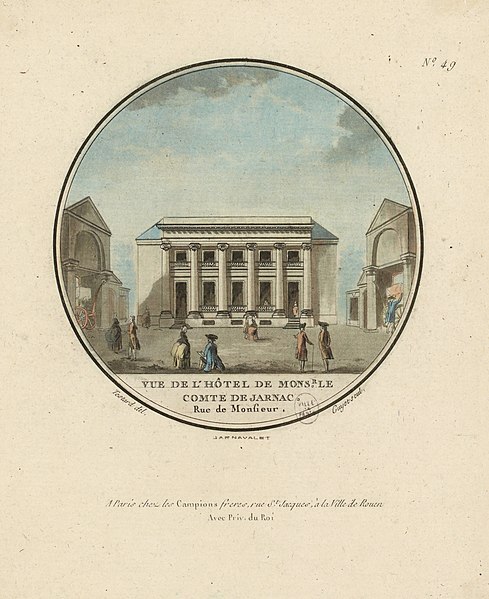 L'hôtel de Jarnac est un hôtel particulier situé au n° 8, rue Monsieur, dans le 7e arrondissement de Paris. Il a été construit en 1784 par Étienne‑François Legrand, l'architecte de l'hôtel de Galliffet, pour Léonard Chapelle, et fut immédiatement loué à Marie‑Charles‑Rosalie de Rohan‑Chabot, comte de Jarnac. Il passa ensuite à divers propriétaires : le comte de Villèle s'y installa en 1828 après avoir quitté la présidence du Conseil, puis il fut vendu en 1834 au chirurgien Guillaume Dupuytren, qui y mourut l'année suivante. Sa fille Adélaïde (1812‑1885), comtesse de Beaumont par son mariage avec Napoléon Louis Bonnin de la Bonninière de Beaumont (1808‑1887), le vendit au prince Pierre Soltykoff, lequel le céda en 1847 à la duchesse de Valençay, née Alix de Montmorency (1810‑1858). La duchesse s'y installa après avoir obtenu la séparation de biens d'avec son mari, Napoléon‑Louis de Talleyrand‑Périgord, 3e duc de Talleyrand. À sa mort en 1858, l'hôtel fut vendu et abrita successivement M. Galichon, le comte Chevreau d'Antraigues, puis Mme Georges Menier, née Simone Camille Marie Legrand (1881‑1972), à partir de 1934. D'inspiration néo‑classique très pure, la façade sur cour présente un péristyle ionique surmonté d'un attique, tandis que la façade sur jardin comporte trois demi‑colonnes ioniques soutenant un fronton incurvé. À l'intérieur, le grand salon est rythmé par un alignement de demi‑colonnes ioniques qui soutiennent une corniche à modillons. Face aux trois portes‑fenêtres donnant sur le jardin, trois fausses baies en plein cintre sont garnies de glaces, et les dessus‑de‑porte sont ornés d'allégories des Quatre Éléments. Entre les colonnes des murs latéraux, des panneaux ornés d'arabesques sont identiques à ceux de la chambre de parade de l'hôtel de Galliffet. L'hôtel a été gravé par Krafft. Le bâtiment, ses dépendances et son jardin sont classés au titre des monuments historiques depuis le 6 février 1939. Il a appartenu aux familles Menier puis Primat avant d'être racheté en 2022 par le milliardaire ukrainien Kostyantin Zhevago pour 35,5 millions d'euros.