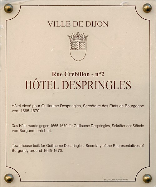 L'ancien hôtel de l'Académie de Dijon, dit hôtel Despringles ou de Grandmont, est un hôtel particulier du XVIIe siècle situé rue Monge, dans le secteur sauvegardé de Dijon. Il a été édifié entre 1662 et 1675 par Guillaume Despringles, greffier des États de Bourgogne, puis acquis en 1773 par l'Académie de Dijon. Supprimée le 8 août 1793, l'Académie réapparut le 14 prairial an VI (2 juin 1798) sous le nom de Société libre des sciences, arts et agriculture de Dijon ; ses biens, séquestrés pendant la Révolution, lui furent rendus avant d'être attribués par décret impérial de 1808 à l'Université de Dijon. À partir de 1809, Académie et Université cohabitèrent malgré un conflit juridique qui dura jusqu'en 1846, l'Académie étant toutefois expulsée en 1841. L'université occupa ensuite entièrement le bâtiment et l'agrandit à plusieurs reprises entre 1843 et 1888 : d'abord avec des extensions réalisées par l'architecte François Papinot pour accueillir les facultés des sciences et des lettres, puis avec des projets et acquisitions ultérieurs ayant permis la construction, sous la direction d'ingénieurs et d'architectes municipaux, d'un ensemble le long de la rue Bassano (devenue rue Monge en 1883) et de la rue du Sachot (actuelle rue des Anciennes-Facultés). Ces travaux créèrent plusieurs amphithéâtres pour la chimie, la physique et les mathématiques, ainsi que des bureaux, des laboratoires et des salles de collections, et deux annexes supplémentaires furent édifiées en 1888 pour les laboratoires. La faculté des lettres quitta la rue Monge en 1920 pour la rue Chabot-Charny, puis les facultés des sciences partirent en 1957 avec l'inauguration du bâtiment Sciences Gabriel et l'installation progressive de l'université sur le campus de Montmuzard. Le rectorat occupa les lieux pendant plus de cinquante ans avant d'être transféré fin 2012 dans un nouveau bâtiment du quartier Clemenceau ; le site, classé aux monuments historiques en 1994, a ensuite vu la majorité de ses locaux reconvertis en logements, tandis que la Salle des Actes reste louée pour des événements et visitable via l'office du tourisme ou les Journées du patrimoine. Architectoniquement, l'hôtel Despringles est un édifice classique du XVIIe siècle dont les extensions du XIXe siècle forment un ensemble éclectique. La Salle des Actes, ancien salon d'apparat, est ornée de bas-reliefs en stuc imitant le marbre blanc, décor commandé par Guyton-de-Morveau à Guillaume Boichot ; elle a été aménagée comme salle des séances et des cérémonies de l'université et du rectorat. À proximité se remarquent notamment le porche donnant sur la rue Crébillon, une plaque d'information trilingue et la cheminée de la Salle des Actes.