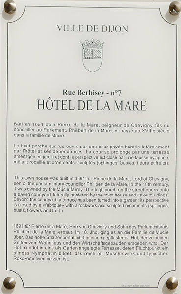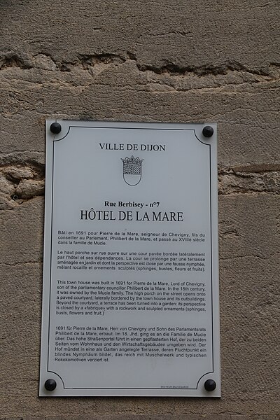 L'Hôtel de la Mare est un hôtel particulier de Dijon, situé dans le secteur sauvegardé de la ville. Il est inscrit au titre des monuments historiques depuis 1947. Une plaque d'information trilingue (français, anglais et allemand) est apposée sur le bâtiment. Des ressources en ligne, notamment la base Mérimée et les portails consacrés à l'architecture, à l'urbanisme, aux monuments historiques et à Dijon, fournissent des informations complémentaires. Pour situer cet édifice dans le patrimoine local, on peut consulter la liste des monuments historiques de Dijon.