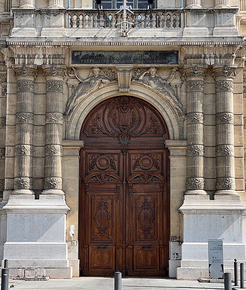 Sur le plan architectural, les fenêtres du rez‑de‑chaussée sont surmontées de frontons circulaires, celles du premier étage de frontons triangulaires et celles de l'étage supérieur sont rectangulaires. La façade principale est ornée de quatre statues sculptées par Eugène‑Louis Lequesne représentant, à gauche, Jean V de Pontevès et Vendôme, et, à droite, Jean‑Étienne‑Marie Portalis et l'intendant Lebret ; au‑dessus de la porte principale se trouvait une statue équestre de Napoléon III par Eugène Guillaume, détruite en 1870. La façade donnant sur le jardin et la rue de Rome porte quatre statues de Pierre Travaux représentant, à gauche, Monseigneur de Belsunce et le chevalier Roze, et, à droite, le roi René et Palamède de Forbin. La façade ouest présente deux statues — l'empereur Constantin par Charles Gumery et Charles Barbaroux par Stanislas Clastrier — et la cour intérieure est décorée de quatre statues de Jean Marcellin représentant Mirabeau, le bailli de Suffren, Pierre Puget et le duc de Villars. Le site est desservi par la station de métro Estrangin - Préfecture.