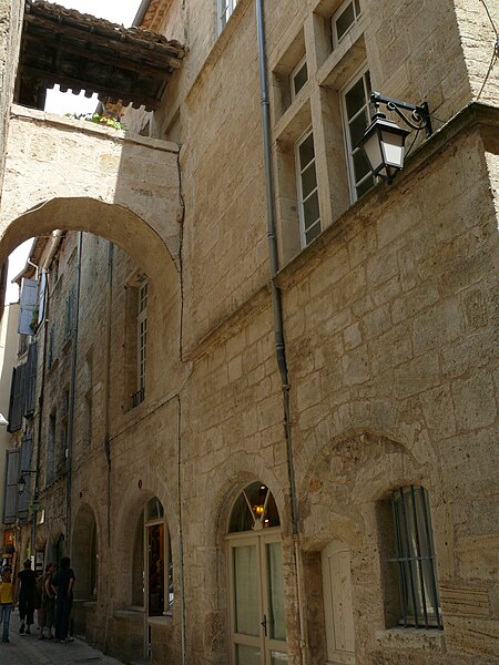 Dans la cour, un escalier de pierre à volée droite dessert une galerie extérieure puis une autre galerie qui était autrefois ouverte en loggia. L'accès aux étages supérieurs se fait par un escalier à vis dont la tourelle carrée est couronnée d'une frise sculptée d'éléments gothiques formés de petits mâchicoulis ouvragés. L'édifice, bel exemple d'"hospicium" construit dans la ville médiévale autour de 1500, n'est toutefois pas documenté avant 1688. Au cours de la seconde moitié du XVIIe siècle, il appartient à Jacques Gardes, bourgeois de Pézenas; en 1703 il passe à son fils Claude de Gardes — conseiller du roi, avocat en parlement et lieutenant principal en la cour royale et châtellenie de Pézenas — puis rejoint la famille de Carrion. L'hôtel tire son nom de ses derniers propriétaires à la fin de l'Ancien Régime : Henri-Guillaume de Carrion d'Espagne de Nizas, qui en fit l'acquisition le 15 mars 1753, et Marie-Françoise-Elisabeth de Carrion, qui revend l'immeuble le 28 juin 1795 à Joseph-Gabriel Gautier.