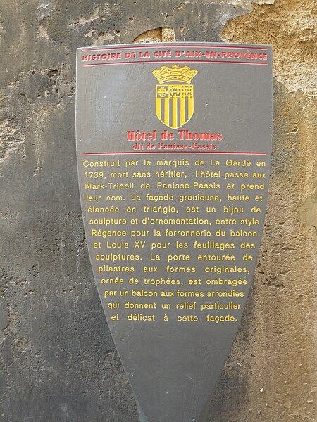 L'hôtel de Panisse, également appelé hôtel de Panisse-Passis ou hôtel de Thomas, se situe à Aix-en-Provence. Il fut construit en 1739 pour Henri de Thomas, marquis de La Garde, conseiller au Parlement de Provence. Faute d'héritier, il passa à la famille de Mark-Tripoli de Panisse-Passis, propriétaire par ailleurs du château Borély à Marseille, et Pierre Léandre de Mark-Tripoli de Panisse-Passis y naquit. Le monument fait l'objet d'une inscription partielle au titre des monuments historiques depuis 1929. La façade, plus resserrée que celles de certains autres hôtels particuliers aixois, se compose de trois travées et mêle des éléments du classicisme à une inspiration Régence ; les pierres sculptées témoignent du style Louis XV. La pierre provient des carrières de Bibémus, comme pour la plupart des édifices aixois des XVIIe et XVIIIe siècles, et lui confère une teinte ocre clair caractéristique. Les boiseries, notamment celles du portail, présentent une imposte ornée du monogramme de la famille Thomas et des vantaux à réserves aux moulurations chargées d'attributs guerriers. Les balconnets du premier étage, cintrés et reposant sur deux consoles, sont ornés de têtes grotesques aux bouches ouvertes au visage énigmatique. À l'intérieur, la rampe d'escalier en fer forgé est d'origine et porte, au premier étage, les armoiries des familles Thomas et Panisse-Passis.