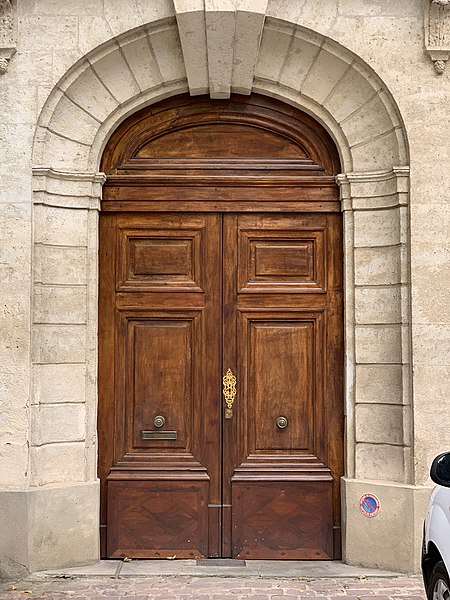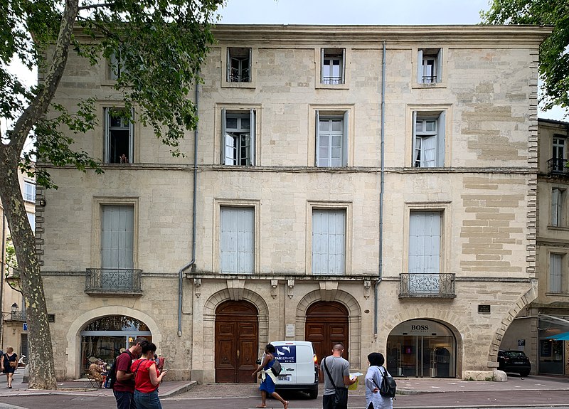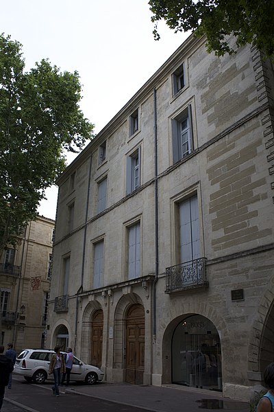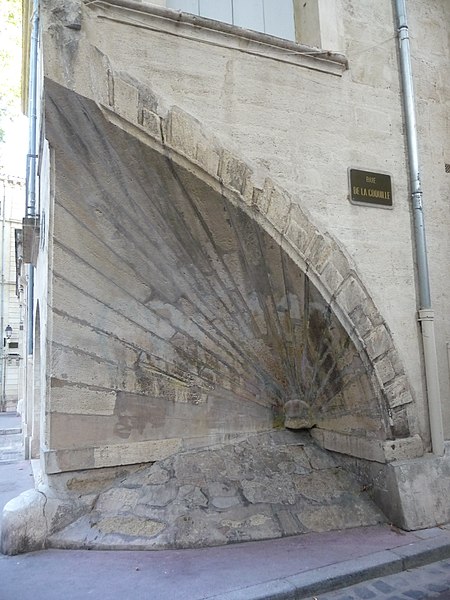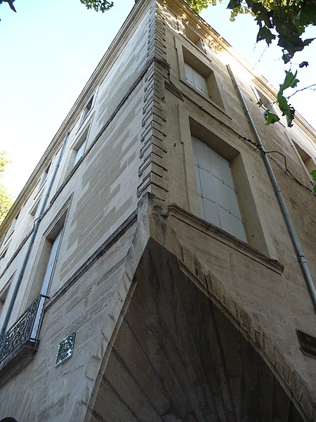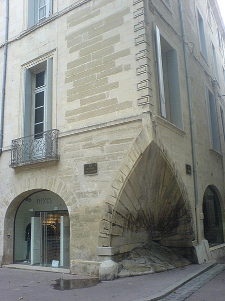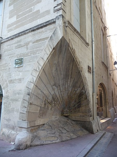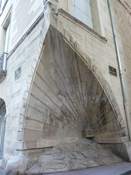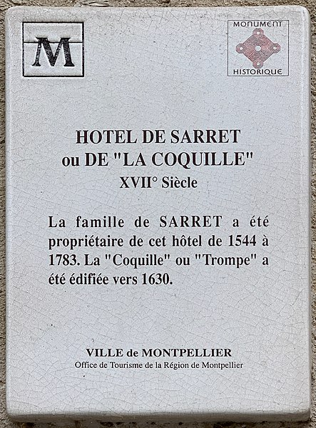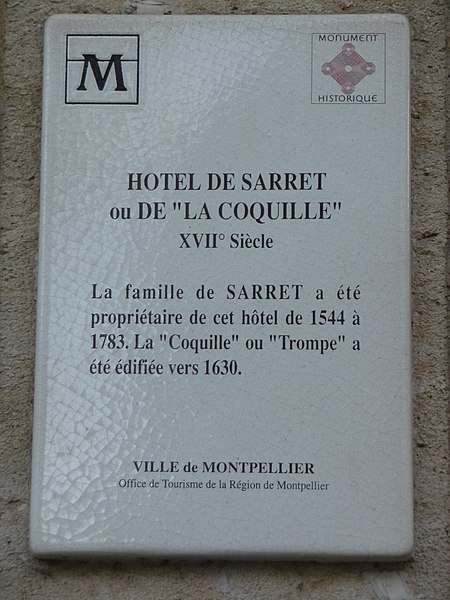 L'ancien hôtel de Sarret, dit de la Coquille, a été reconstruit en 1636 à partir de l'ancien hôtel de Genebrières, l'intervention initiale comprenant à sa base l'exécution d'une coquille. La façade a été modifiée à la fin du XVIIe siècle sur les plans de d'Aviler, puis en 1783 l'édifice a été surélevé d'un étage et la façade refaite. L'hôtel occupe la plus grande partie de l'îlot compris entre les rues du Palais, de la Coquille, Astruc et Foch ; la coquille dégage largement l'angle des rues du Palais et de la Coquille. Elle se compose de très longs voussoirs qui rayonnent à partir d'un bossage qui fut peut-être sculpté d'une coquille, et les naissances de cette trompe sont marquées par un bandeau. Les arcs de tête sont renforcés par une chaîne ; l'avant-corps, peu saillant, est surtout caractérisé par des refends ornant les piédroits et les ébrasements des deux portes en arc. Les clés de ces arcs supportent un entablement à larmier qui s'appuie également sur quatre consoles décorées de feuilles d'acanthe, elles-mêmes portées par des pilastres. Les chaînes d'angle présentent des bossages alternés, cernés de larges rainures. L'édifice fut reconstruit à novo par Simon Levesville puis Bertrand Delane pour Jean de Sarret, conseiller à la cour des comptes, aides et finances. Au XVIIIe siècle, des remaniements profonds entraînèrent la perte de l'escalier et du décor de la façade d'entrée, ainsi que la redistribution indépendante des niveaux par de nouveaux escaliers desservant le premier étage et les autres étages.