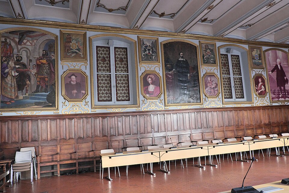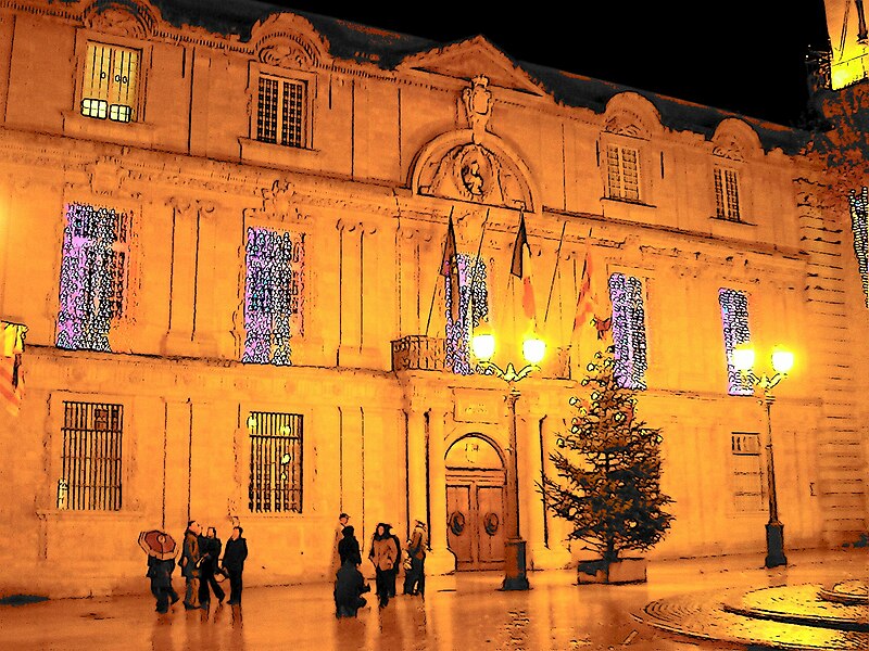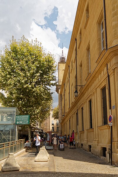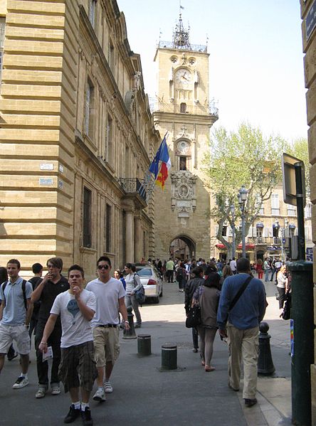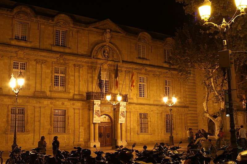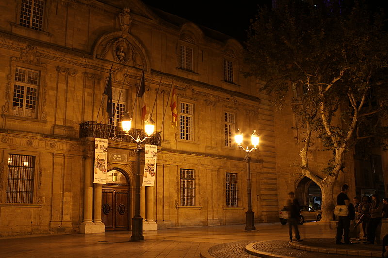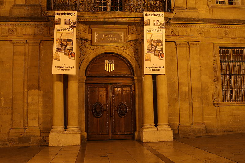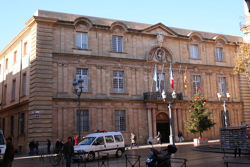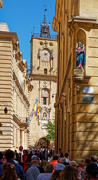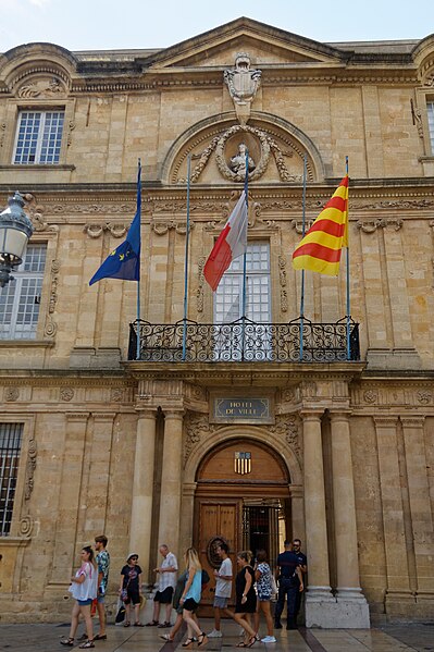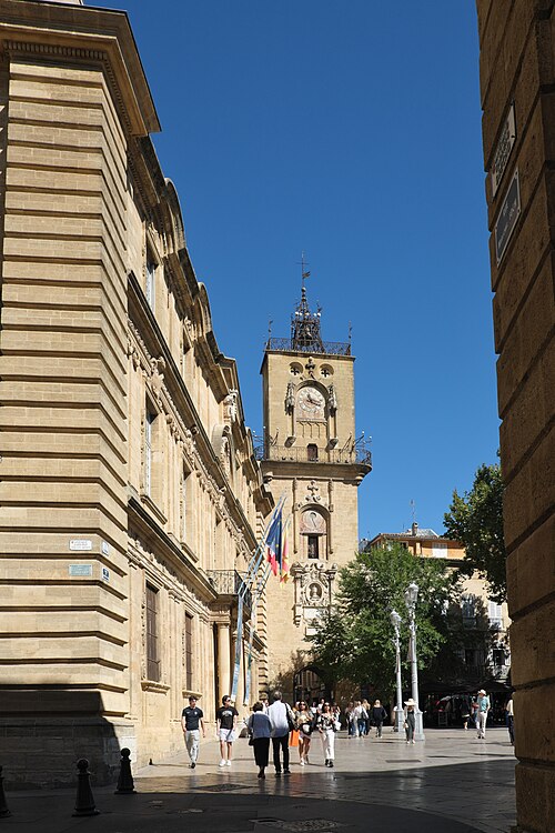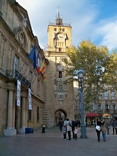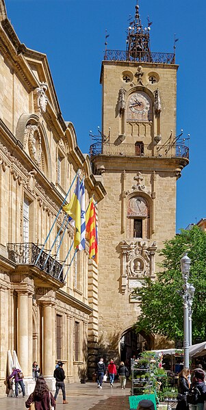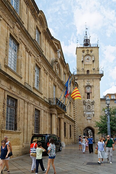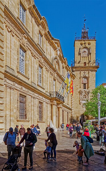 L'hôtel de ville d'Aix-en-Provence, situé sur la place de l'Hôtel-de-Ville, est composé notamment de la Tour de l'Horloge, ancienne tour d'enceinte du XVIe siècle, attenante à l'édifice municipal d'origine construit au XIVe siècle. La salle du Conseil, d'origine XIVe, a été rebâtie en 1538 puis restaurée de 1655 à 1660 et de 1665 à 1671 par Pierre Pavillon ; une nouvelle campagne de travaux a eu lieu en 1755 et un bâtiment complémentaire a été élevé entre 1903 et 1905. L'ancien hôtel de ville se trouvait sur la place de l'Annonerie-Vieille ; après la réunion du bourg Saint-Sauveur et de la ville comtale au XIVe siècle, il fut déplacé à son emplacement actuel. Initialement séparée de la tour de l'Horloge par la maison d'un Aixois, celle-ci fut acquise et démolie, permettant d'adosser le nouvel hôtel de ville à la tour. Lors de la Révolution française de 1789, l'édifice perdit certains ornements, tels que des bustes de comtes de Provence et des anges. Le monument est classé au titre des monuments historiques depuis 1995.