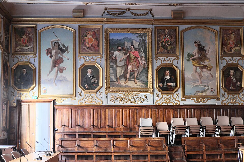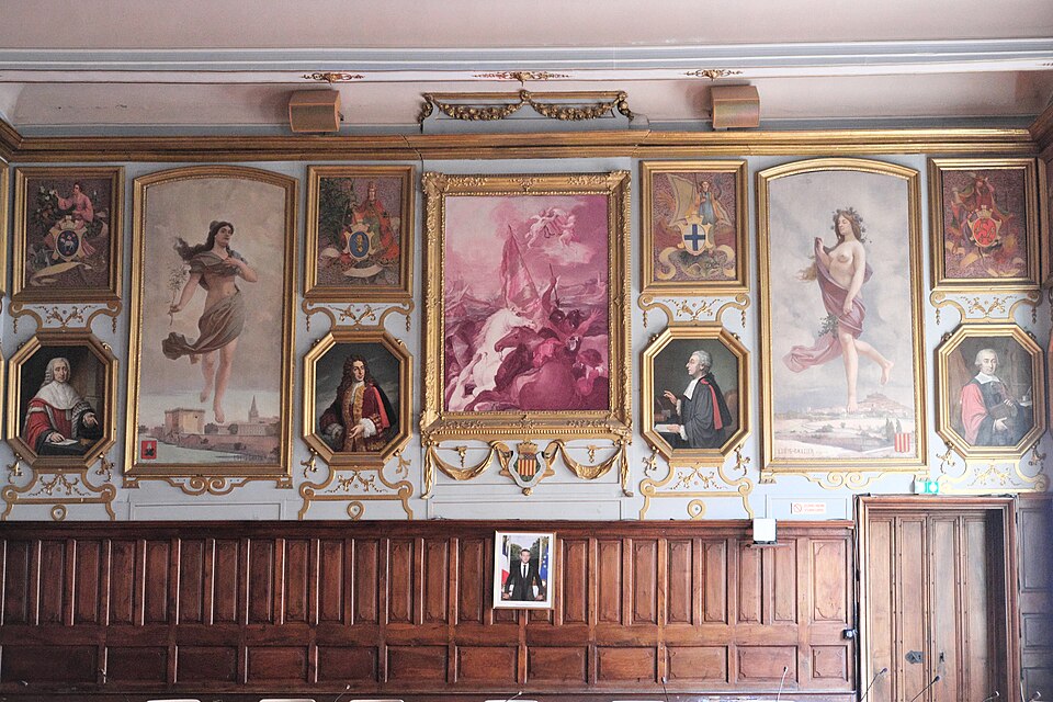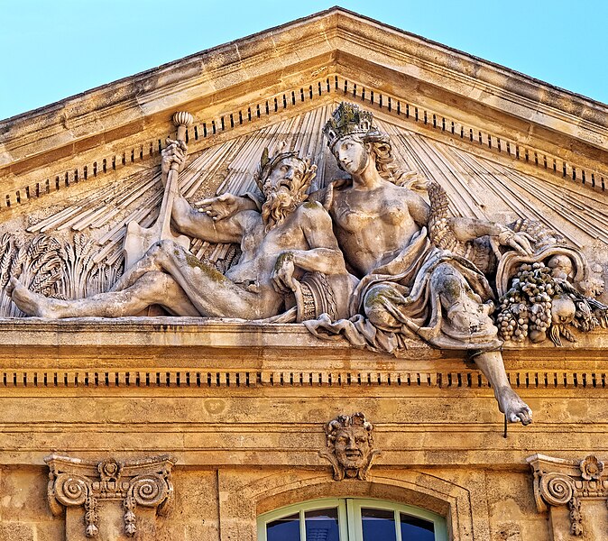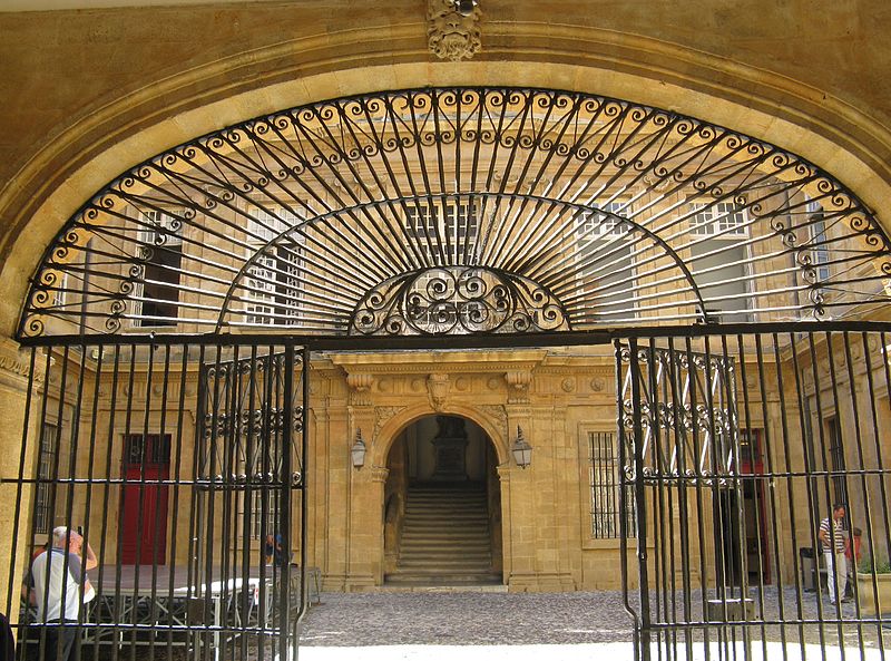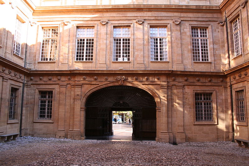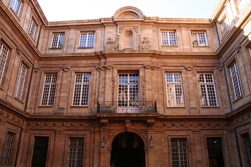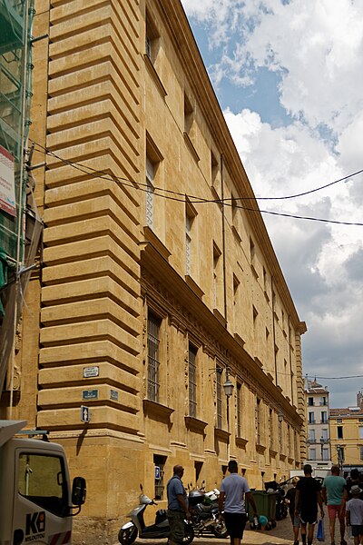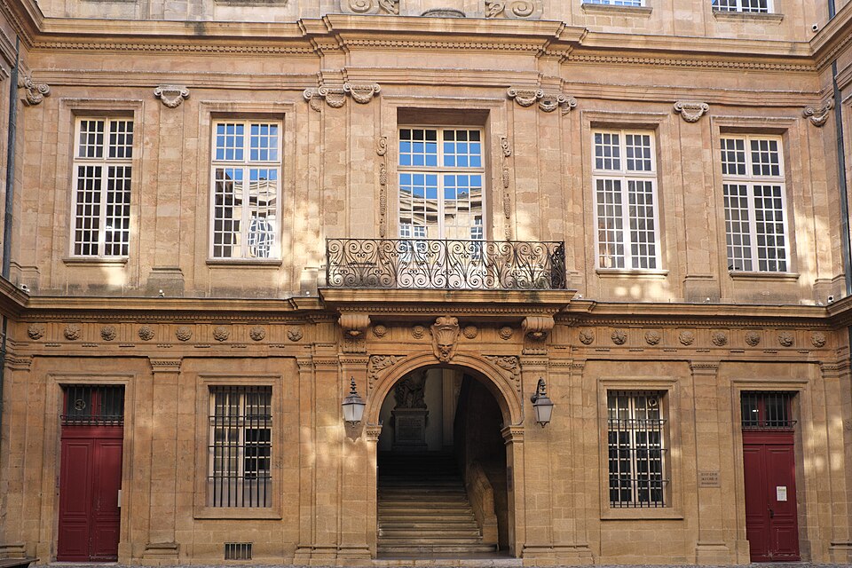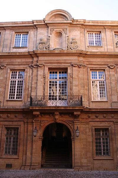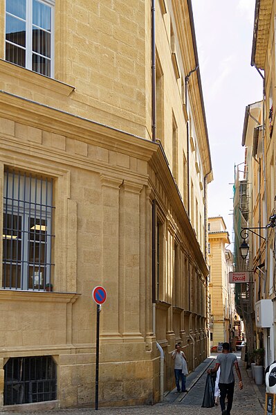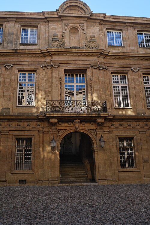 Le bâtiment, œuvre de l'architecte aixois Pierre Pavillon assisté des sculpteurs Rambot et Fossé, présente une façade inspirée des palais italiens. Chaque étage comporte cinq fenêtres séparées par une frise : celle du rez-de-chaussée affiche triglyphes et rosaces, comparable à l'hôtel de Lestang-Parade, tandis que la frise du premier étage est parcourue de rinceaux enroulés en sens opposés, rappelant la Maison carrée de Nîmes. Une page consacrée à l'hôtel de ville figure sur le site de la mairie d'Aix-en-Provence et des ressources complémentaires traitent des monuments historiques d'Aix ainsi que des portails consacrés à l'architecture, à la ville d'Aix-en-Provence et aux monuments historiques français.