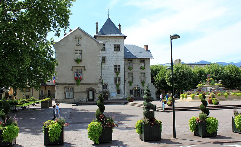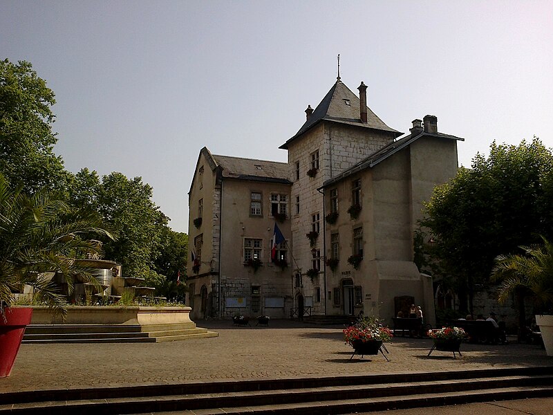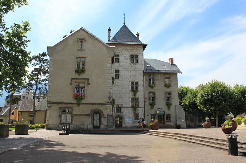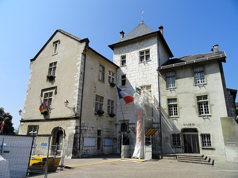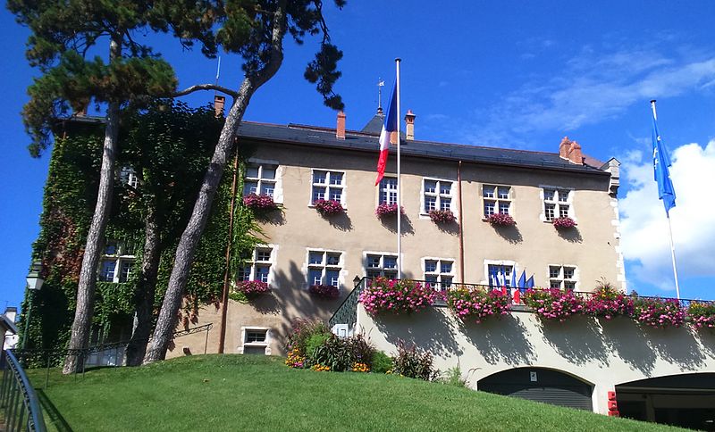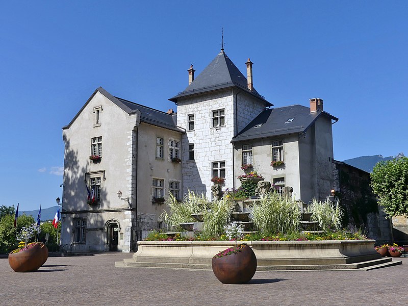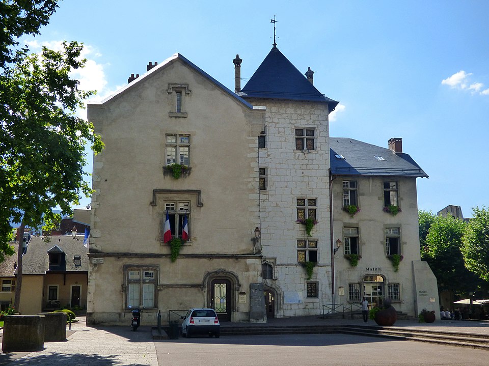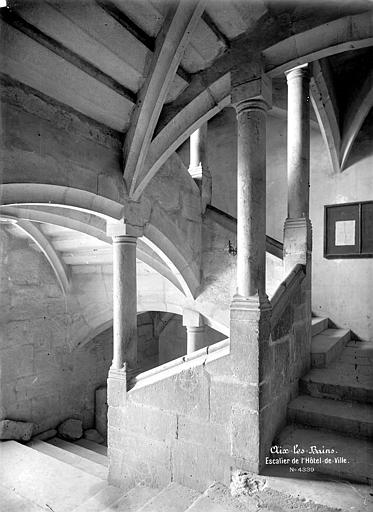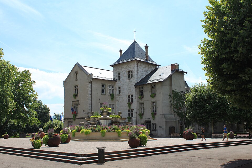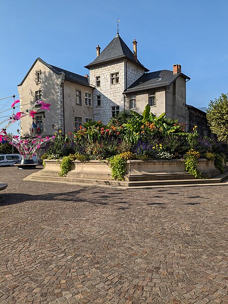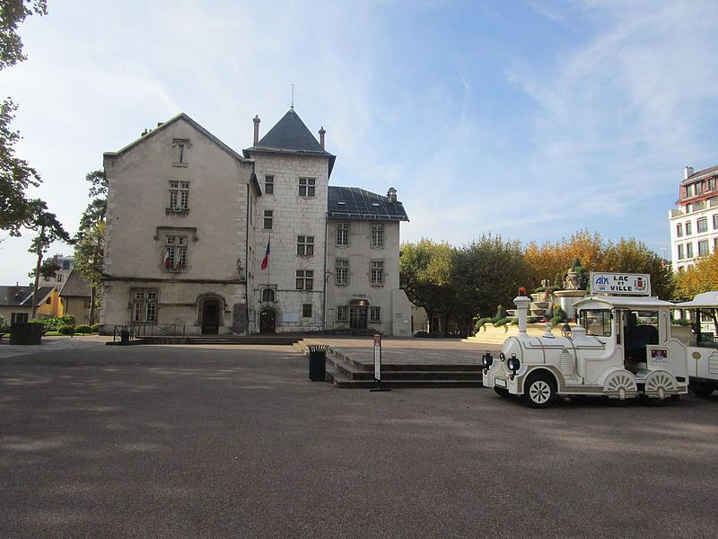 Les origines du château d'Aix sont mal connues : une charte de 24 avril 1011 indique que la villa d'Aix, donnée par le roi Rodolphe à sa femme, était qualifiée de sedem regalem, allusion à son statut royal probablement hérité du fisc carolingien. On suppose la présence d'une aula royale, peut‑être installée dans les murs d'un ancien temple romain encore visible. En 1172, Aix relève du comte Humbert III de Savoie ; la seigneurie est ensuite inféodée, peut‑être d'abord à une famille d'Aix, puis à la famille de Seyssel, attestée pour la première fois en 1235. La construction d'un donjon carré, souvent nommé tour dans les sources modernes, est vraisemblablement due à un membre de la famille de Seyssel et peut se situer entre la seconde moitié du XIIe et la première moitié du XIIIe siècle, hypothèse appuyée par des photographies antérieures à la démolition de 1873. Le château est mentionné pour la première fois en juin 1308 comme lieu d'un acte de vente. Les fouilles de 1988 ont livré peu de vestiges du premier château : traces d'enceinte et du donjon détruit en 1873, non datables, tandis que des fondations et des tessons du XIe siècle ont été repérés à l'est du temple. Une analyse dendrochronologique de 2005 date l'abattage de plusieurs poutres du plafond du rez‑de‑chaussée vers l'année 1400. La famille de Seyssel connaît une période prospère à la fin du XIVe et au début du XVe siècle. L'escalier d'honneur, élevé en une seule campagne pour la baronne Isabeau de la Roche‑Andry après son mariage avec François de Seyssel en 1571, desservait une petite chapelle au second étage. Aux XVIIe et XVIIIe siècles la tour de la muraille fait l'objet d'aménagements — percements et escalier — puis est détruite au XVIIIe siècle ; à la même époque le château, doté de communs, est souvent affermé et comprend deux appartements à l'étage. Un acte du 25 février 1757 signale d'importants dégâts causés par les troupes espagnoles entre 1742 et 1748. En 1793 le château sert d'hôpital militaire ; en 1794 les mâchicoulis de la tour et le crénelage de l'enceinte sont démolis. Il abrite ensuite des militaires convalescents, est vendu à un particulier puis loué en 1813 aux Sœurs de Saint‑Joseph pour l'hospice municipal fondé par la reine Hortense. Racheté en 1821 par le marquis Thomas de Seyssel d'Aix, le bâtiment est loué en 1824 à la Société du Cercle et transformé en casino selon les plans de l'architecte Mélano ; le corps de logis est alors prolongé à l'est pour créer une salle de bal à l'italienne surmontée d'appartements, et agrandi à l'ouest pour une bibliothèque et une orangerie entre 1832 et 1849, tandis que le temple de Diane est provisoirement converti en théâtre. La commune acquiert le château en 1866 pour y installer la mairie, qui s'y installe en 1868 ; des travaux d'aménagement provoquent l'effondrement d'une façade est récemment ajoutée et sa reconstruction tient compte du style des fenêtres à croisée de l'escalier. Les aménagements intérieurs se succèdent ensuite : percement de fenêtres en 1882 pour éclairer les bureaux, transformation d'espaces au premier étage pour la salle du conseil, création d'un logement pour l'architecte en 1888, incendie en 1908 qui détruit les combles et endommage le plancher du second étage, remplacement de ce plancher en 1921 et projet non réalisé de transformer le bâtiment en musée‑bibliothèque sous la direction de Jules Pin aîné. Les cloisonnements sont modifiés à nouveau en 1926, la salle du conseil agrandie et décorée de boiseries en 1932 qui subsistent aujourd'hui, et des travaux successifs interviennent sur les façades et les menuiseries entre 1967 et 1979 ; la porte d'accès à la tour d'escalier et le ravalement de cette tour font l'objet d'interventions en 1978 et 1988, et depuis 1990 des études portent sur la réfection intérieure de l'escalier. L'hôtel de ville est implanté place Maurice Mollard, en face des anciens thermes nationaux, à la lisière du parc floral des Thermes et sur la même place que l'arc de Campanus ; il jouxte le temple de Diane, monuments eux‑mêmes protégés au titre des monuments historiques. L'escalier est classé monument historique depuis le 7 août 1890 ; l'ensemble du bâtiment, à l'exception de l'aile nord, est classé depuis le 11 décembre 1982.