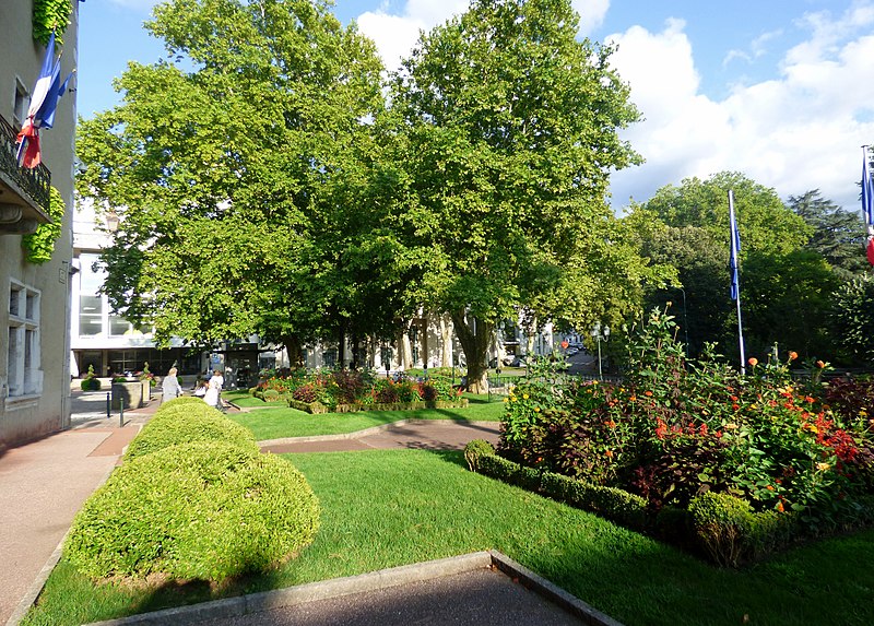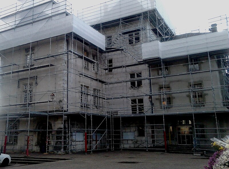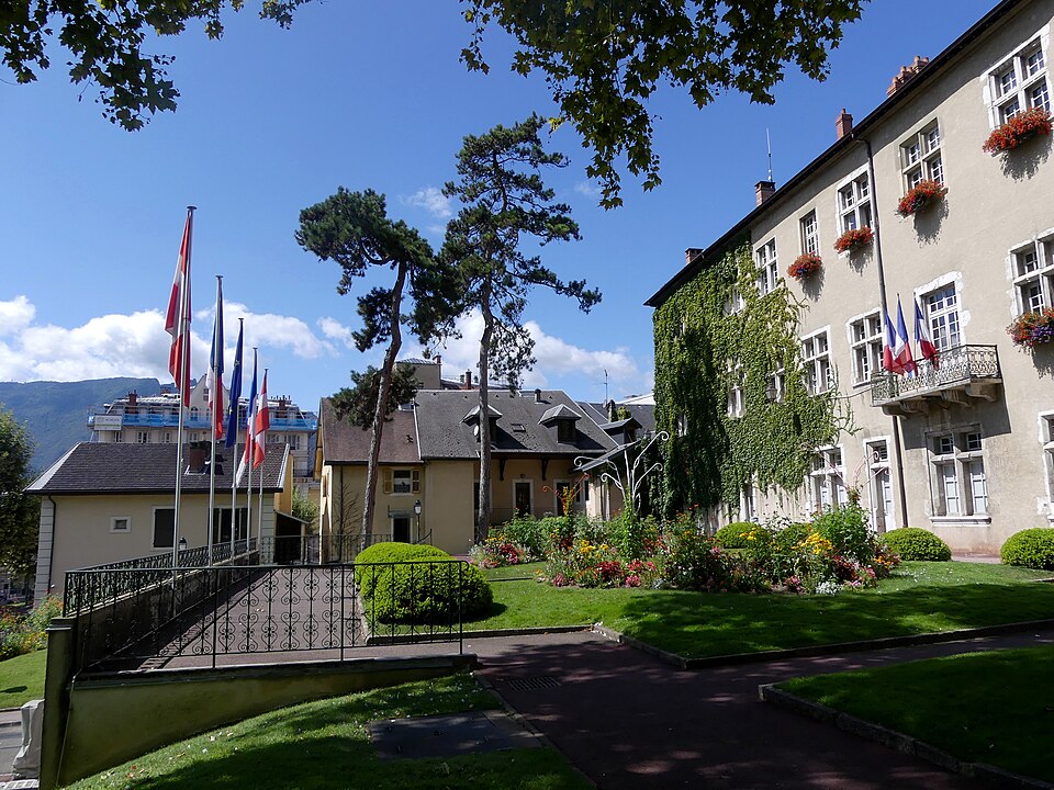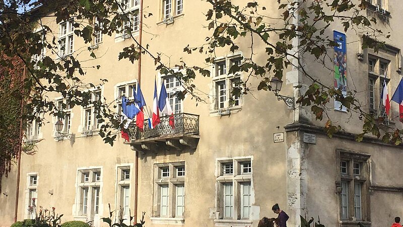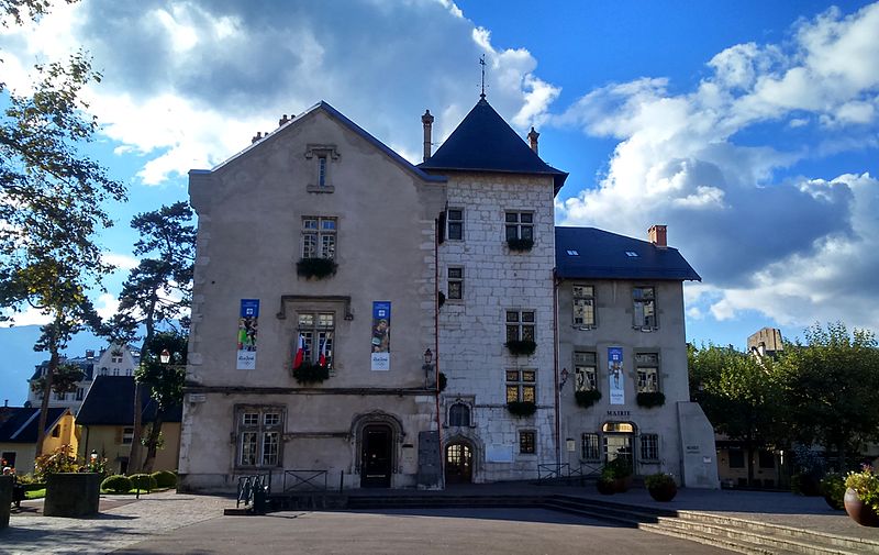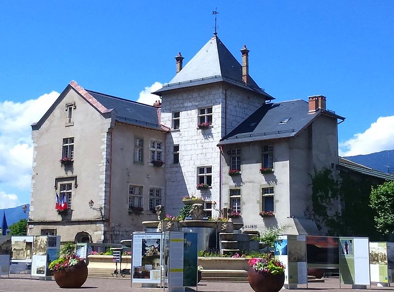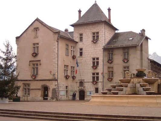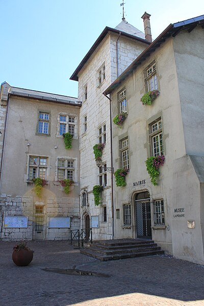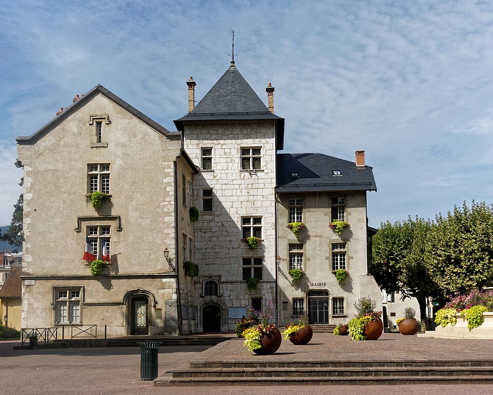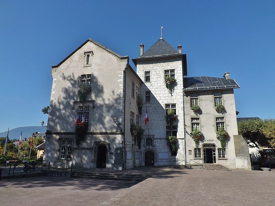 Les origines du château d'Aix sont mal connues : une charte de 24 avril 1011 indique que la villa d'Aix, donnée par le roi Rodolphe à sa femme, était qualifiée de sedem regalem, allusion à son statut royal probablement hérité du fisc carolingien. On suppose la présence d'une aula royale, peut‑être installée dans les murs d'un ancien temple romain encore visible. En 1172, Aix relève du comte Humbert III de Savoie ; la seigneurie est ensuite inféodée, peut‑être d'abord à une famille d'Aix, puis à la famille de Seyssel, attestée pour la première fois en 1235. La construction d'un donjon carré, souvent nommé tour dans les sources modernes, est vraisemblablement due à un membre de la famille de Seyssel et peut se situer entre la seconde moitié du XIIe et la première moitié du XIIIe siècle, hypothèse appuyée par des photographies antérieures à la démolition de 1873. Le château est mentionné pour la première fois en juin 1308 comme lieu d'un acte de vente. Les fouilles de 1988 ont livré peu de vestiges du premier château : traces d'enceinte et du donjon détruit en 1873, non datables, tandis que des fondations et des tessons du XIe siècle ont été repérés à l'est du temple. Une analyse dendrochronologique de 2005 date l'abattage de plusieurs poutres du plafond du rez‑de‑chaussée vers l'année 1400. La famille de Seyssel connaît une période prospère à la fin du XIVe et au début du XVe siècle. L'escalier d'honneur, élevé en une seule campagne pour la baronne Isabeau de la Roche‑Andry après son mariage avec François de Seyssel en 1571, desservait une petite chapelle au second étage. Aux XVIIe et XVIIIe siècles la tour de la muraille fait l'objet d'aménagements — percements et escalier — puis est détruite au XVIIIe siècle ; à la même époque le château, doté de communs, est souvent affermé et comprend deux appartements à l'étage. Un acte du 25 février 1757 signale d'importants dégâts causés par les troupes espagnoles entre 1742 et 1748. En 1793 le château sert d'hôpital militaire ; en 1794 les mâchicoulis de la tour et le crénelage de l'enceinte sont démolis. Il abrite ensuite des militaires convalescents, est vendu à un particulier puis loué en 1813 aux Sœurs de Saint‑Joseph pour l'hospice municipal fondé par la reine Hortense. Racheté en 1821 par le marquis Thomas de Seyssel d'Aix, le bâtiment est loué en 1824 à la Société du Cercle et transformé en casino selon les plans de l'architecte Mélano ; le corps de logis est alors prolongé à l'est pour créer une salle de bal à l'italienne surmontée d'appartements, et agrandi à l'ouest pour une bibliothèque et une orangerie entre 1832 et 1849, tandis que le temple de Diane est provisoirement converti en théâtre. La commune acquiert le château en 1866 pour y installer la mairie, qui s'y installe en 1868 ; des travaux d'aménagement provoquent l'effondrement d'une façade est récemment ajoutée et sa reconstruction tient compte du style des fenêtres à croisée de l'escalier. Les aménagements intérieurs se succèdent ensuite : percement de fenêtres en 1882 pour éclairer les bureaux, transformation d'espaces au premier étage pour la salle du conseil, création d'un logement pour l'architecte en 1888, incendie en 1908 qui détruit les combles et endommage le plancher du second étage, remplacement de ce plancher en 1921 et projet non réalisé de transformer le bâtiment en musée‑bibliothèque sous la direction de Jules Pin aîné. Les cloisonnements sont modifiés à nouveau en 1926, la salle du conseil agrandie et décorée de boiseries en 1932 qui subsistent aujourd'hui, et des travaux successifs interviennent sur les façades et les menuiseries entre 1967 et 1979 ; la porte d'accès à la tour d'escalier et le ravalement de cette tour font l'objet d'interventions en 1978 et 1988, et depuis 1990 des études portent sur la réfection intérieure de l'escalier. L'hôtel de ville est implanté place Maurice Mollard, en face des anciens thermes nationaux, à la lisière du parc floral des Thermes et sur la même place que l'arc de Campanus ; il jouxte le temple de Diane, monuments eux‑mêmes protégés au titre des monuments historiques. L'escalier est classé monument historique depuis le 7 août 1890 ; l'ensemble du bâtiment, à l'exception de l'aile nord, est classé depuis le 11 décembre 1982.