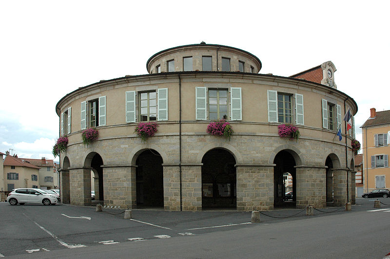 En 1816, les plans de l'hôtel de ville auraient été établis à l'initiative des citoyens, par imitation de la halle aux blés de Paris. En 1822, le marché aux grains s'installe au rez-de-chaussée de l'édifice. Entre 1825 et 1827, des travaux aménagent la mairie à l'étage. L'édifice présente un plan circulaire et s'appuie sur trois murs concentriques : le plus petit délimite la halle originelle et la grande salle du conseil au-dessus, le second contient les sanitaires et l'escalier d'accès à l'étage, et le troisième comporte deux niveaux, avec un large passage à arcades au rez-de-chaussée et, au-dessus, les locaux de la mairie.