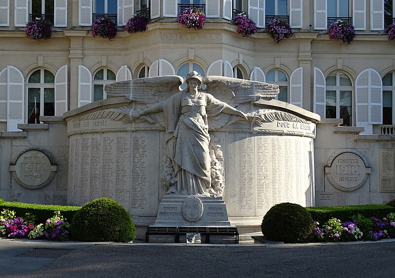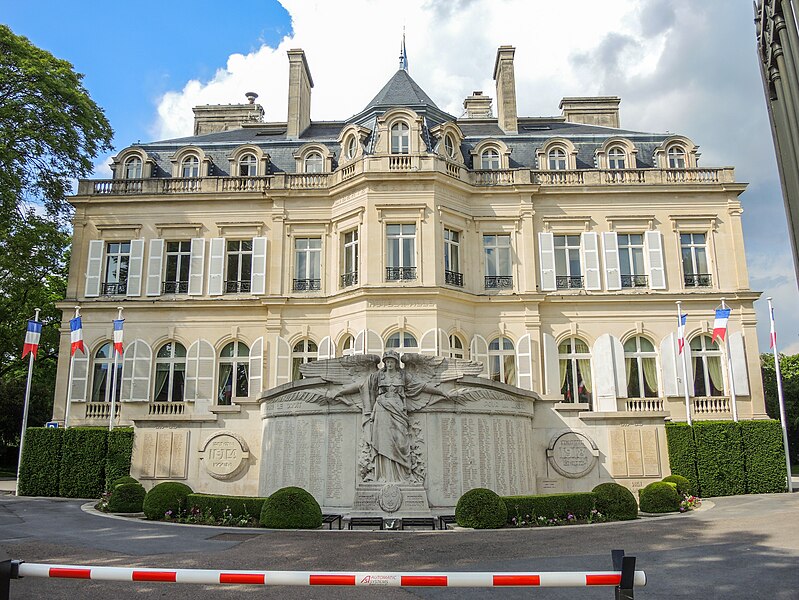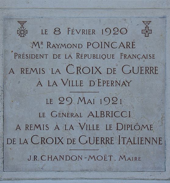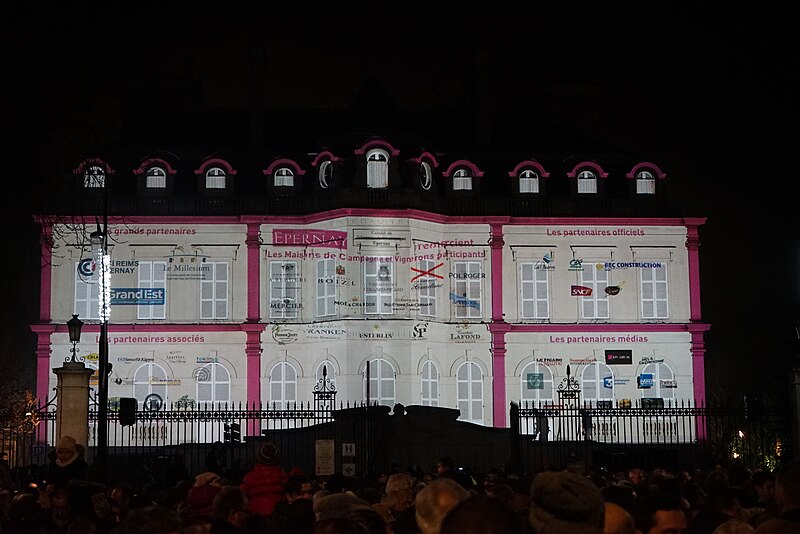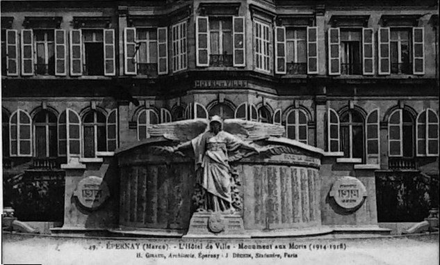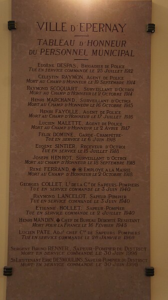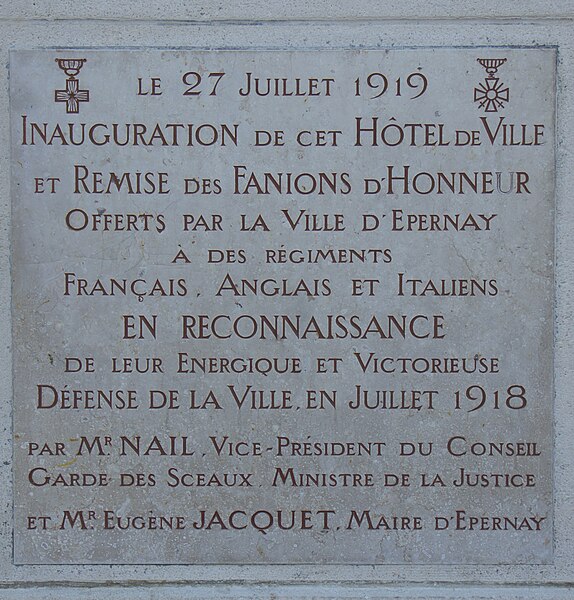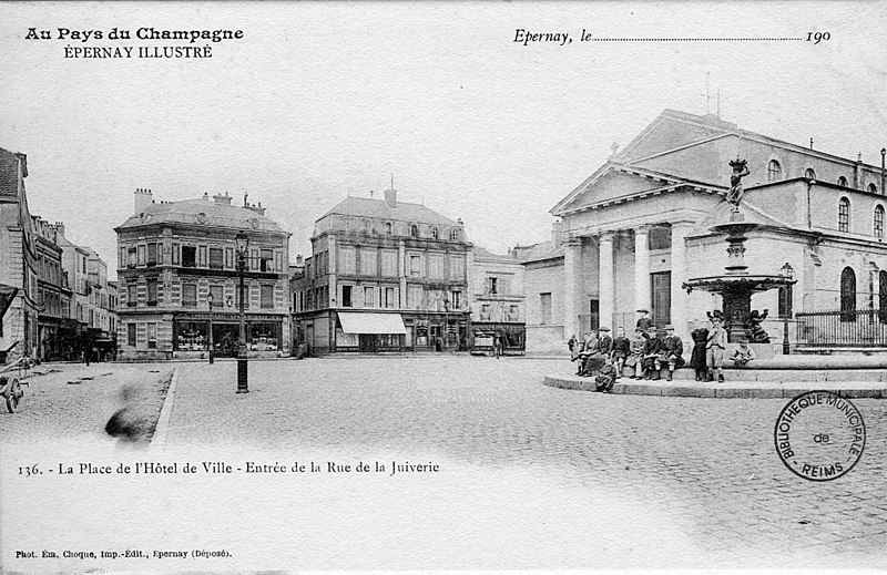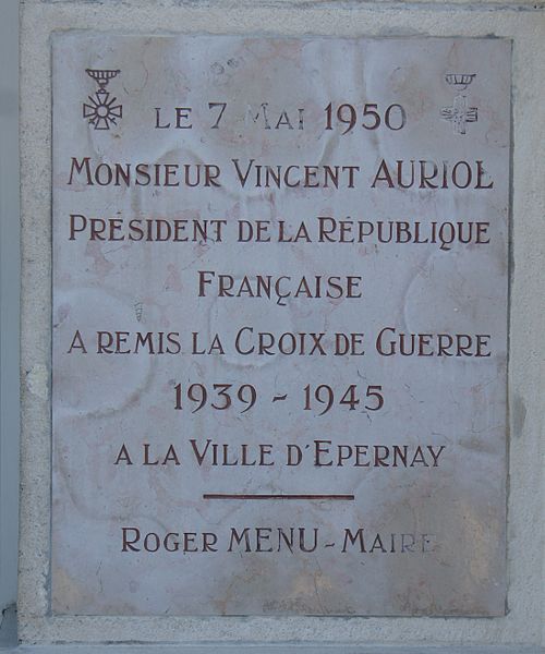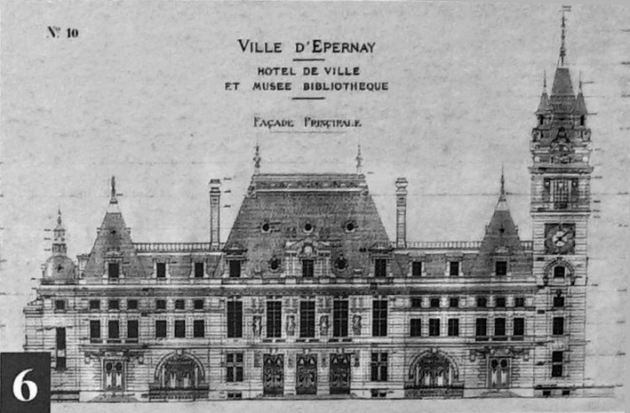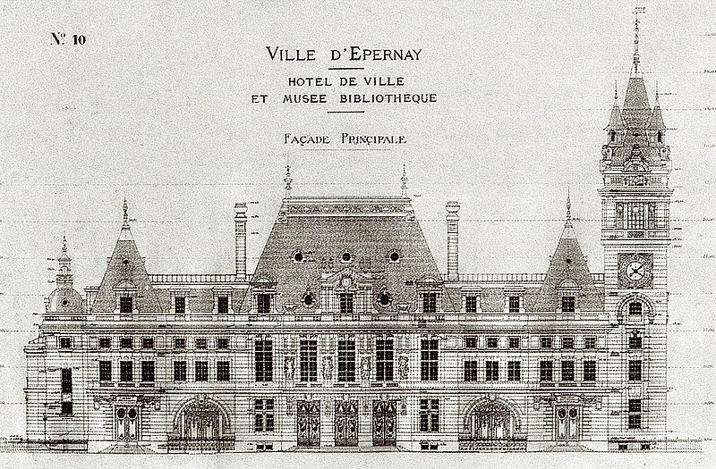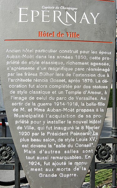L'hôtel de ville d'Épernay, ancien hôtel Auban-Moët, est un édifice du milieu du XIXe siècle construit par l'architecte Victor Lenoir pour la famille Auban-Moët. Élevé sur trois niveaux, il présente un style néo-classique marqué par un décor de pilastres qui valorise ses façades. L'intérieur est soigné : le vestibule évoque un atrium antique, tandis que la grande salle à manger et les salons de réception offrent un décor néo‑XVIIIe de belle facture avec faux-bois peint, ornementation blanche et or et cheminées en marbre blanc. Les communs, en architecture brique et pierre très décorative, adoptent volontairement un style distinct de la maison. Le parc, aménagé entre 1870 et 1880, associe un jardin à la française et un jardin à l'anglaise. L'hôtel particulier, construit vers 1858 puis agrandi après 1870 par l'architecte Alphonse Gosset, a été cédé à la ville en 1919 ; la mairie s'y est installée en 1920. En 1924 y a été inauguré le monument aux morts de la Première Guerre mondiale. L'ensemble a été inscrit en 2012 pour ses façades et toitures, ainsi que pour le décor intérieur du rez-de-chaussée, l'escalier et sa cage avec vitraux, le vestibule de l'étage et son puits de lumière ; les bâtiments des communs situés de l'autre côté du jardin sont également concernés. Tous ces espaces abritent les services municipaux. Avant cela, les bâtiments de l'ancienne abbaye Saint-Martin, à l'exception de l'église, avaient été transformés en mairie en 1793. Au début du XXe siècle, l'état de l'église se dégradant, il fut décidé de construire une nouvelle église et un nouvel hôtel de ville ; Hugues Plomb fit un don d'un million de francs pour ce projet et la place où se trouvait l'ancien hôtel de ville porte aujourd'hui son nom. Le chantier devait incorporer le portail Saint-Martin, mais la Première Guerre mondiale a interrompu les travaux, conduisant la famille Auban-Moët à céder son hôtel particulier à la ville. Le jardin public, qui entoure la mairie côté gare et avenue de Champagne, comprend un kiosque, des sculptures, une rocaille avec plan d'eau et un parterre à la française ; il est labellisé « jardin remarquable » depuis 2012.