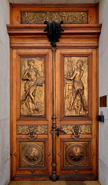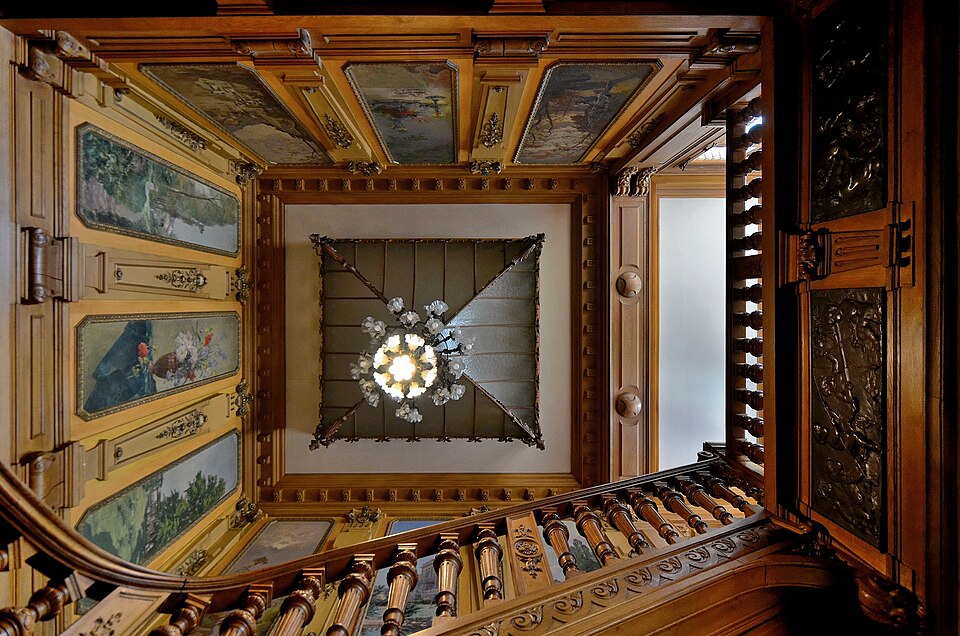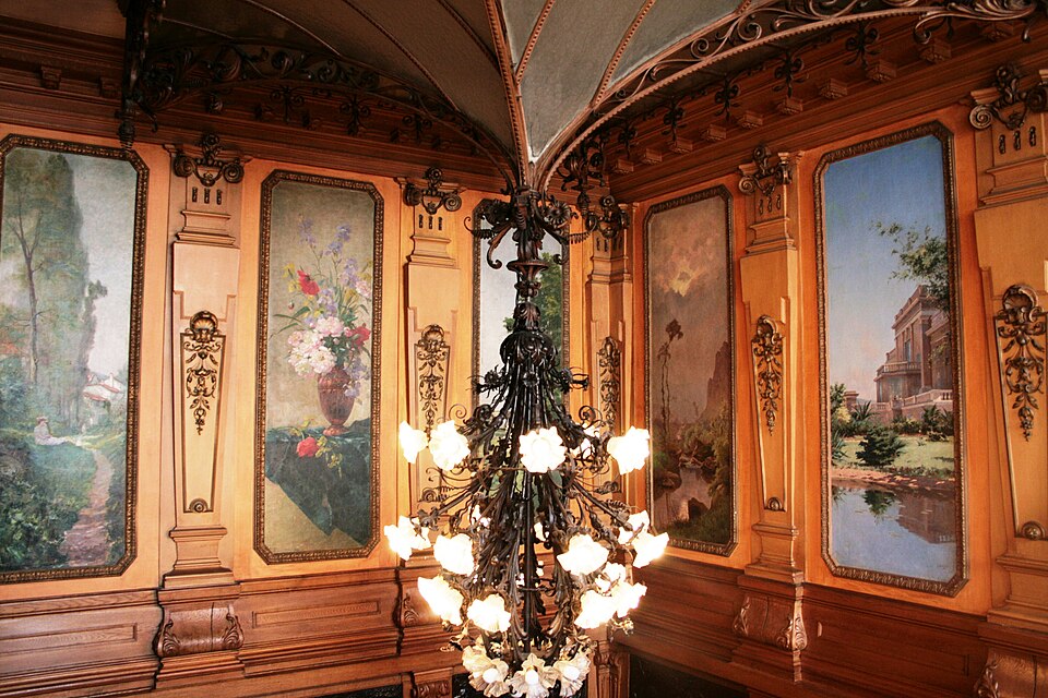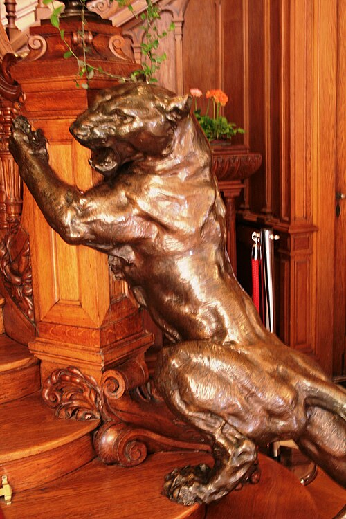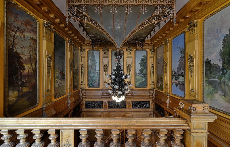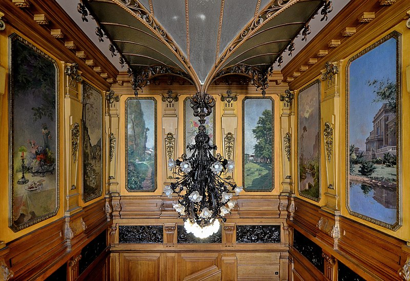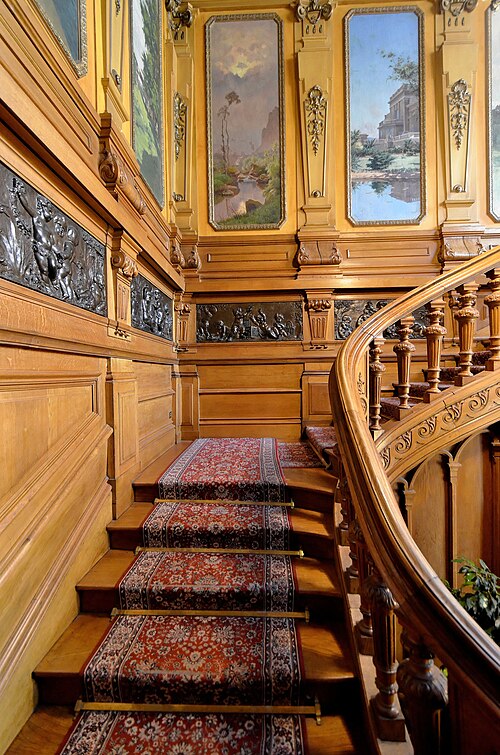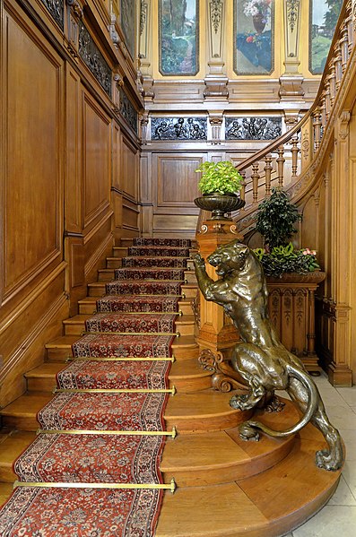 L'extérieur présente un vocabulaire du style classique français, tandis que la décoration intérieure relève du rococo. La façade orientale ouvre sur une entrée encadrée de deux statues inspirées des Atlantes de Pierre Puget à Toulon ; au-dessus de la devise « Liberté, Égalité, Fraternité » s'inscrit un soleil rayonnant, allusion au nom de famille Lumière. La porte en chêne est ornée de bas-reliefs en bronze représentant, sur ses deux battants, des allégories de la Peinture et de la Sculpture. Le hall d'entrée, au plafond à caissons, comprend deux grands bas-reliefs sculptés en vis-à-vis, allégories des arts et des sciences. À droite du hall se trouvent un grand salon et un petit salon aux teintes jaunes, meublés d'éléments d'époque. En face de l'entrée, un escalier aux boiseries de chêne, couvert d'un tapis rouge, commence par une statue de lion à la gueule ouverte placée sur la droite et est surmonté d'un lustre à pampilles d'origine. Les murs qui encadrent cet escalier sont décorés de peintures d'artistes lyonnais accompagnées, en dessous, de bas-reliefs en bronze.