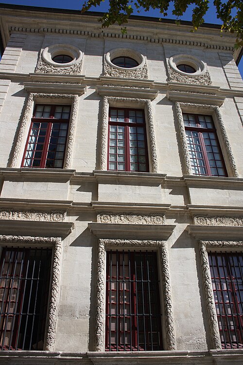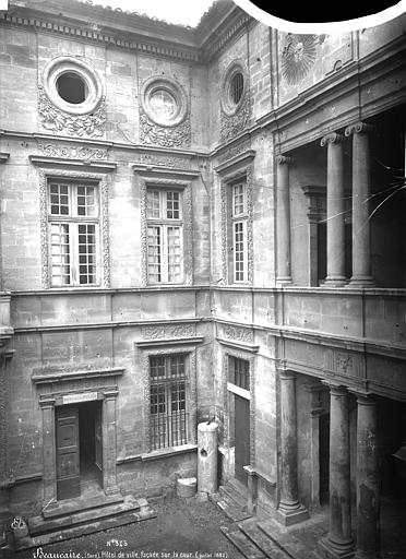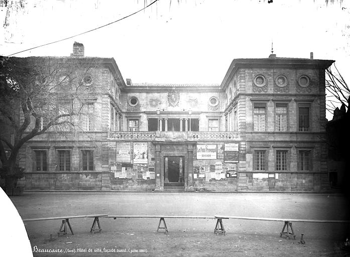 L'hôtel de ville de Beaucaire, situé place Georges-Clémenceau, a été édifié dans la seconde moitié du XVIIe siècle ; les enchères débutèrent le 4 juin 1679 et les travaux furent engagés la même année. Des plans sont parfois attribués à Jules Hardouin-Mansart, mais un projet et un devis de Jacques Cubizol, architecte de Nîmes, ont été présentés dès la phase initiale, et Ponce Alexis de La Feuille, inspecteur des travaux, est intervenu en 1680 pour modifier le programme. Il imposa notamment la suppression des piliers de l'escalier, l'ouverture d'une loggia et le remplacement de la couverture en tuiles par une toiture en forte pente couverte d'ardoises de Grenoble, solution qui ne résista pas au mistral ; en 1704 le toit fut abattu, sa pente réduite puis recouverte de tuiles. L'édifice se compose d'un rez-de-chaussée, d'un grand étage et d'un étage d'attique, avec un corps central et deux ailes organisant une cour d'honneur fermée par un mur surmonté d'une galerie découverte. La façade principale donne sur cette cour rectangulaire et s'ouvre par une loggia à colonnes ioniques ; au-dessus, dans l'attique, un écusson aux armes de la ville est flanqué de deux soleils, emblèmes de Louis XIV. Le vestibule, placé au fond de la cour, abrite un grand escalier en pierre à balustres carrés qui débouche sur la loggia du premier étage. Toutes les baies des façades sont encadrées d'un tore de feuillage et surmontées d'un larmier orné d'une frise à motifs variés ; l'étage d'attique comporte des oculi décorés de guirlandes de lauriers enrubannés. Les menuiseries des grandes baies comportaient à l'origine un meneau avec deux traverses à gros boudin et filets, mais la plupart ont été déposées et remplacées par des menuiseries plus récentes. À l'intérieur, la salle du conseil conserve des boiseries du XVIIe siècle, et le vestibule renferme des vestiges d'époque romaine découverts dans la ville ou ses environs. L'ensemble, comparable par sa chronologie et certains traits aux hôtels de ville d'Arles et à l'hôtel Lunaret de Montpellier, a été classé au titre des monuments historiques le 23 avril 1925.