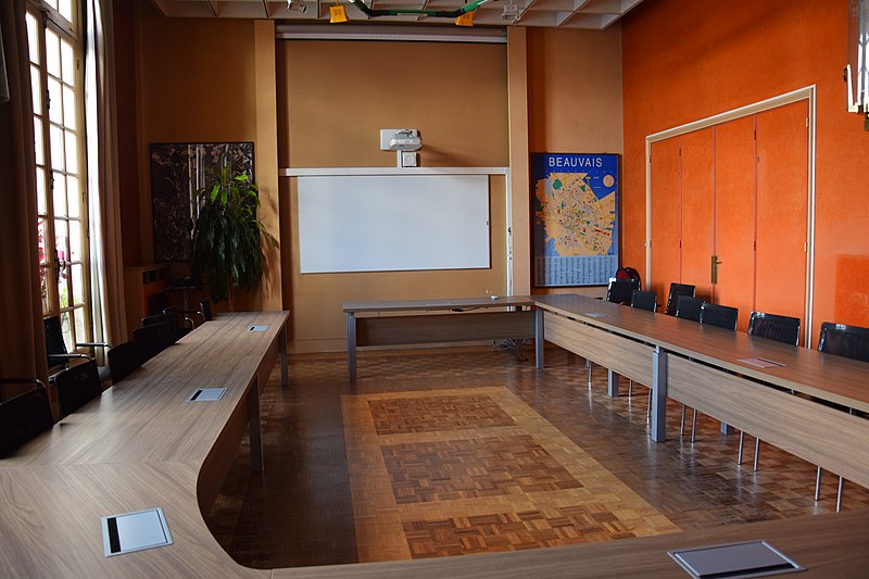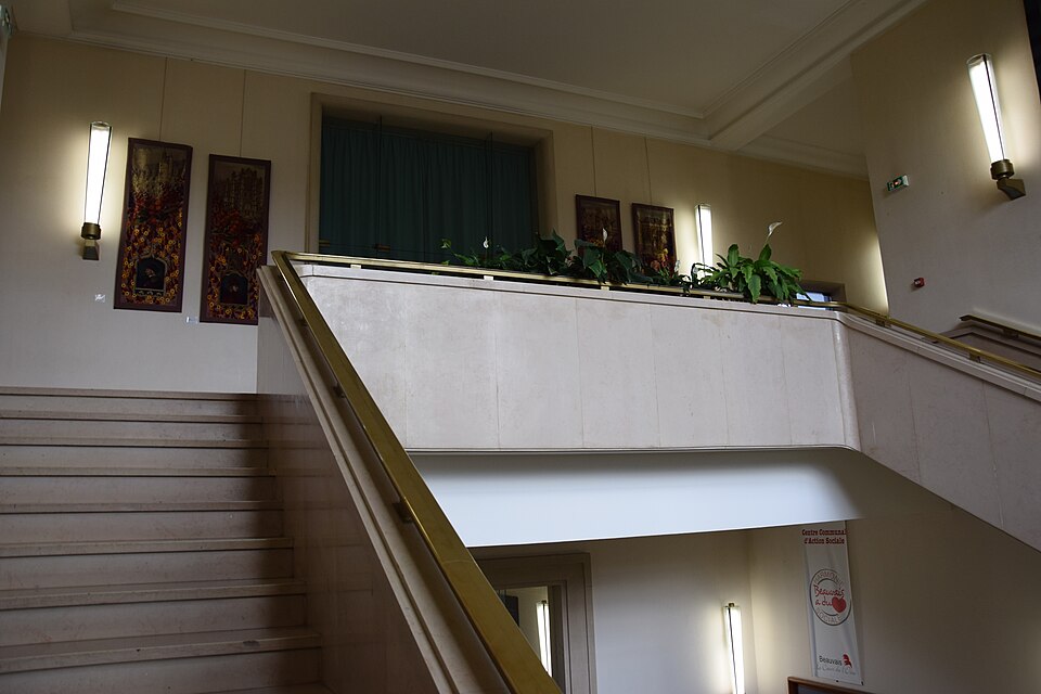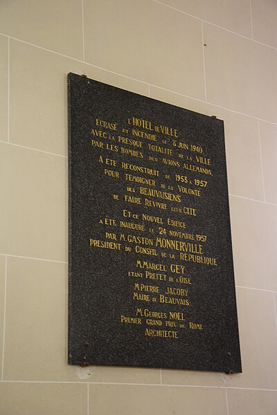 Deux ailes modernes ajoutées lors de la reconstruction portent dans leur partie supérieure des bas-reliefs : sur l'aile droite, Claude Bouscau a sculpté une allégorie des destructions de 1940 intitulée Beauvais devant l'adversité, et sur l'aile gauche Maurice Debus a sculpté La Renaissance de Beauvais. L'accès au premier étage se fait par un grand escalier d'honneur. Le décor de la salle des mariages, réalisé par l'ébéniste Jules Leleu et daté du troisième quart du XXe siècle, est classé au titre des monuments historiques pour le mobilier (banquettes, chaises, fauteuils, bureau) ; y sont également conservés vingt chaises, douze fauteuils, trois canapés et un écran à feu des XVIIIe et XIXe siècles. L'hôtel de ville conserve plusieurs œuvres et objets : la Bacchanale de Charles-Auguste van den Berghe, Jeanne Hachette au siège de Beauvais de Jean-Jacques Le Barbier, une tapisserie du XVIe siècle, le drapeau dit « drapeau de Jeanne Hachette » en mémoire de la bataille de Saint-Quentin de 1557, ainsi qu'un cartel du XVIIIe siècle. Les éléments remarquables à visiter sont notamment la façade, l'escalier d'honneur et la salle du conseil.