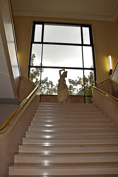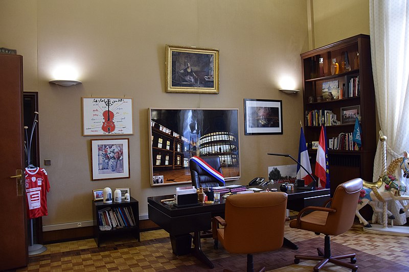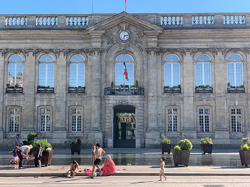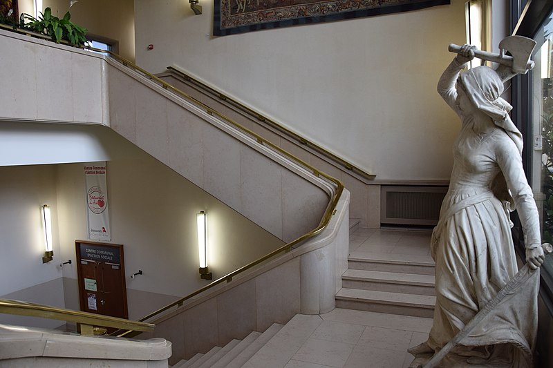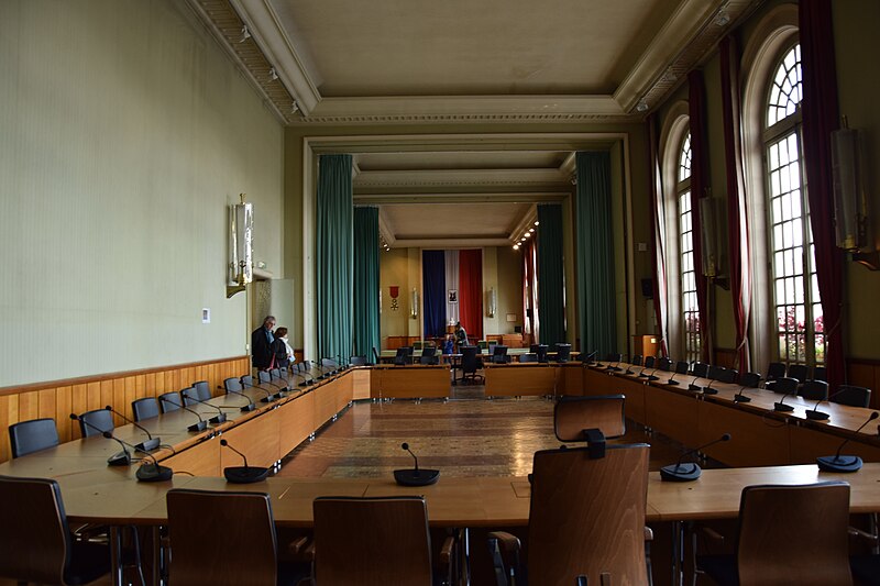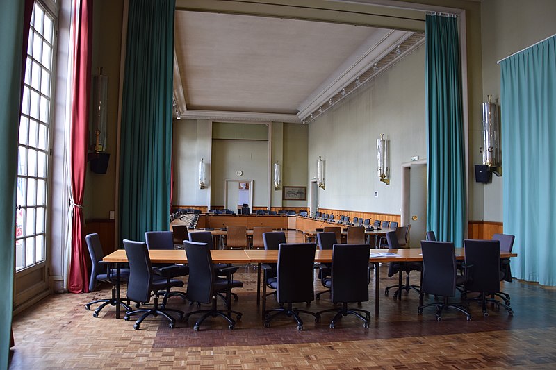 L'édifice actuel a conservé la façade classique, organisée symétriquement sur deux niveaux. Au centre s'ouvre une porte d'entrée encadrée de deux colonnes engagées portant des chapiteaux ioniques ornés de fleurs sculptées. Au-dessus, une large fenêtre à sommet arrondi est surmontée d'une horloge, elle-même surmontée des armoiries de la ville et de la devise « Palus ut hic fixus, constans et firma manebo » ( « Et tel ce pieu fiché, constante et solide, je resterai » ). L'ensemble est couronné d'un fronton triangulaire. De part et d'autre, quatre fenêtres par niveau sont séparées par de larges pilastres aux chapiteaux ioniques décorés de feuillage, et la partie supérieure de la façade est ornée d'une balustrade aux formes classiques.