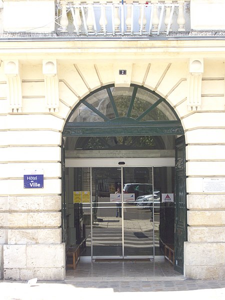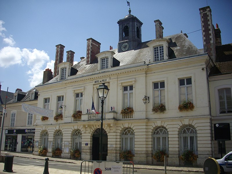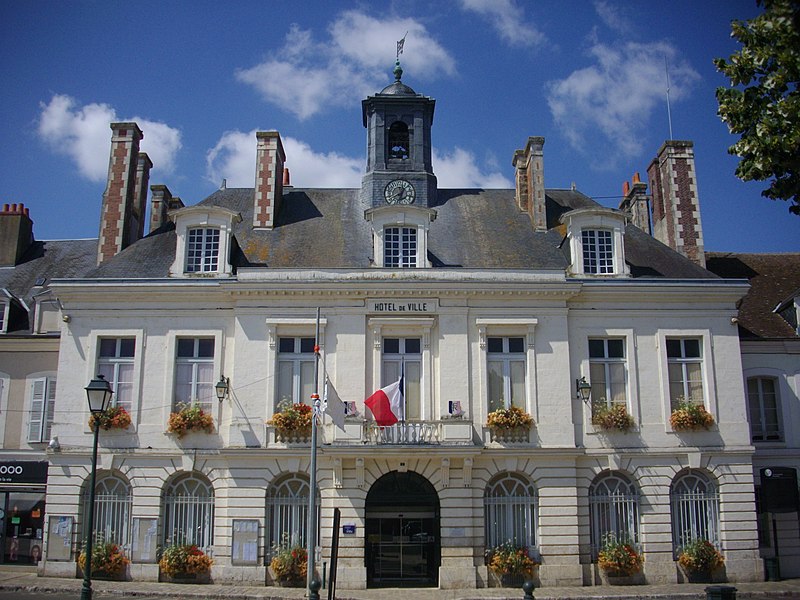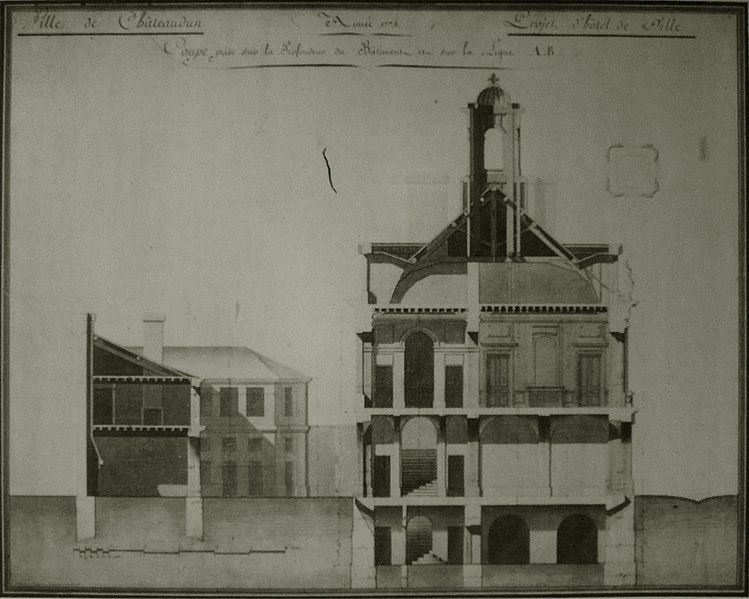 L'hôtel de ville de Châteaudun abrite les services municipaux de la commune, chef-lieu d'arrondissement d'Eure-et-Loir, en région Centre-Val de Loire. L'élévation et la toiture sont inscrites au titre des monuments historiques depuis le 18 août 1953. Une charte de commune accordée en octobre 1197 par Louis de Blois, confirmée en 1281 par Pierre Ier d'Alençon, institua des notables élus et fit de l'église de la Madeleine le siège communal jusqu'en 1525, date de la construction d'une première maison de ville près de la porte d'Amont. Cette maison de ville fut détruite lors de l'incendie de juin 1723, qui rasa 1 022 maisons (240 dans la ville et 782 dans le faubourg Saint-Valérien), laissa près de 80 % de la population sans abri et entraîna le transfert des services municipaux au collège, alors situé à l'angle de l'actuelle rue du Château et de la place Jehan de Dunois. Par arrêt du Conseil d'État du 6 septembre 1723, l'architecte Jules Michel Alexandre Hardouin fut chargé de la reconstruction et présenta, après un séjour de trente-deux jours accompagné de quatre dessinateurs, un plan en échiquier centrant la ville sur une grande place rectangulaire destinée à recevoir quatre bâtiments publics : l'hôtel de ville, le bailliage, l'élection et le grenier à sel. La décision de construire un nouvel hôtel de ville intervint en juillet 1767 ; les plans présentés par Philippe Guillois ne furent pas retenus et, après la mort de Guillois en 1773, ceux de Pierre Toufaire, natif de Châteaudun et offerts gratuitement, furent choisis. La première pierre fut posée le 14 mai 1777 par Nicolas Maury, bailli de Dunois, et les travaux s'achevèrent en 1783. Parmi les quatre grands bâtiments prévus sur les longs côtés de la place, deux furent réalisés au fond de la place, dont l'hôtel de ville en pierre édifié à la fin du XVIIIe siècle ; les deux pavillons prévus en vis-à-vis ne furent pas construits et furent remplacés par un hôtel des postes en 1900. L'édifice se distingue par une façade symétrique articulée autour d'un avant-corps central légèrement saillant. Le rez-de-chaussée présente des bossages plats et des lignes de refend rythmés par une série d'arcades en plein cintre ; le premier étage est percé de hautes fenêtres rectangulaires encadrées de moulures et surmontées, dans l'axe central, d'une balustrade ; la base arasée d'un fronton portant les armes du roi subsiste, probablement mutilée lors de la Révolution, et un lanternon couronne l'ensemble. En 1879, le peintre Henri Félix Emmanuel Philippoteaux offrit à la ville son tableau relatif à la défense de Châteaudun du 18 octobre 1870, conservé dans le bureau du maire. En 1881, l'État confia la décoration de la grande salle à Edmond Lechevallier-Chavignard ; ses esquisses Les Habitants de Châteaudun au siège d'Orléans en 1429, La Défense de Châteaudun en 1870 et Glorification de Châteaudun ornent aujourd'hui la salle des mariages.