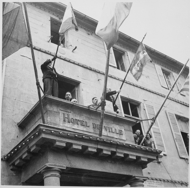 La salle des délibérations conserve une cheminée monumentale sculptée des XVe–XVIe siècles, provenant de l’abbaye Notre‑Dame du Vœu, classée au titre des objets aux monuments historiques en 1905. Cette cheminée, issue du logis abbatial démoli par l’armée en 1841, fut démontée, provisoirement exposée dans la cour de l’hôtel de ville, nettoyée en 1852, repeinte en 1857 puis installée dans la grande salle de la bibliothèque en 1858 avant d’être remontée dans la salle des délibérations en 1865 ; elle est datée vers 1500 environ. Le bas‑relief inférieur du manteau porte la crosse et les armes de l’abbaye — parti d’azur et de gueules, au pont à quatre arches d’or sur mer de sinople, accompagné en chef d’une fleur de lys d’or à dextre et d’une tour du même à senestre — ; les parties en retour ont été refaites et un petit fragment sculpté fut arraché lors des bombardements de juillet 1941. La plaque de cheminée, du XIXe siècle, porte les armes de la ville et de l’abbaye.