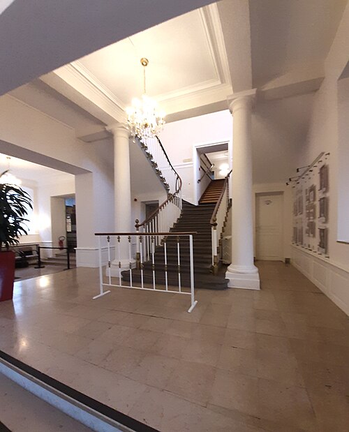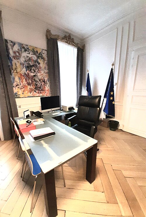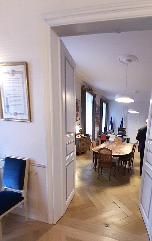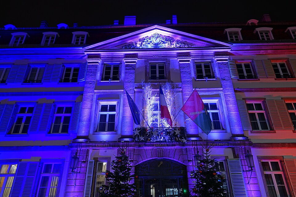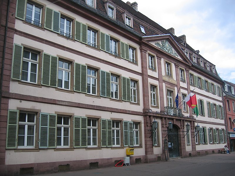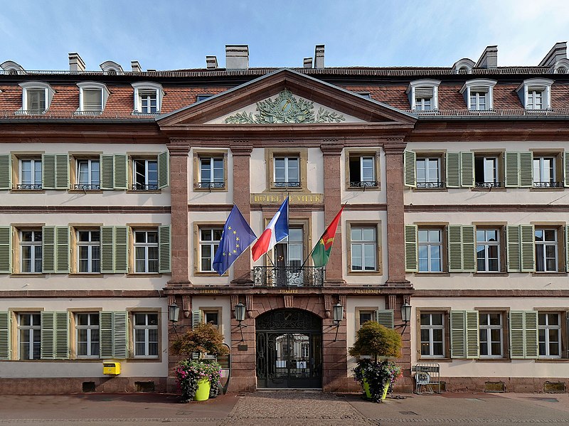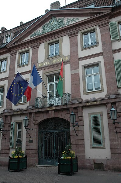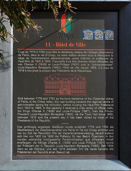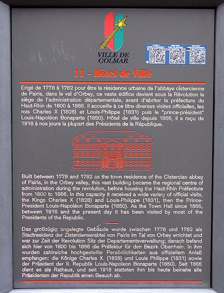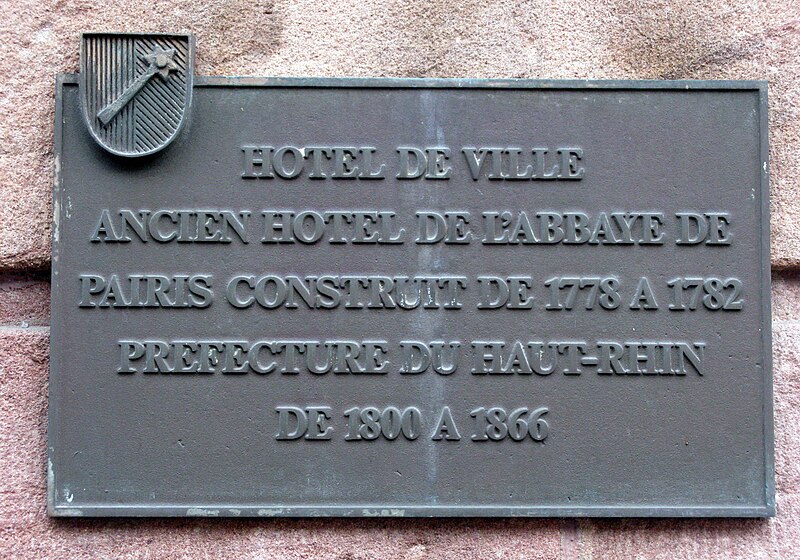 L'hôtel de ville de Colmar, situé 48 rue des Clefs dans le Haut-Rhin, occupe un site investi depuis la seconde moitié du XVIe siècle par la Cour de l'abbaye cistercienne de Pairis. Les anciens bâtiments furent démolis en 1778 et remplacés par l'édifice actuel, construit entre 1779 et 1782 et attribué à l'abbaye de Pairis. Déclaré bien national après 1789, il accueillit l'administration départementale en 1790, la préfecture du Haut-Rhin en 1800 et abrite la mairie depuis 1866. La façade principale est inscrite au titre des monuments historiques depuis le 18 juin 1929. De style néo-classique, le bâtiment présente deux étages surmontés d'une toiture à comble brisé et une façade relativement simple dont le décor se concentre sur l'avant-corps central légèrement en saillie. Au rez-de-chaussée, la porte d'entrée, encadrée de deux fenêtres, est bordée de chaînes de pierres taillées ; un entablement, soutenu par quatre paires de consoles, sépare le rez-de-chaussée du premier étage. Quatre pilastres lisses, pris sur cet entablement, montent jusqu'au sommet des étages et l'avant-corps est couronné d'un fronton triangulaire dont le tympan porte les armes de la Ville, sculptées. Au premier étage, la fenêtre centrale ouvre sur un petit balcon en fer forgé encadré par les pilastres médiaux.