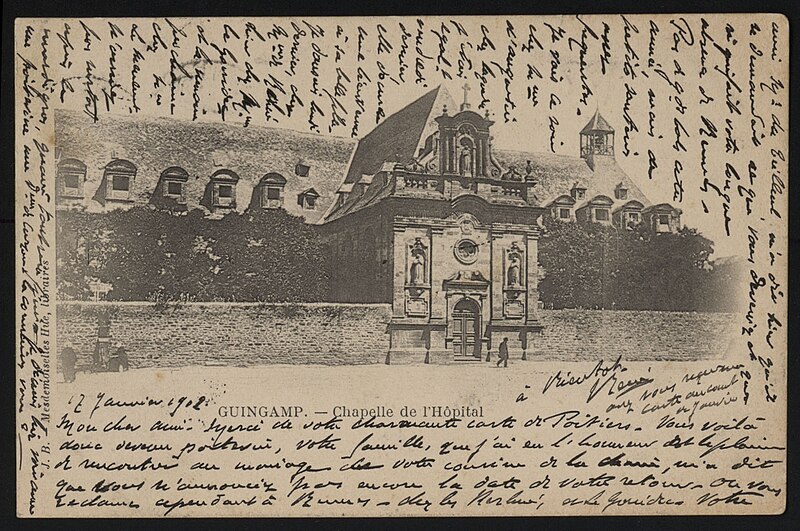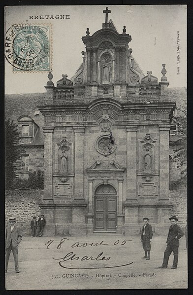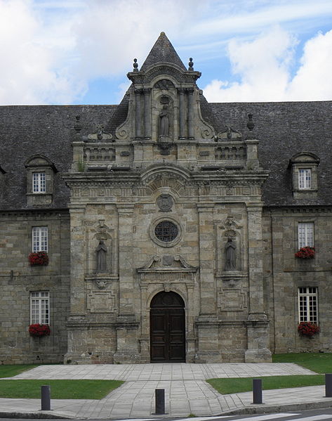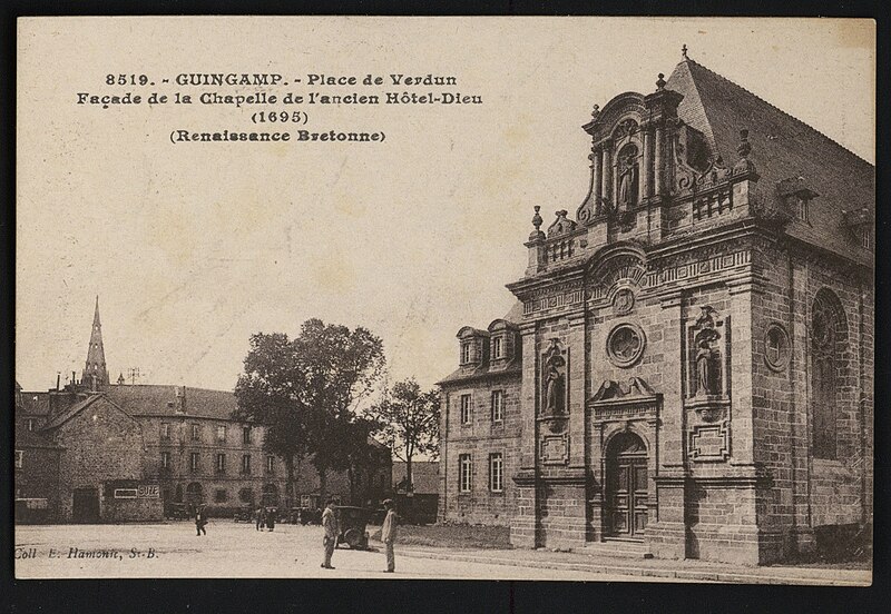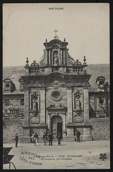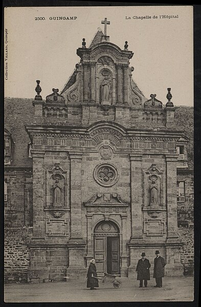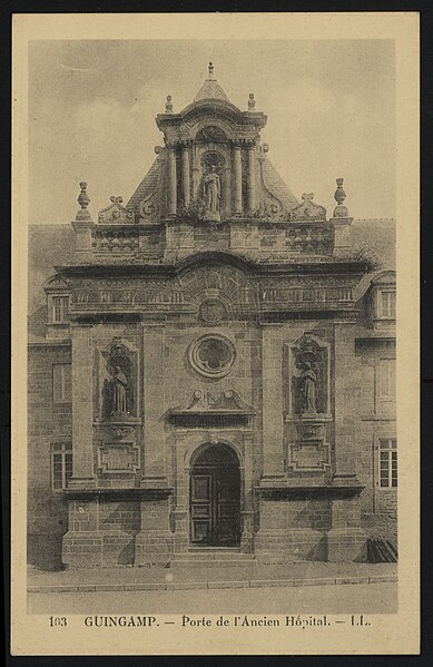 Construit en 1676 pour abriter les religieuses hospitalières arrivées à Guingamp, l'ancien couvent servit d'hôpital jusqu'à la Révolution. À cette période, le bâtiment fut converti en prison et la chapelle transformée en écurie. En 1803, le couvent fut rendu aux religieuses, mais les salles des malades étant en ruine, un nouvel hospice fut édifié. L'édifice fut ensuite racheté par la ville afin d'y installer la mairie. En 1914, les jardins furent aménagés en jardin public.