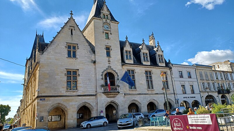 Situé au cœur de la bastide régulière de Libourne (Gironde, Nouvelle-Aquitaine), l'hôtel de ville occupe l'un des angles de la place bordée de quatre galeries couvertes. L'édifice, qui présente un haut pignon flanqué de deux tours, remonte aux XVe ou XVIe siècles et illustre le type de mairie des communes du sud-ouest au Moyen Âge. Les deux tours conservent, sur une partie de leur hauteur, des élévations appartenant à la première moitié du XVIIIe siècle. L'édifice a été remanié au XVIIIe siècle, notamment par l'ajout des tours, puis de nouveau au XXe siècle ; ce dernier chantier lui a donné une apparence néogothique inspirée par Viollet-le-Duc. Classé au titre des monuments historiques par arrêté du 9 septembre 1908, l'hôtel de ville abrite toujours l'administration municipale et accueille au deuxième étage le musée des Beaux-Arts. Plusieurs éléments du mobilier sont également protégés : deux cloches du XVIe siècle (classées en 1905), ainsi que deux tableaux et une sculpture (classés en 1913). On note enfin la présence d'un buste en bronze de Robert Boulin, ancien maire de Libourne.