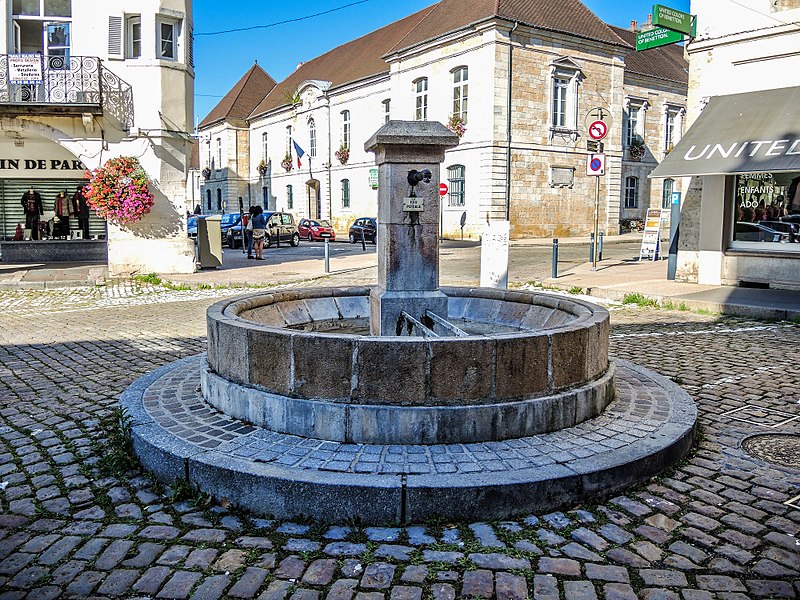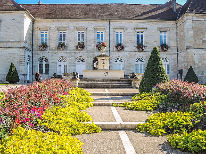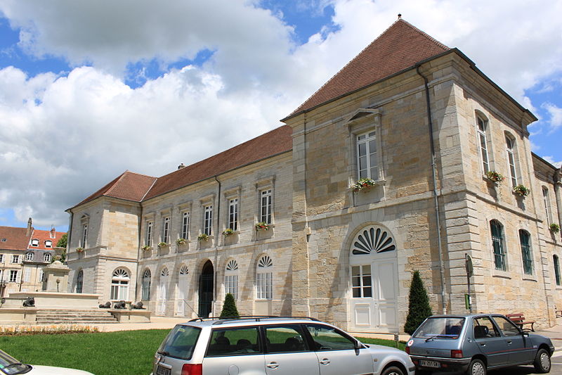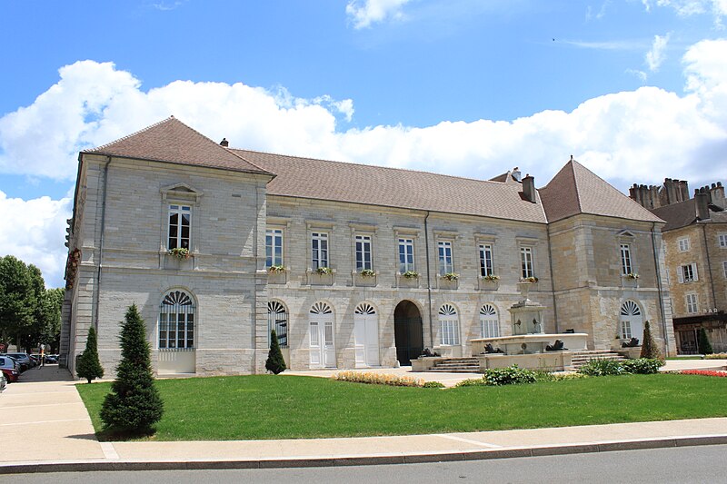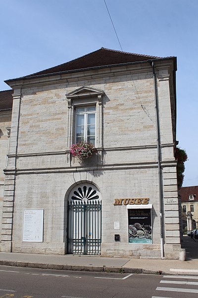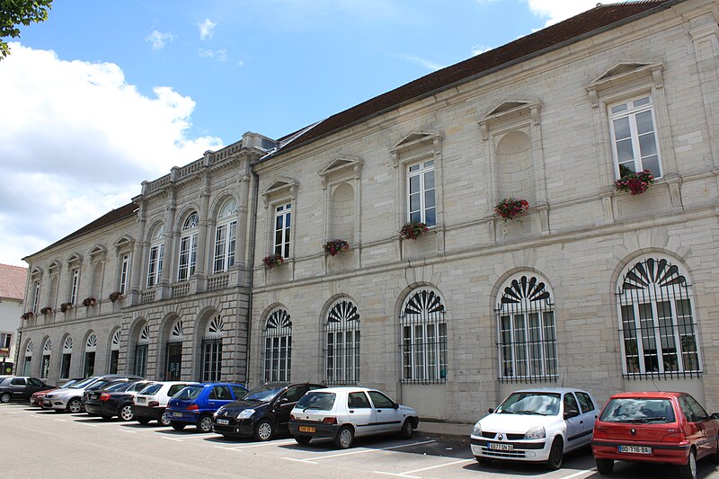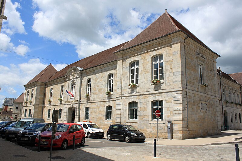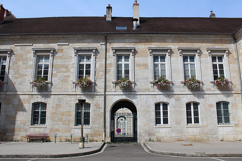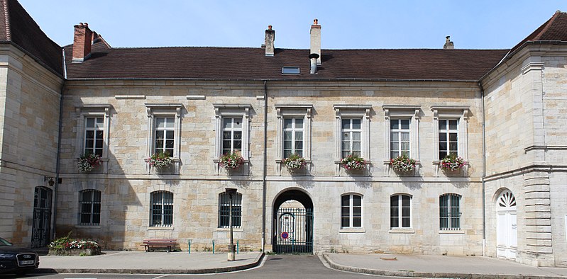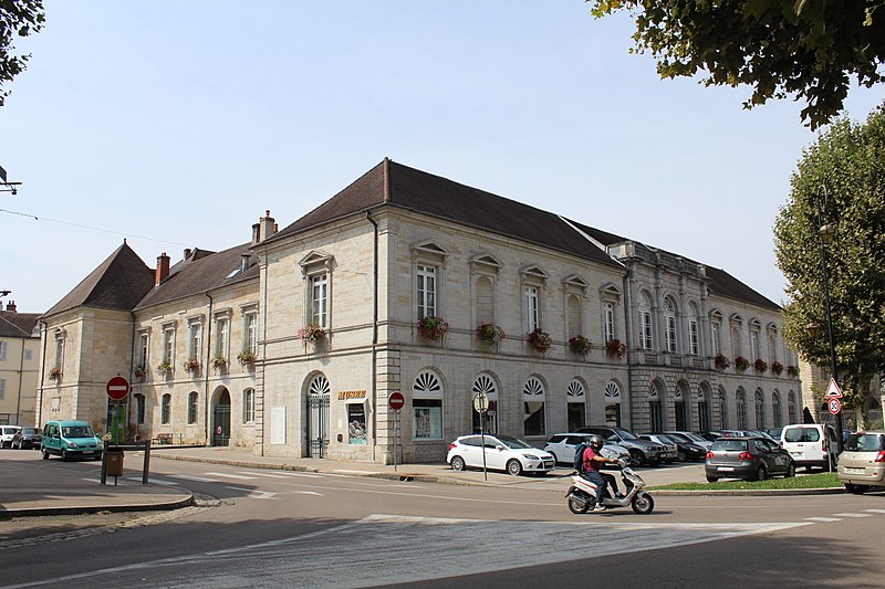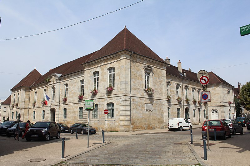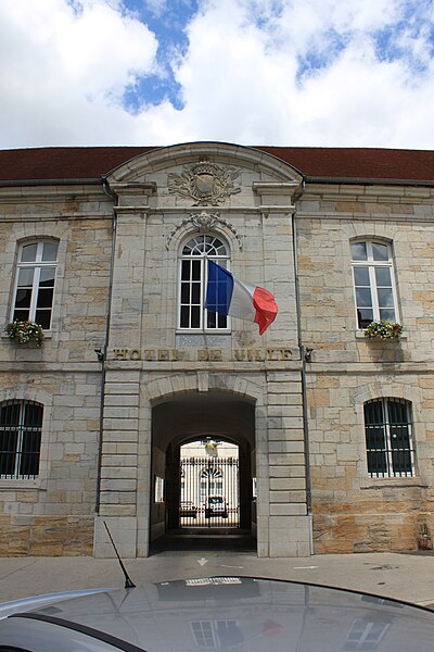 L'hôtel de ville actuel succède au premier hôtel de ville construit en 1680 ; en 1733 fut autorisé l'établissement d'un nouvel hôtel de ville, avec tribunal et prisons, sur les ruines de l'ancien château des Chalon. Les plans et les travaux s'échelonnent entre 1735 et 1746 ; l'ingénieur Jean‑François de l'Egoutaille et l'architecte Jean‑Pierre Galezot y sont associés, Jean Querret dirigeant les ouvrages à partir de 1737. On y installe la halle aux grains en 1753. L'édifice présente un plan carré autour d'une cour, avec deux pavillons aux angles sud et des avant‑corps latéraux au nord pour les ailes est et ouest. L'aile ouest, reconstruite au XIXe siècle, conserve un grand escalier en pierre à trois volées qui conduit à l'étage. À cet étage se trouvent le bureau du maire, la salle du conseil municipal et la salle d'angle au sud‑ouest, décorées. L'aile ouest garde par ailleurs les lambris de l'ancienne salle du tribunal de commerce et les aménagements du XIXe siècle destinés à la bibliothèque. D'importants travaux d'agrandissement ont été menés de 1845 à 1853 par les architectes Lambert puis Achille Paillot, architecte de la ville. Paillot aménagea la bibliothèque dans l'aile ouest reconstruite, fit établir des halles en demi‑cercle devant cette aile et y logea le musée, une salle pour la bibliothèque municipale et une salle de tribunal ; la halle de cette époque est aujourd'hui détruite.