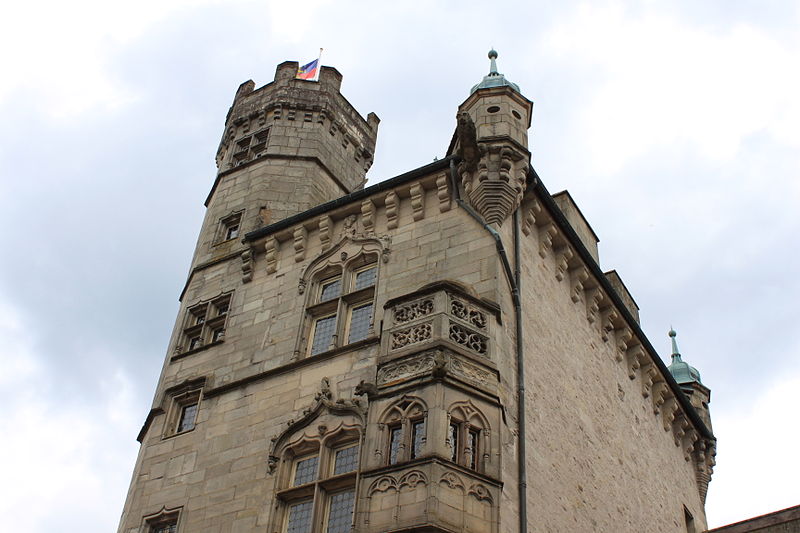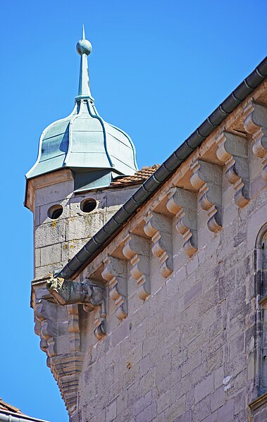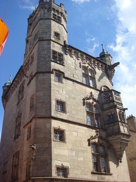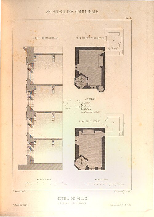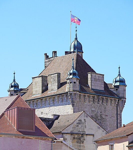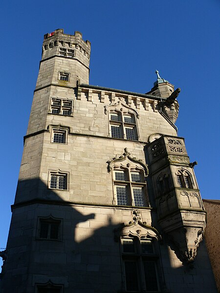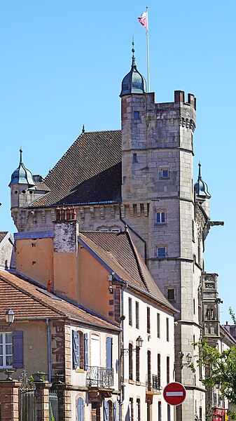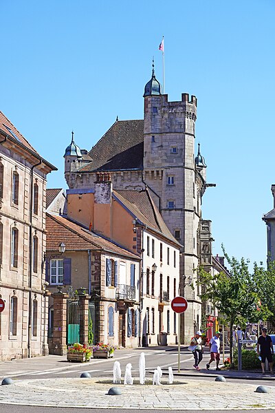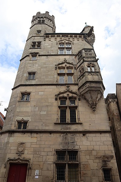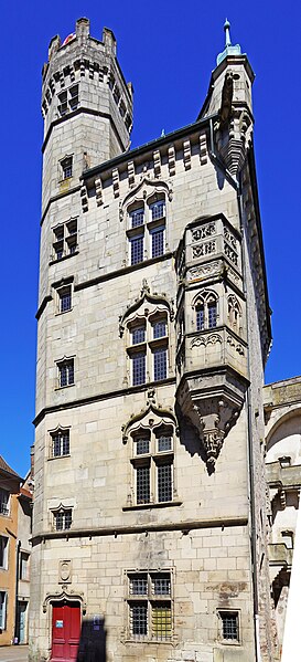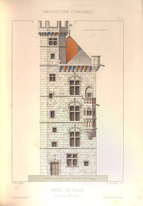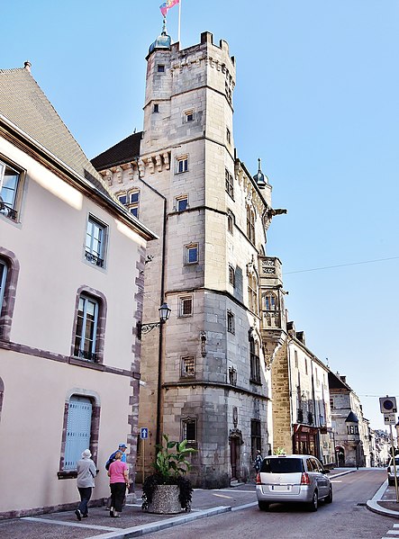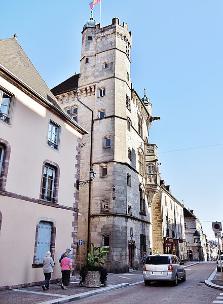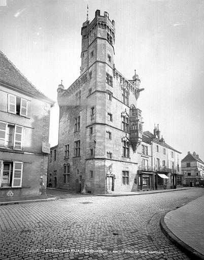 La tour des échevins, appelée aussi Maison carrée, est un édifice du XVe siècle situé rue Victor Genoux à Luxeuil-les-Bains, en face de la Maison du Cardinal Jouffroy. De plan rectangulaire et construite en grès des Vosges, elle compte quatre étages, trois échauguettes et un petit beffroi crénelé de forme octogonale. Un escalier latéral de 146 marches dessert les niveaux et mène au beffroi dont le sommet, à 33 mètres de hauteur, offre une vue sur les Vosges, le Jura et les Alpes suisses. La façade présente des fenêtres à meneaux ornées d’archivoltes gothiques aux motifs floraux et un oriel gothique flamboyant à trois baies surmontées d’arcades ogivales ; la console de l’oriel est sculptée de visages humains et de figures animales, tandis qu’une gargouille d’angle le surplombe. Au‑dessus des fenêtres, des phylactères portent des paroles de l’Ave Maria. L’édifice a été bâti dans la deuxième moitié du XVe siècle par Henri, fils de Perrin Jouffoy et frère du cardinal Jean Jouffroy, et porta d’abord les noms de Tour de Jouffroy et de Maison carrée ; son appellation actuelle provient du titre des élus municipaux, les échevins. Louée à l’origine, la tour fut acquise en 1552 par les notables de Luxeuil pour servir d’hôtel de ville. Le 22 janvier 1673, le conseil municipal décida de rassembler les antiquités trouvées sur le territoire et de les déposer à l’hôtel de ville, date qui est considérée comme celle de la création du musée. Après avoir servi de prison civile, de local d’archives et de bibliothèque, la tour abrite depuis 1865 le musée municipal d’Art, d’Histoire et d’Archéologie. L’édifice est classé au titre des monuments historiques depuis 1862. Le musée, l’un des plus anciens de France, réunit principalement des collections d’archéologie et de peinture liées à la ville et à ses environs. Ces collections furent regroupées en 1947 dans l’établissement thermal avant d’être transférées dans la tour en 1965, puis enrichies par le legs du peintre luxovien Jules Adler (1865-1952). Au rez-de-chaussée sont exposées des statuettes étrusques des Ve–IVe siècles av. J.-C., des ex-voto gaulois et des stèles gallo‑romaines provenant de l’ancienne cité de Luxovium. Le premier étage est consacré à la céramique luxovienne, le second accueille les expositions temporaires, et les troisième et quatrième étages présentent des peintures de Jules Adler ainsi que des œuvres de ses amis et élèves, notamment Paul Élie Dubois (1896-1981), Georges Fréset (1894-1975) et Paul‑Laurent Courtot (1856-1925), ainsi que des pastels d’Édouard Vuillard.