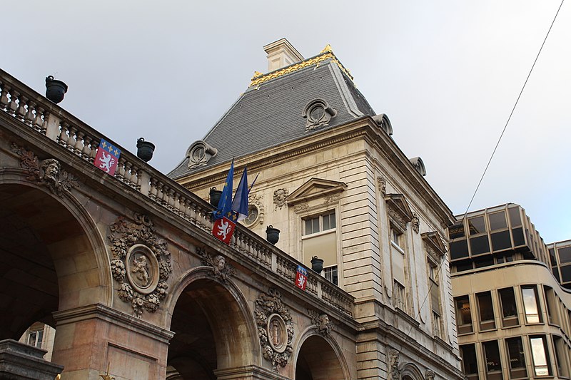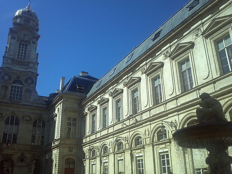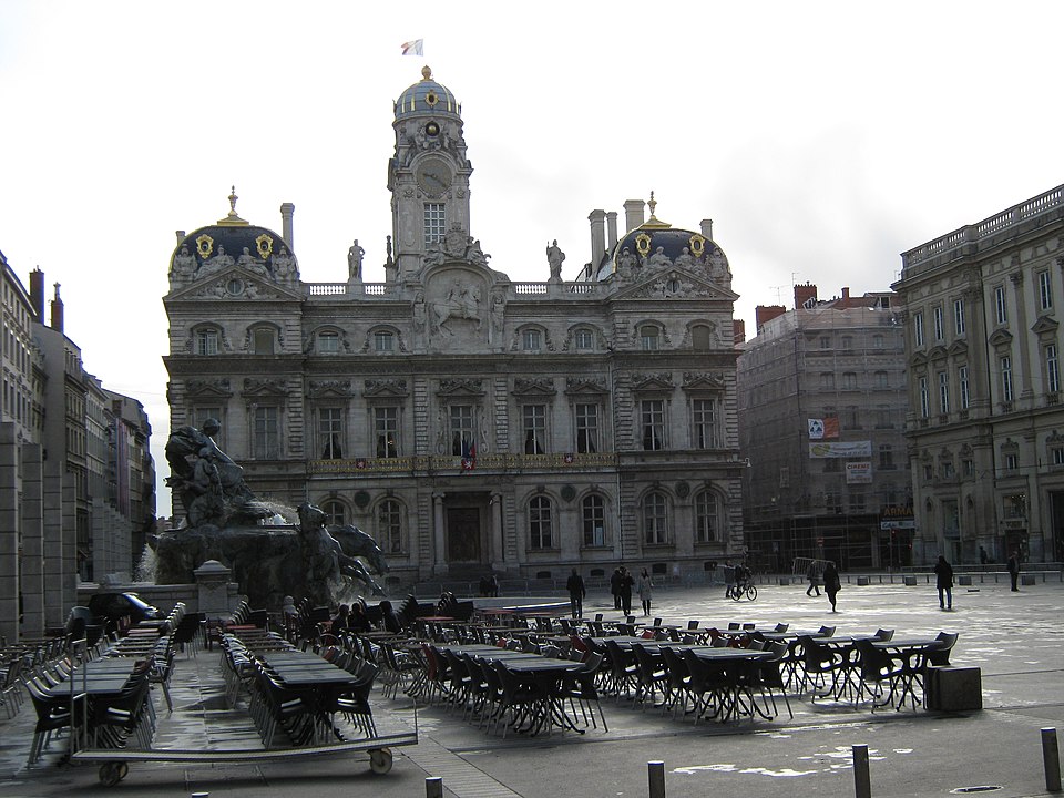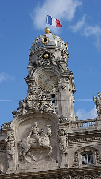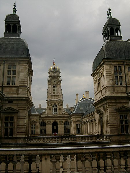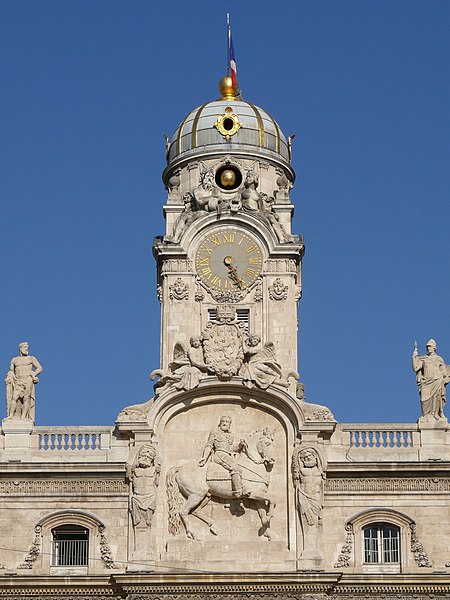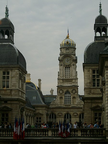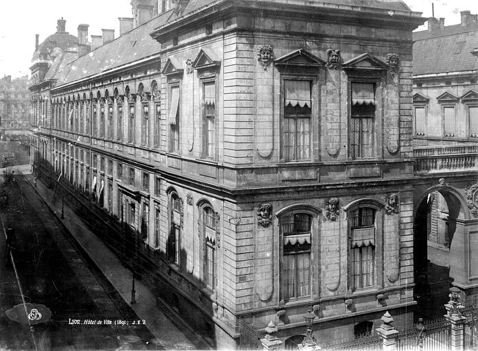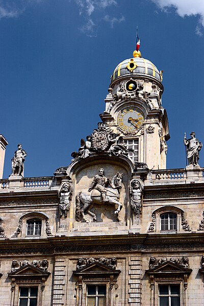 L'hôtel de ville de Lyon, édifice majeur du XVIIe siècle situé au 1 place de la Comédie dans le 1er arrondissement et faisant face à l'Opéra, est classé monument historique depuis le 12 juillet 1886 et accueille aujourd'hui le conseil municipal dix fois par an. Alors que la Presqu'île devient le centre-ville, le Consulat juge l'ancien hôtel de la Couronne trop exigu et vend ce bâtiment pour financer la construction d'un nouvel hôtel de ville. Les plans sont confiés à Simon Maupin en 1646 ; il consulte Jacques Lemercier à Paris et s'appuie sur Girard Desargues, auquel on attribue notamment deux escaliers. La première pierre est posée le 5 septembre 1646 et les travaux, marqués par des difficultés financières et des malfaçons, s'achèvent en 1672 après vingt-six ans de chantier. Thomas Blanchet, arrivé de Rome, est chargé à partir de 1655 des décors intérieurs : il réalise l'escalier d'honneur, le décor de la Grande Salle, le salon de la Conservation et le Salon de la Nomination entre 1661 et 1671. La pierre de construction provient de plusieurs carrières : Villebois, Seyssel, Cleyssy et Saint‑Cyr. Malgré sa splendeur, l'édifice est frappé par un incendie le 13 septembre 1674 qui détruit la Grande Salle et la chapelle et endommage le beffroi, les combles, l'escalier d'honneur, les archives et le Salon Henri IV. Le manque de fonds retarde les réparations ; Thomas Blanchet propose des projets de restauration en 1677, mais les travaux restent insuffisants et ses dessins auraient inspiré des interventions ultérieures de Mansart. Une campagne de restauration est finalement décidée en 1699 et conduite entre 1701 et 1703 selon des projets de Jules Hardouin‑Mansart et de Robert de Cotte pour réparer et moderniser l'édifice. L'hôtel de ville subit d'autres épreuves : bombardements en 1793 pendant la Révolution, un nouvel incendie le 14 juillet 1803 et des restaurations importantes à partir de 1850 sous la direction de Louis Cécile Flacheron, puis Tony Desjardins, ce dernier supervisant la restauration générale de 1854 à 1866 avec la collaboration de sculpteurs tels que Guillaume Bonnet et Joseph‑Hugues Fabisch. L'édifice a également une vie politique intense : pris d'assaut pendant la Commune de Lyon, il voit depuis son balcon la proclamation d'un Comité de salut public, et le 14 septembre 1944 le général de Gaulle y prononce un discours devant la place des Terreaux. L'organisation intérieure présente deux cours successives reliées par une galerie d'entrée et une arcade ; la cour d'honneur abrite un nymphée, une fontaine d'Amphitrite par Charles‑François Bailly et plusieurs statues du XIXe siècle — Neptune, Galatée, Polyphème et une Naïade — réalisées par divers artistes et remplacées au XIXe siècle par des exemplaires en pierre de Tarascon inspirés des originaux. L'escalier d'honneur, décoré par Thomas Blanchet entre 1658 et 1667, est remarquable par une iconographie évoquant le grand incendie de Lugdunum sous Néron, tandis que l'escalier ovale à puits central dit des Archives est attribué à Girard Desargues. Au premier étage, le bureau du maire, situé sur la façade est, est habillé de soieries, boiseries et emblèmes et orné de peintures de Louis Janmot et Joanny Domer ; la salle des anciennes archives, seule salle voûtée du premier étage, possède une cheminée monumentale de Nicolas Lefebvre datant de 1652 et des lustres hollandais. Le Salon de la Conservation porte un plafond peint par Blanchet en 1669 dont le médaillon central représente La chute des Vices, entouré de quatre médaillons consacrés à la Distinction du Bien et du Mal, la Sincérité, la Sagesse et le Génie de Lyon, rappelant la fonction juridictionnelle que tenait alors l'Hôtel de Ville pour les litiges du négoce. Le Salon du Consulat et le Salon Henri‑IV, salles de nomination et d'administration consulaire, témoignent du rôle des consuls ; la Grande Salle des fêtes, desservie par l'escalier d'honneur et longue de vingt‑six mètres sur douze mètres cinquante, a perdu ses décors d'origine lors de l'incendie de 1674 ; son modello de plafond est conservé au Musée des Beaux‑Arts de Lyon et les dessins des décors muraux au Nationalmuseum de Stockholm. Les salons dits « rouges » et la salle des armoiries conservent des éléments illustrant l'histoire du commerce lyonnais, notamment des médaillons sur la production de la soie et des armoiries remplaçant les portraits d'échevins détruits par l'incendie. Le beffroi, doté d'une horloge lunaire, abrite un carillon important : inauguré en 1919 par Édouard Herriot avec vingt‑neuf cloches, il compte depuis l'an 2000 soixante‑cinq cloches ; plusieurs cloches anciennes subsistent et le carillon est l'un des plus notables de France. L'hôtel de ville a inspiré et figuré dans des œuvres visuelles et cinématographiques ; il est accessible par la station de métro Hôtel de Ville - Louis Pradel.