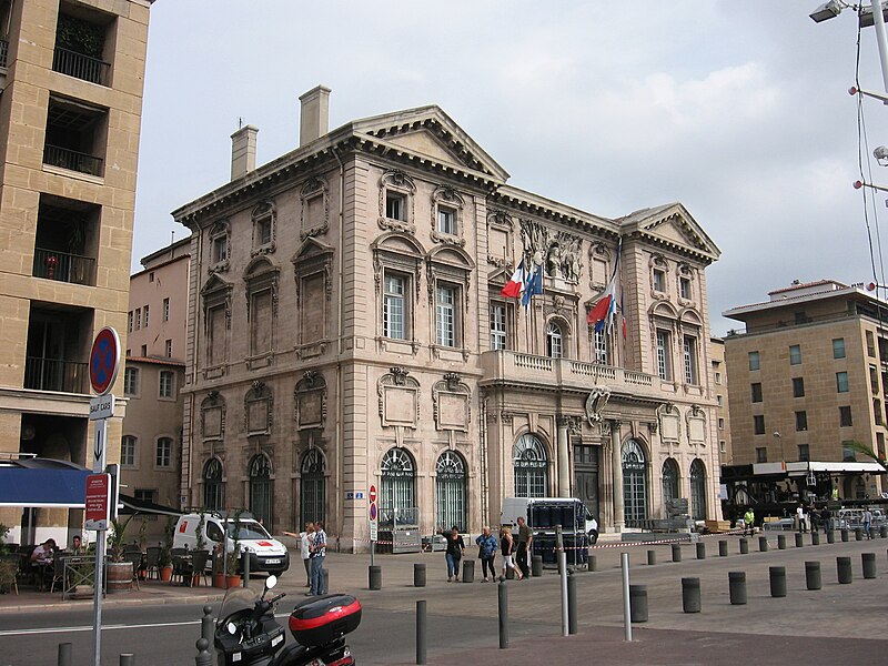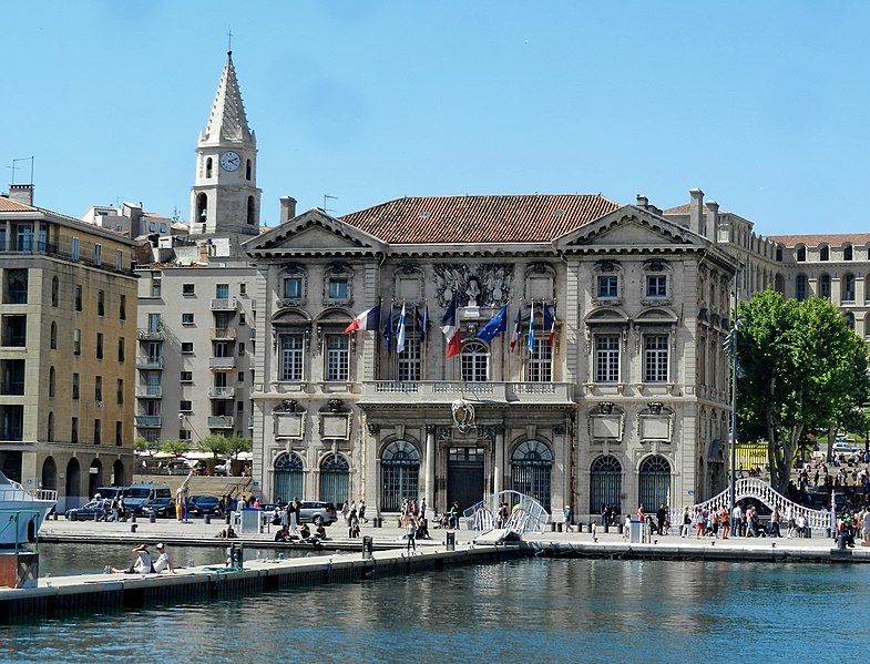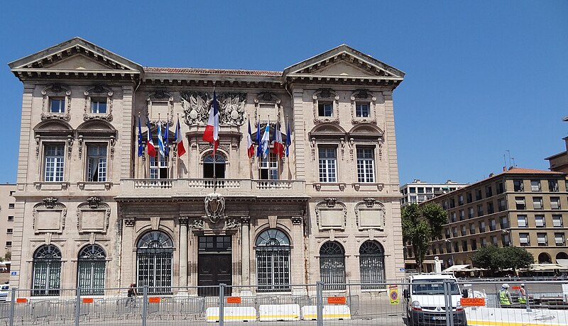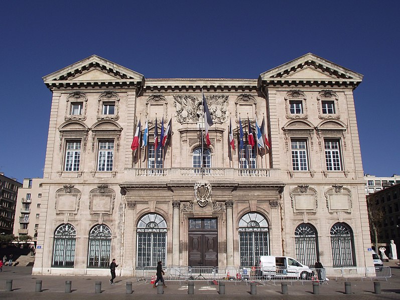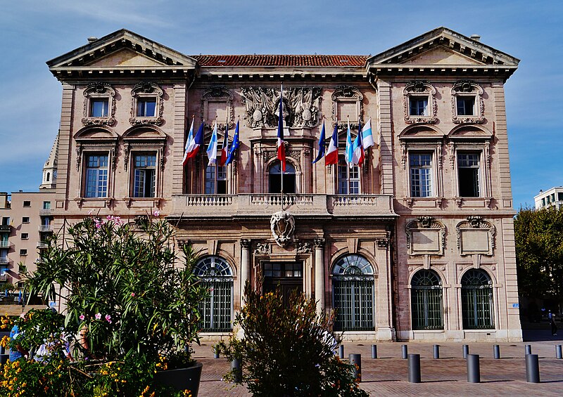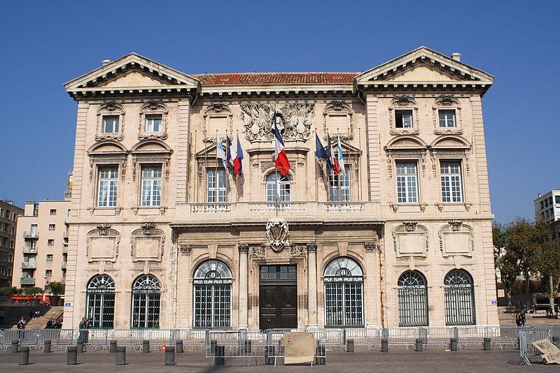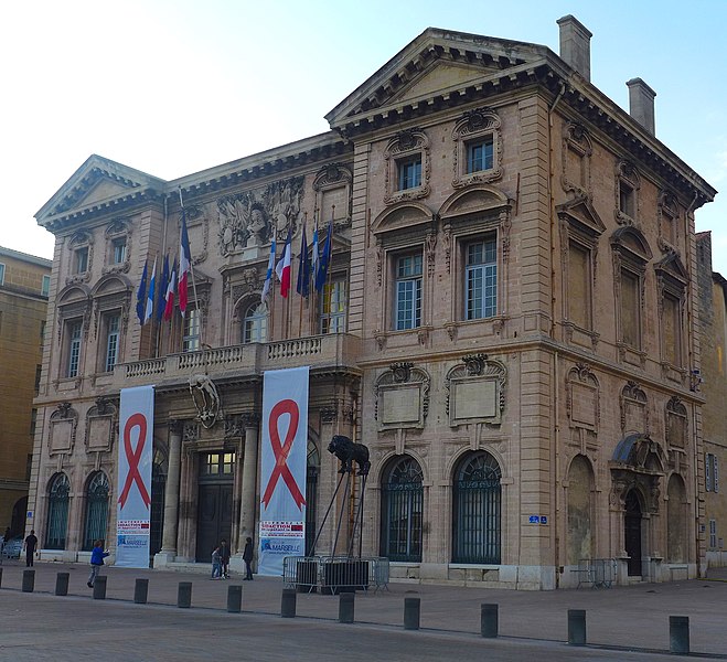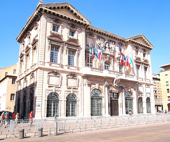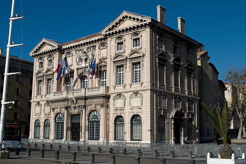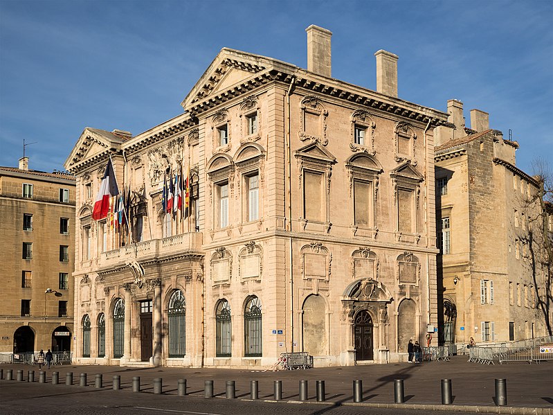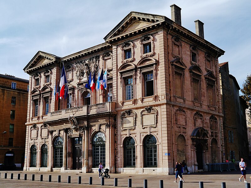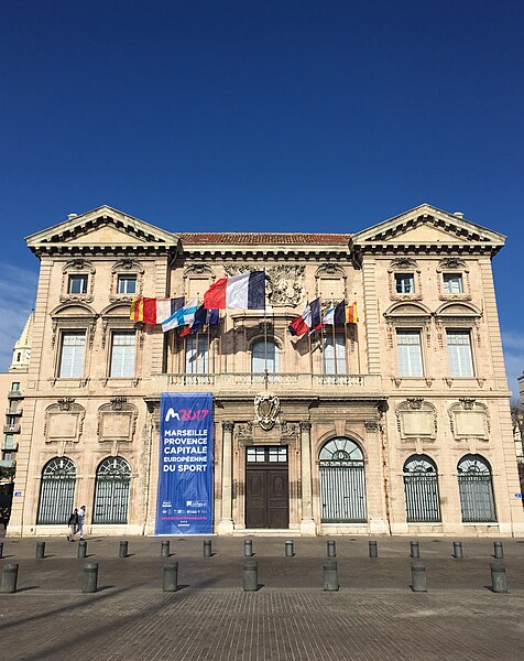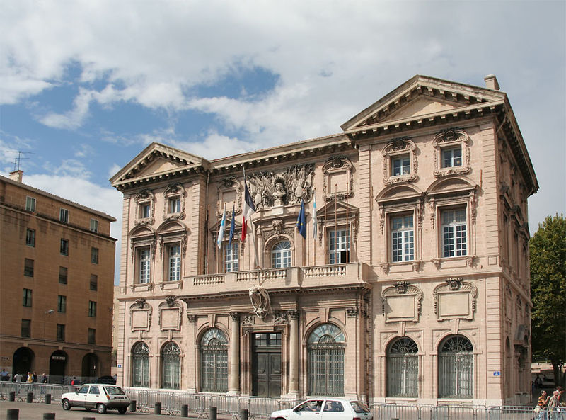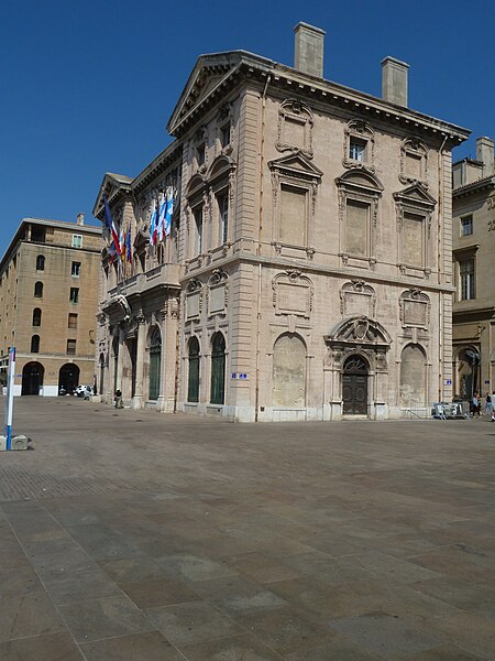 L'hôtel de ville de Marseille, situé quai du Port dans le 2e arrondissement, est un immeuble du XVIIe siècle qui abrite le bureau du maire. Il présente une particularité rare : l'accès du rez-de-chaussée au premier étage ne se fait pas depuis le bâtiment principal mais par l'immeuble situé derrière, les deux constructions étant à l'origine reliées par un pont suspendu couvert en bois. Cette organisation résultait de la réserve du rez-de-chaussée à la « loge » des marchands, comme l'évoque la rue de la Loge qui sépare les deux bâtiments. Le pont en bois a été remplacé par une galerie en pierre conçue par Esprit-Joseph Brun, réalisée entre 1782 et 1786. L'attribution des plans a fait l'objet de controverses : Pierre Puget n'aurait, selon plusieurs sources, sculpté que l'écusson aux armes de France, tandis qu'un architecte italien anonyme est parfois cité pour l'inspiration générale. Les sculptures de la façade sont l'œuvre notamment de François et Mathieu Pourtal, Martinet, Levaquery et Martin Grosfils ; l'écusson original exécuté par Pierre Puget se trouve aujourd'hui au musée des Beaux-Arts, remplacé sur la façade par une copie réalisée par Stanislas Clastrier.