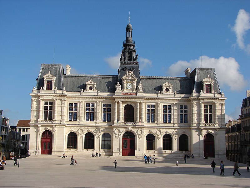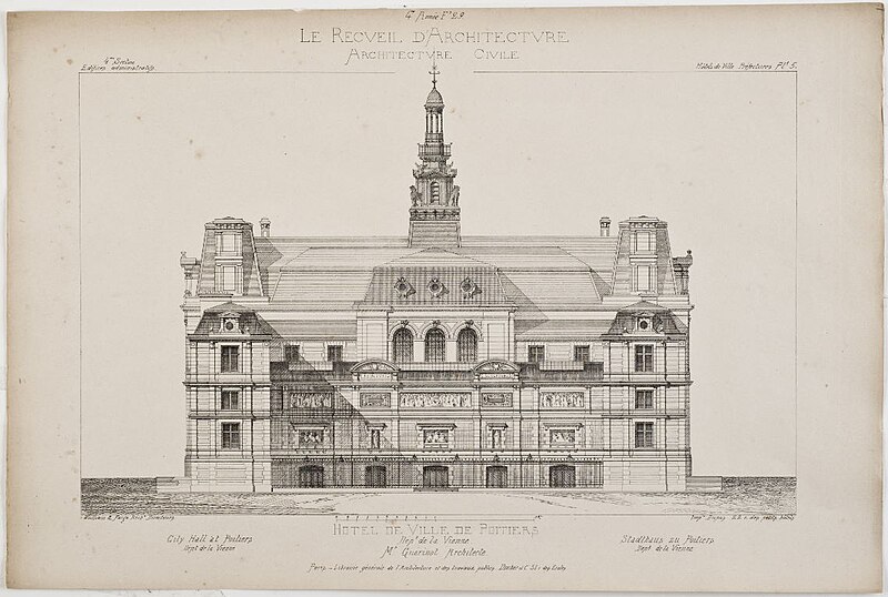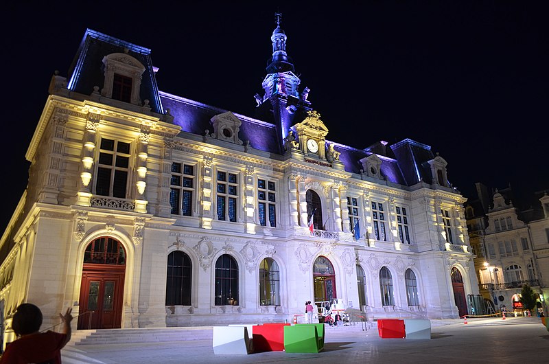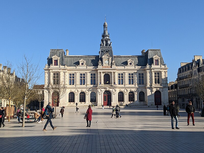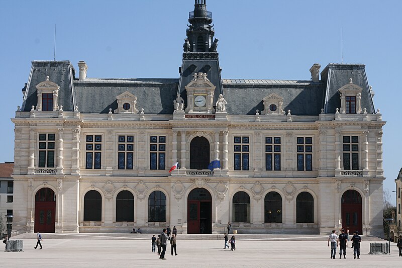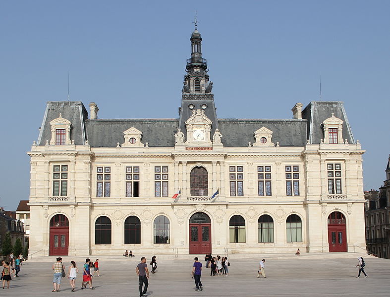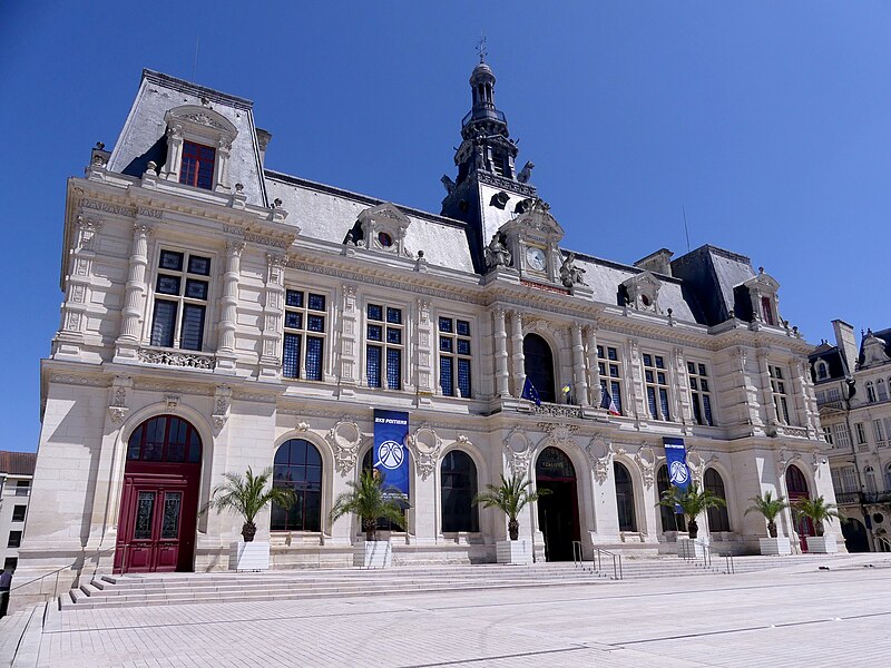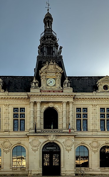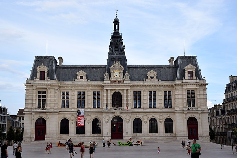 L'hôtel de ville de Poitiers, édifié entre 1869 et 1875, est un édifice municipal de style Second Empire situé sur la place du Maréchal-Leclerc, ancienne place d'Armes. Il conclut un vaste projet d'urbanisation du centre-ville lancé après l'arrivée du train en 1851 et la construction de la préfecture entre 1864 et 1869. Un large boulevard d'inspiration haussmannienne, l'actuelle rue Victor-Hugo, relie la préfecture à la place d'Armes et ouvre la perspective sur le nouvel hôtel de ville. Conçu par l'architecte Antoine-Gaëtan Guérinot, le bâtiment remplaça l'ancien hôtel de ville installé à l'échevinage; les travaux, commencés en 1869 et interrompus par la guerre de 1870, s'achevèrent en 1875. Par arrêté du 29 octobre 1975, les façades, les toitures et le grand escalier ont été inscrits au titre des monuments historiques. Faute de financements, les décors prévus ne furent pas entièrement réalisés, mais l'édifice reste un exemple notable du goût Napoléon III et du style néo-renaissance. La façade principale, richement traitée, contraste avec des façades latérales et arrière plus sobres : larges fenêtres à doubles traverses, colonnes et pilastres annelés inspirés de Philibert de l'Orme, rinceaux et guirlandes de fruits renvoyant à la fin du XVIe siècle. L'élévation du rez-de-chaussée rappelle celle de l'Opéra Garnier, construit à la même époque, et plusieurs niches et socles destinés à des médaillons ou sculptures, notamment pour représenter des Poitevins illustres, sont restés vides. Comme chez Garnier, la lisibilité des volumes et des toitures traduit les fonctions intérieures visibles depuis la cour d'honneur : le vestibule desservait autrefois les salles du musée municipal des beaux-arts et l'escalier d'honneur, les salles d'apparat occupent l'étage côté place, et les bureaux se trouvent dans les ailes latérales avec des accès par les pavillons d'angle. L'entrée principale se situe dans le pavillon central, surmontée d'un balcon, d'une fenêtre en plein cintre, de l'horloge publique et d'un campanile ; une frise sous la corniche mêle rinceaux, blason de la ville et lettre P. Le décor sculpté est principalement l'œuvre de Besnard et Mallet ; l'horloge est encadrée par deux allégories, Agriculture et Industrie, de Louis-Ernest Barrias, et le campanile, œuvre d'Auguste-Nicolas Cain, est animé de tigres en plomb et de putti porteurs de flambeaux. Les armoiries de Poitiers — lion d'Aquitaine, fleurs de lys et neuf besants, censés représenter les premiers échevins — se retrouvent partout : frontons, frises, ferronneries, poignées, parquets, peintures et vitraux. L'hôtel de ville abrita également le musée municipal des beaux-arts jusqu'en 1974. Le grand escalier, théâtral, conduit à la loggia et met en scène l'ascension du visiteur ; il est orné de deux cariatides allégoriques de Louis-Ernest Barrias, des bustes des maires Olivier Bourbeau et Arsène Orillard par Pierre-Amédée Brouillet, et d'une rampe sculptée par Besnard et Mallet. Les parois de l'escalier accueillent deux grandes compositions à l'huile de Pierre Puvis de Chavannes représentant saint Fortunat lisant à sainte Radegonde à l'abbaye Sainte-Croix et Charles Martel repoussant les Sarrasins près de Poitiers (1874). La salle des mariages présente un plafond peint par Léon Perrault, Le Triomphe de l'Hyménée (1882), et au-dessus de la cheminée Les époux devant la Loi (1884), du même peintre. Le salon d'honneur, anciennement salle de bal, conserve un parquet marqueté aux armes de la ville, un vitrail d'Auguste Steinheil montrant Aliénor d'Aquitaine confirmant la charte de commune en 1199, et un plafond peint par Jean-Baptiste Brunet représentant Du Guesclin délivrant Poitiers des Anglais (1885). L'ancienne salle du conseil, aujourd'hui salle du blason, porte un plafond peint par Émile Bin figurant la ville de Poitiers personnifiée récompensant le Travail entourée de la Force, de la Justice, de la Charité et de la Paix, flanquée des allégories des rivières La Boivre et Le Clain (1881-1882), ainsi que deux panneaux d'Alfred de Curzon issus d'une série de quatre préparatoires pour les mosaïques de l'Opéra Garnier, relatant des histoires d'amour mythologiques.
