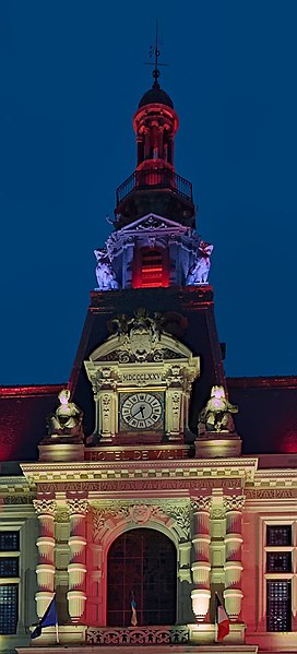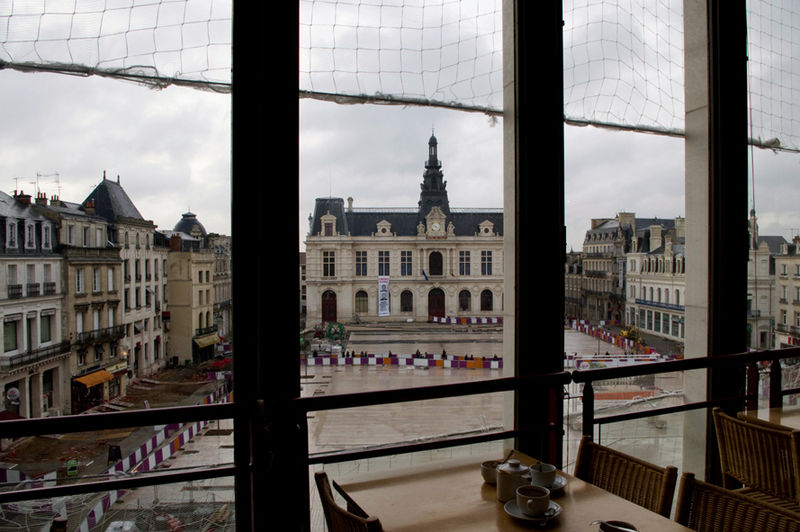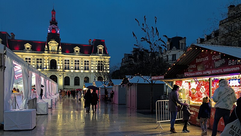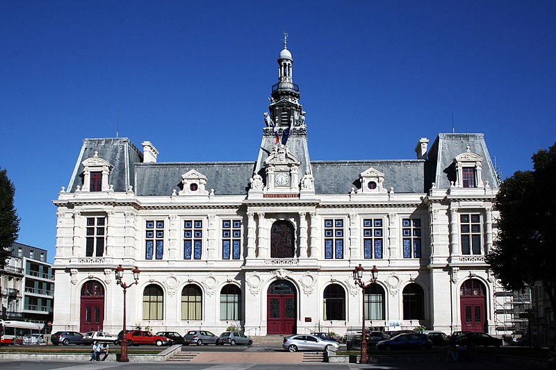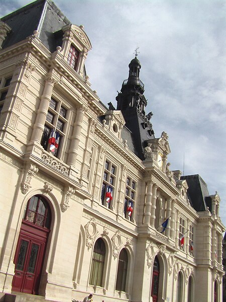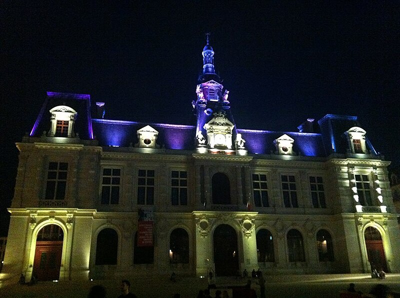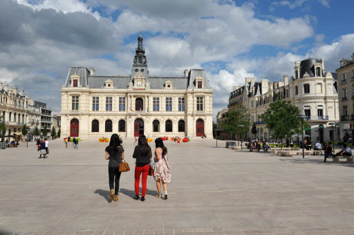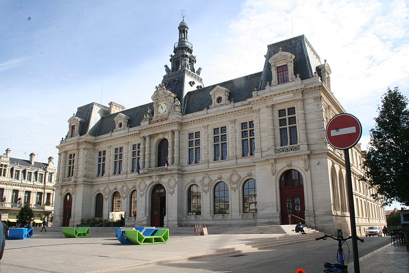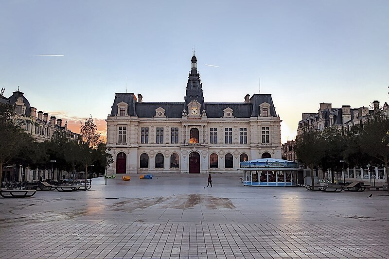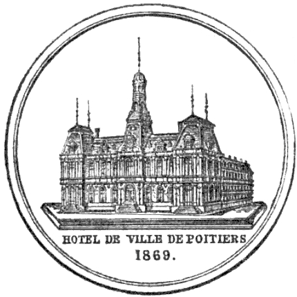 L'hôtel de ville de Poitiers, édifié entre 1869 et 1875, est un édifice municipal de style Second Empire situé sur la place du Maréchal-Leclerc, ancienne place d'Armes. Il conclut un vaste projet d'urbanisation du centre-ville lancé après l'arrivée du train en 1851 et la construction de la préfecture entre 1864 et 1869. Un large boulevard d'inspiration haussmannienne, l'actuelle rue Victor-Hugo, relie la préfecture à la place d'Armes et ouvre la perspective sur le nouvel hôtel de ville. Conçu par l'architecte Antoine-Gaëtan Guérinot, le bâtiment remplaça l'ancien hôtel de ville installé à l'échevinage; les travaux, commencés en 1869 et interrompus par la guerre de 1870, s'achevèrent en 1875. Par arrêté du 29 octobre 1975, les façades, les toitures et le grand escalier ont été inscrits au titre des monuments historiques. Faute de financements, les décors prévus ne furent pas entièrement réalisés, mais l'édifice reste un exemple notable du goût Napoléon III et du style néo-renaissance. La façade principale, richement traitée, contraste avec des façades latérales et arrière plus sobres : larges fenêtres à doubles traverses, colonnes et pilastres annelés inspirés de Philibert de l'Orme, rinceaux et guirlandes de fruits renvoyant à la fin du XVIe siècle. L'élévation du rez-de-chaussée rappelle celle de l'Opéra Garnier, construit à la même époque, et plusieurs niches et socles destinés à des médaillons ou sculptures, notamment pour représenter des Poitevins illustres, sont restés vides. Comme chez Garnier, la lisibilité des volumes et des toitures traduit les fonctions intérieures visibles depuis la cour d'honneur : le vestibule desservait autrefois les salles du musée municipal des beaux-arts et l'escalier d'honneur, les salles d'apparat occupent l'étage côté place, et les bureaux se trouvent dans les ailes latérales avec des accès par les pavillons d'angle. L'entrée principale se situe dans le pavillon central, surmontée d'un balcon, d'une fenêtre en plein cintre, de l'horloge publique et d'un campanile ; une frise sous la corniche mêle rinceaux, blason de la ville et lettre P. Le décor sculpté est principalement l'œuvre de Besnard et Mallet ; l'horloge est encadrée par deux allégories, Agriculture et Industrie, de Louis-Ernest Barrias, et le campanile, œuvre d'Auguste-Nicolas Cain, est animé de tigres en plomb et de putti porteurs de flambeaux. Les armoiries de Poitiers — lion d'Aquitaine, fleurs de lys et neuf besants, censés représenter les premiers échevins — se retrouvent partout : frontons, frises, ferronneries, poignées, parquets, peintures et vitraux. L'hôtel de ville abrita également le musée municipal des beaux-arts jusqu'en 1974. Le grand escalier, théâtral, conduit à la loggia et met en scène l'ascension du visiteur ; il est orné de deux cariatides allégoriques de Louis-Ernest Barrias, des bustes des maires Olivier Bourbeau et Arsène Orillard par Pierre-Amédée Brouillet, et d'une rampe sculptée par Besnard et Mallet. Les parois de l'escalier accueillent deux grandes compositions à l'huile de Pierre Puvis de Chavannes représentant saint Fortunat lisant à sainte Radegonde à l'abbaye Sainte-Croix et Charles Martel repoussant les Sarrasins près de Poitiers (1874). La salle des mariages présente un plafond peint par Léon Perrault, Le Triomphe de l'Hyménée (1882), et au-dessus de la cheminée Les époux devant la Loi (1884), du même peintre. Le salon d'honneur, anciennement salle de bal, conserve un parquet marqueté aux armes de la ville, un vitrail d'Auguste Steinheil montrant Aliénor d'Aquitaine confirmant la charte de commune en 1199, et un plafond peint par Jean-Baptiste Brunet représentant Du Guesclin délivrant Poitiers des Anglais (1885). L'ancienne salle du conseil, aujourd'hui salle du blason, porte un plafond peint par Émile Bin figurant la ville de Poitiers personnifiée récompensant le Travail entourée de la Force, de la Justice, de la Charité et de la Paix, flanquée des allégories des rivières La Boivre et Le Clain (1881-1882), ainsi que deux panneaux d'Alfred de Curzon issus d'une série de quatre préparatoires pour les mosaïques de l'Opéra Garnier, relatant des histoires d'amour mythologiques.